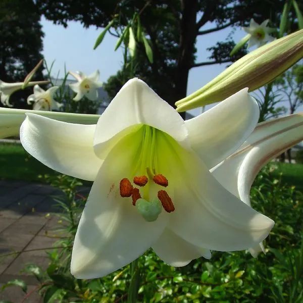 新铁炮百合株高约1.2一15米,茎直立、坚硬。叶为浓绿色,每支花茎着花1一4朵。花色洁白、花瓣较厚,瓶插寿命长。花向上展开,有人称之为“朝天百合”,这种特性利于使用、包装。