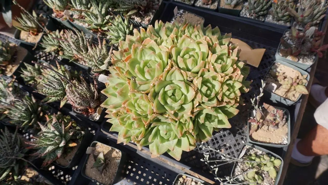 Sun:呃,地理位置大家都也知道嘛,就是南加州的小镇,介于洛杉矶和圣地亚哥之间。加州的气候特别适合多肉,南加州尤甚。Steven所在的小镇不算偏僻,但绝对不是繁华的地方,大爷每天养养花骑骑自行车,生活还是很健康的。Steven的园子里一共有六个温室,通风良好,有一定的遮阴,所有正常生长的花都放在桌子上,没有地栽。