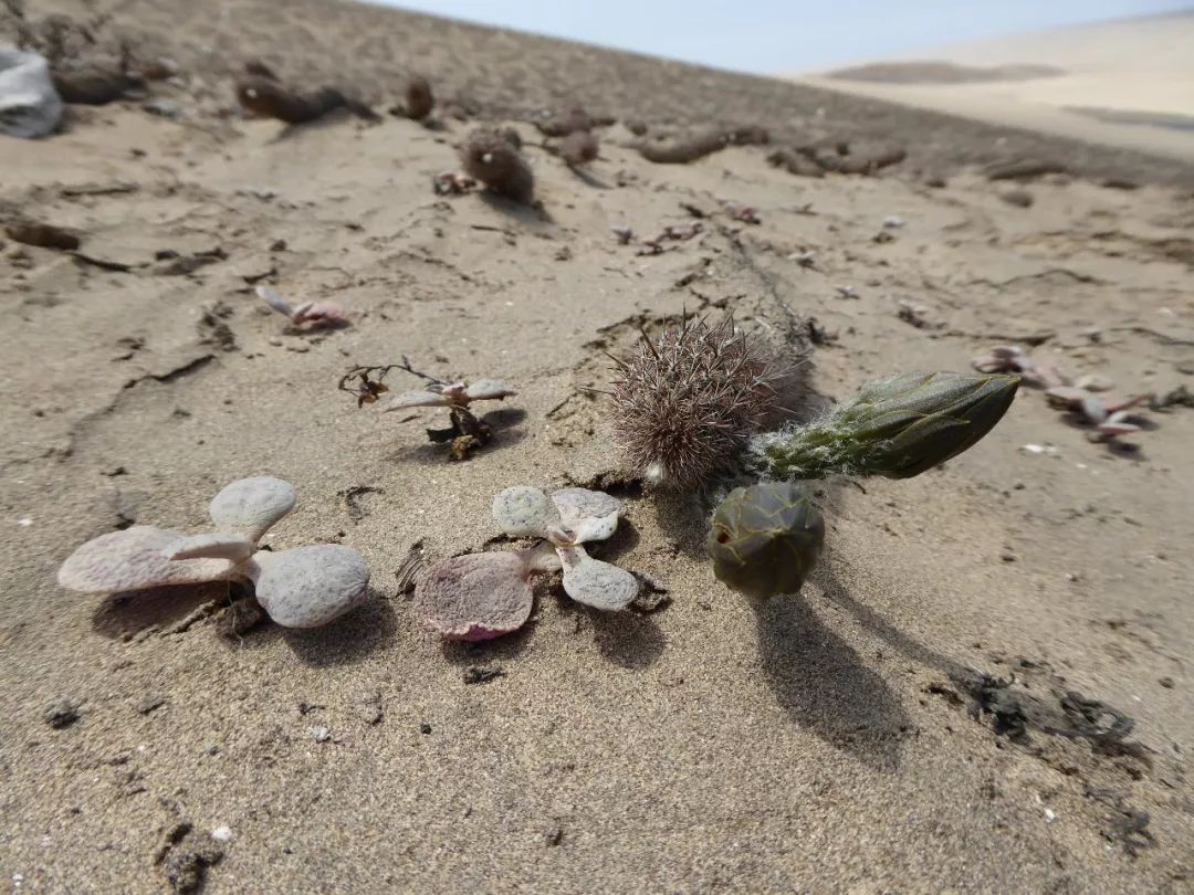 我们继续向北,然后停在了一处我特别喜欢的地方,虽然满眼仍然只有沙石,但我知道,这里离金煌柱属的Haageocereus tenuis居群很近了。我们停下车,带上水壶和相机走向沙漠。不远的路程我们就看到了大片的Haageocereus tenuis,这是我们去年发现的一个大规模居群,我们重点察看了几个新芽的生长情况。这里的仙人掌生长的方向都是远离海洋,这将不利于植物接收来自海洋的潮气,但可以帮助它们免受漂流沙砾的侵害。