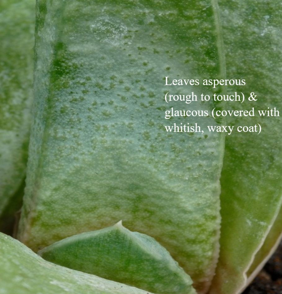 【△Gasteria glauca,叶片表面粗糙(摸起来),并呈现浅灰绿色(被白粉)】