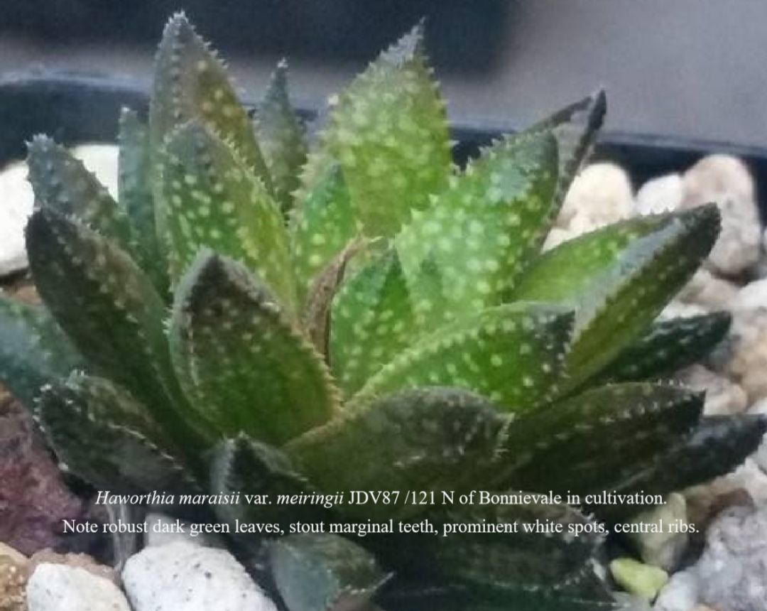 【△Haworthia maraisii var. meiringii,人工种植环境下的JDV87/121,采集自Bonnievale以北,叶片强健,肌色深绿,叶缘刺短粗,白斑突出,背列明显】