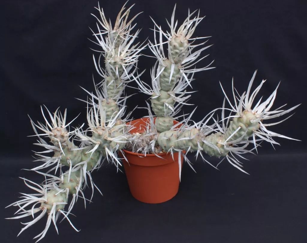 这种白刺型武藏野曾被冠以Opuntia papyracantha和O. diademata这两种较常见的异名,本段下方的图3最初的标签上的拉丁文就是O. papyracantha。形态特征来看,茎段长5-8厘米,或更长,近球形,各个位置的刺座基本都有着生刺,所以从远处看它的刺非常密集。我自己种植了好几盆白刺型武藏野,都是无性繁殖而来的,有一些的茎节直立紧密排列,但大多还是图3这样近匍匐的灌丛株型。图3盆径19厘米,部分枝条包含9-10茎节。和大多是纸刺属、团扇属的植物一样,这种武藏野非常容易从茎节连接处分离,冬季断水期间尤其容易。甚至有时候它会自行断枝,休眠期茎节之间貌合神离,第二年浇水挪动的时候才发现有的茎节已经脱落了,是进行无性繁殖的绝佳素材,而且它们生根容易,基本上摆在填了泥炭的苗盘上就能生根。图4是自然脱落的白刺型武藏野茎节,图5是前几年的自然脱落茎节繁殖出的无性植株。在分布地,武藏野高度依赖这种方式进行无性繁殖。