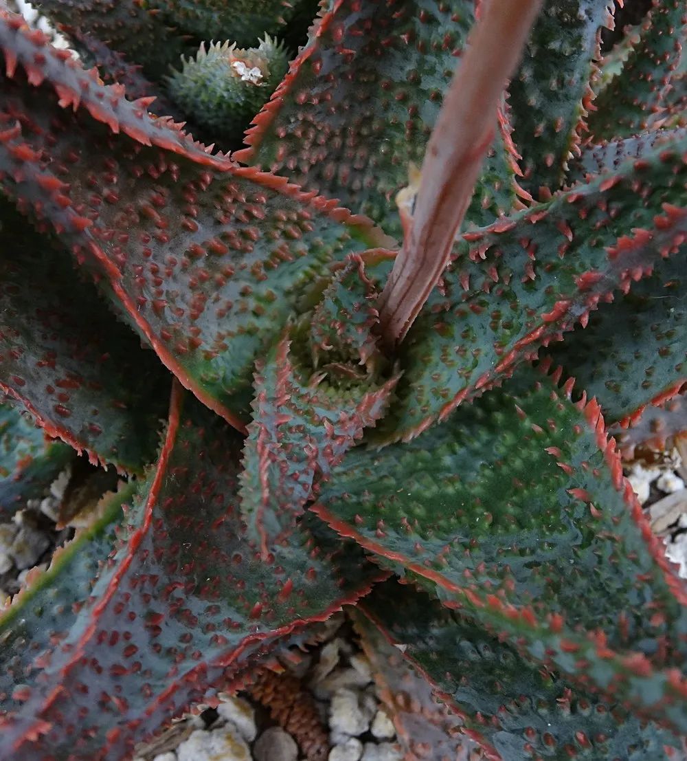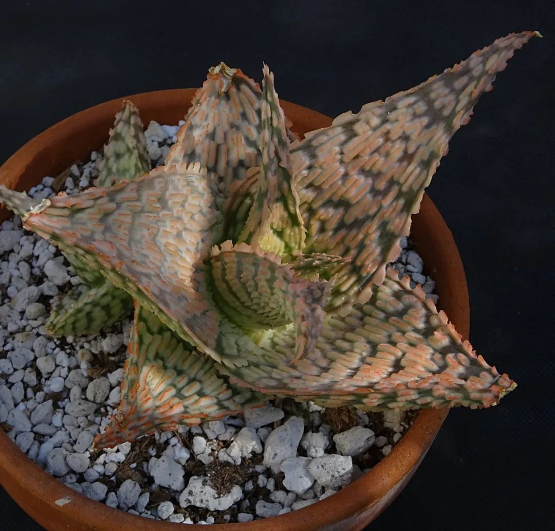 在下方的段落中我们会列出一些目前在北美评价较高的小型芦荟品种,目前来看(译注:本文首发于2018年9月28日),园艺师们对叶疣和齿刺的关注度,或者说育种优先级,逐渐开始高于叶片肌色,其中的原因可能在于疣刺受基因影响较为明显,而肌色则是受环境影响较为明显。换句话说,在光线和温度都很理想的情况下,目前的小型芦荟的肌色都不太差,也就是表现下限比较高,但疣刺则不同,累加程度决定上限。“理想的光线和温度”指的是光照水平较高和大温差,下方的A. cv. “Sunrise(日出)”是一个环境对肌色影响的好例子。