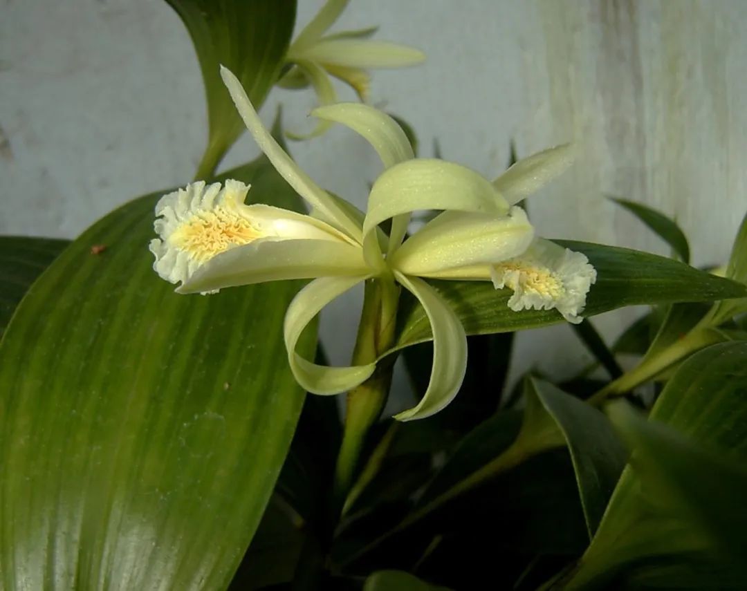 下方的两株箬叶兰来自两个非常优秀的无性系,植株栽培于加州的室内环境。在过去的14个月中,S. andreae(下方第一张图)不论是栽种在我家里的,还是在加州温室里的,都没有开过花。在它本身的产地,哥伦比亚中部,它的花期虽然每一波比较短暂但是总体还算频繁,每几周就群开一次;这株S. callosa(下方第二张图)是比较高大的变型,一般来说S. callosa 会更加矮生,株高45厘米左右,分布于巴拿马,常附生,每茎同时着生2枚花。图2的植株约95厘米高,花的形态也非常别致: