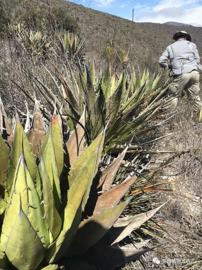 一种可能是ghiesbreghtii(中文名:帝释天)的龙舌兰,位于144号公路边的山上。(后来格雷格指出它们是 horrida ssp. perotensis霍丽达的一个亚种,但这个种群间还混杂了一些ghiesbreghtii,本来这两个品种的一些植株外形就已经非常的相似了,再加上现在混杂在一个栖息地上,想要分辨出它们就难上加难了,最好的区分它们的方法只有通过花色来辨别了。)