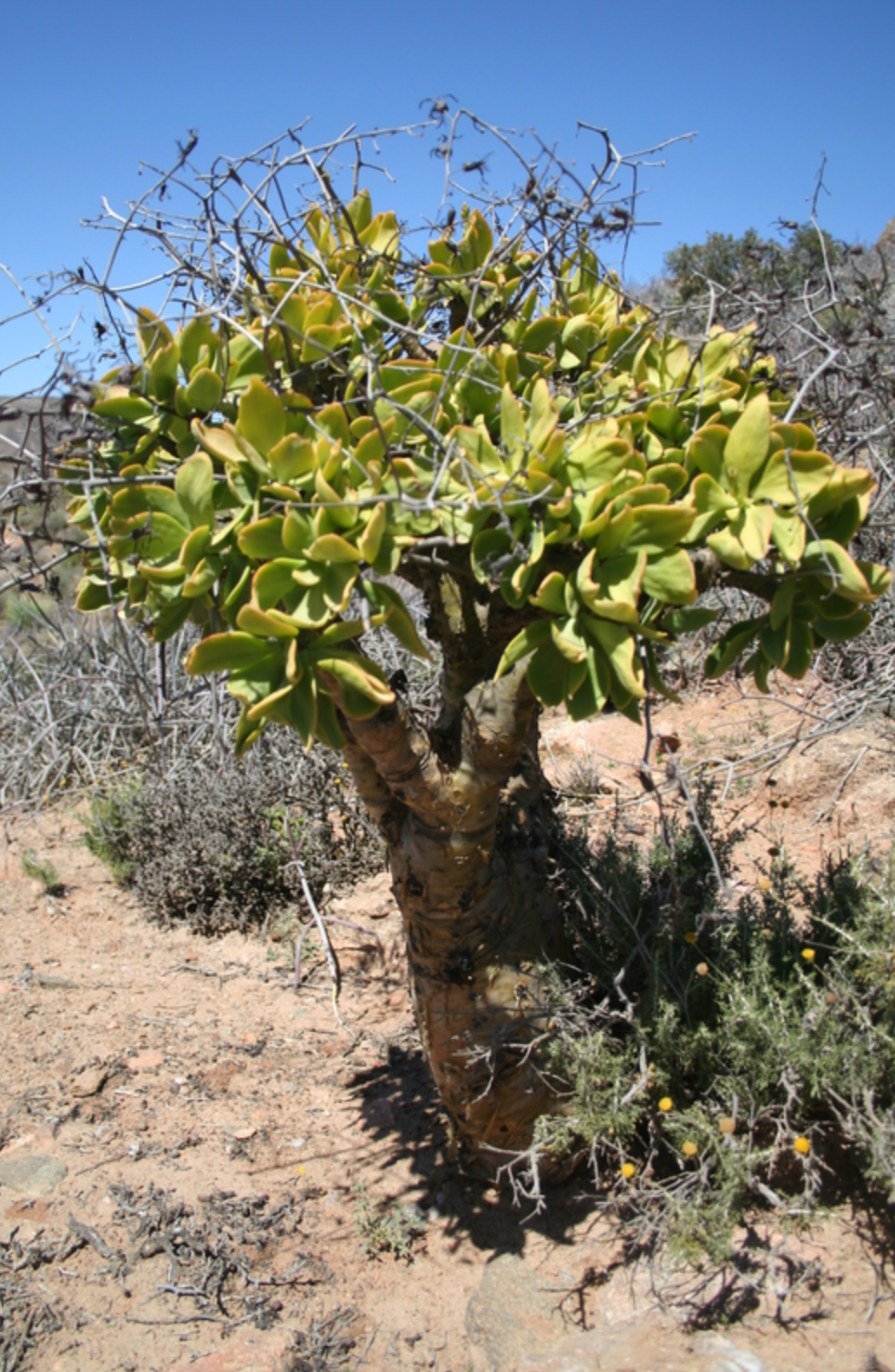 Tylecodon paniculatus 阿房宫——奇峰锦属里的大型品种,株高可达2米,具很粗的肉质茎,在原产地直径可达60厘米。茎杆表面具有易剥落的表皮,黄色。叶肉质,簇生于分枝顶端,叶长5cm。花暗红色。可通过扦插与播种繁殖。养殖中,适当遮阴,春秋季节生长期需要适当的水,夏季断水,这是一个比较耐旱的品种。资料显示冬季需要维持在10℃以上,但也有抵抗低温的记录。