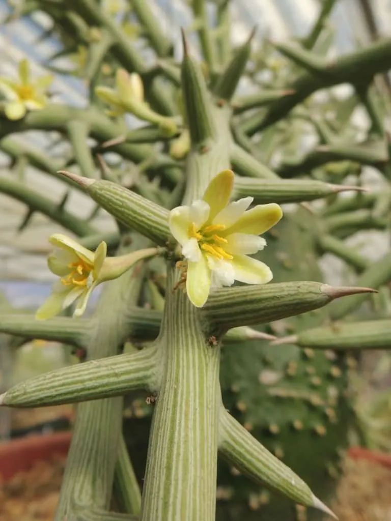 球腺蔓需要长到一定的年龄才会开花,绿奶油花朵。因为是雌雄异株,所以需要有一对儿才能结出果实。不过感兴趣的可以咔嚓枝条扦插玩玩。球腺蔓最好全年都有充足的阳光下养护,当阳光不足时,树枝会变的比较细长,刺的间距也会变宽影响他的秀发,不过问题不大。在夏季可以适当的稀释液态肥,也可以混入少量的缓释肥(比较方便)。