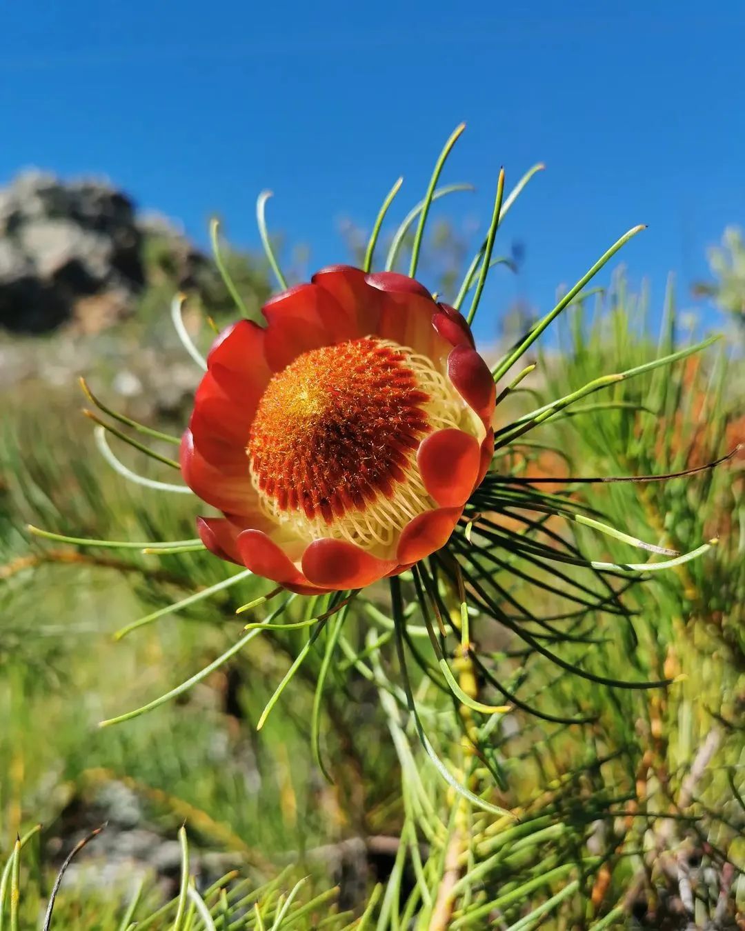 No:4 ▼Protea pityphylla,广泛生长在Ceres山脉的大石块间,这种垂吊的植物有针状的叶子和会“点头”的花,悬挂在地面上。