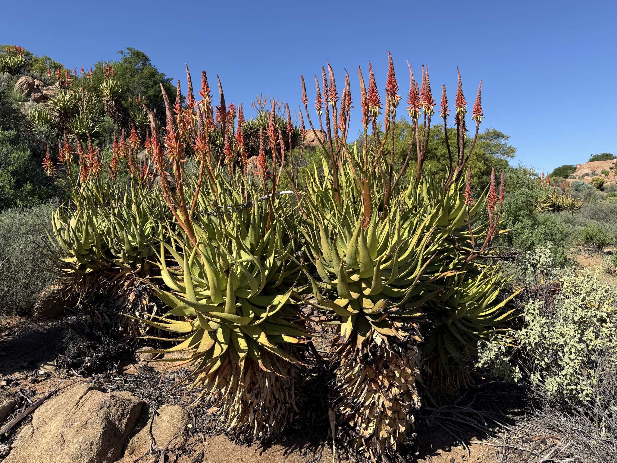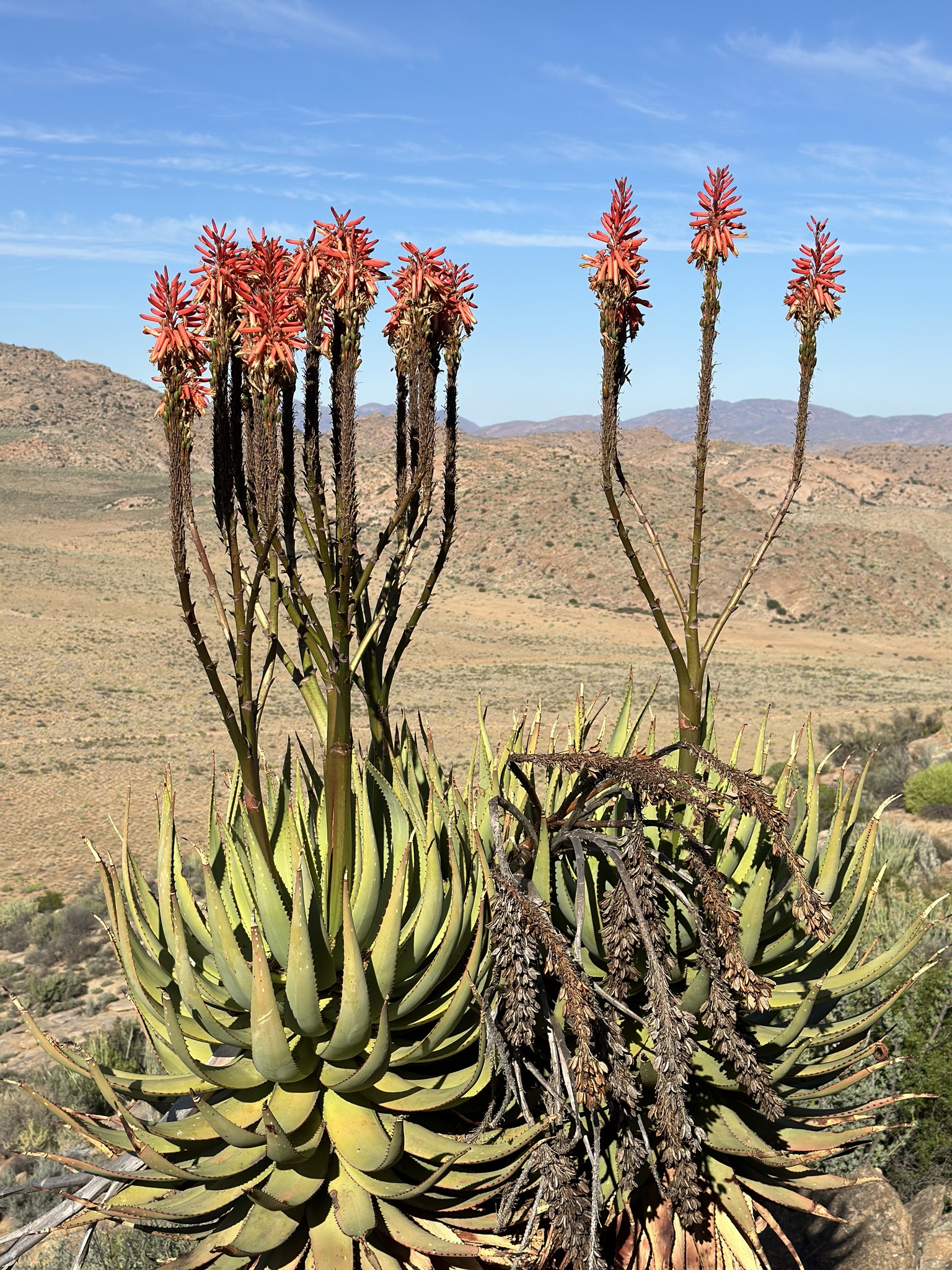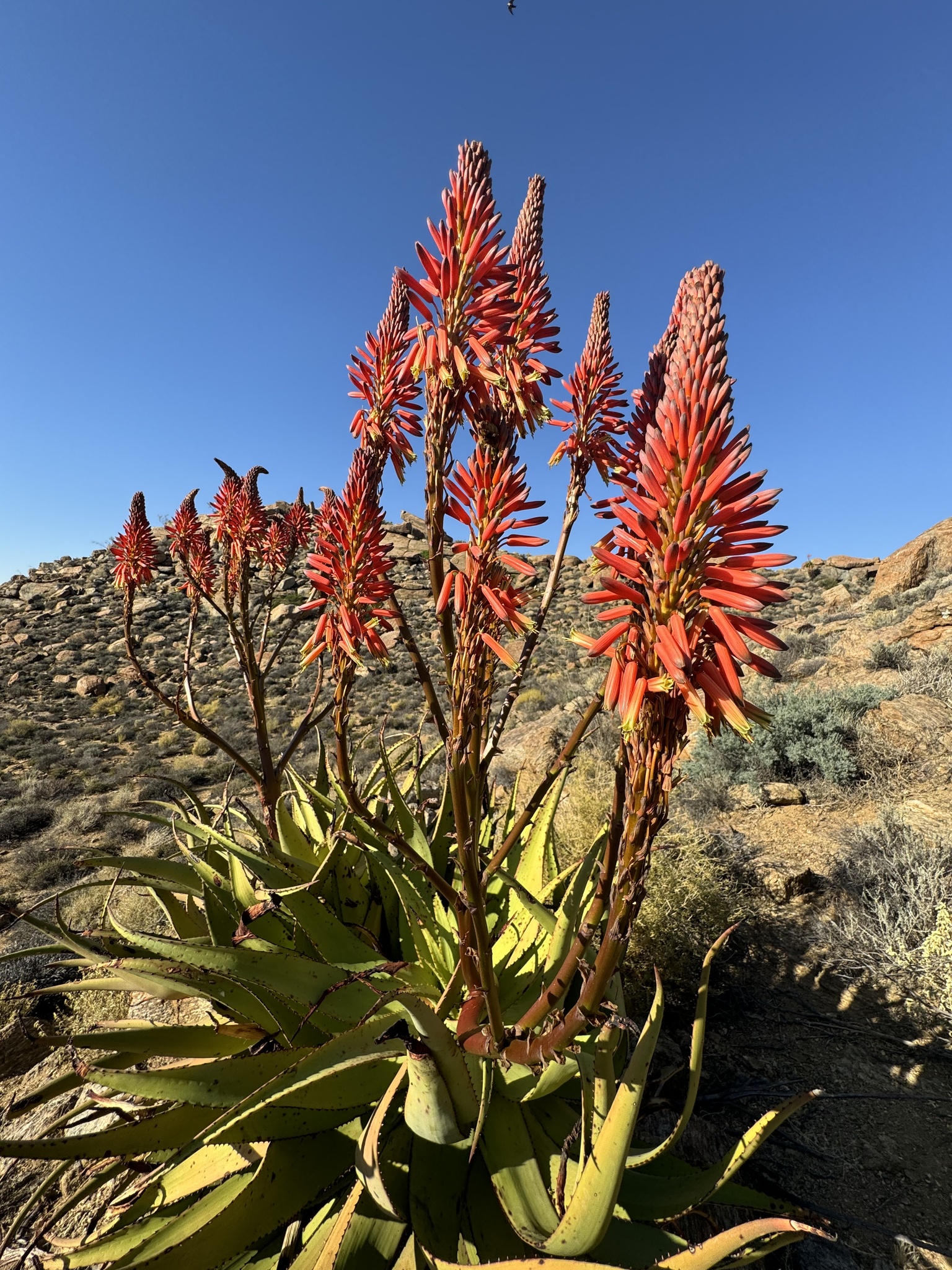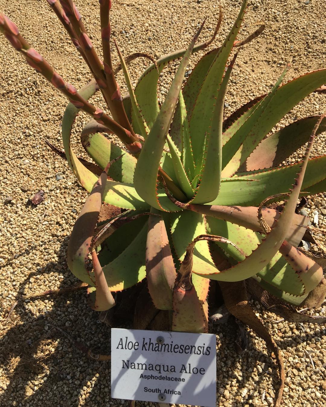 Aloe khamiesensis 是一种起源于南非北开普省干旱地区的耐旱芦荟属(Aloe)多肉植物,属于天门冬科(Asphodelaceae)。它通常表现为直立单干或少分枝的大型芦荟,具有长叶、白斑与显眼的冬季花序,是南部非洲荒漠与山地荒原植被的一部分。该物种由植物学家 Neville Stuart Pillans 于 1934 年在 South African Gardener上正式描述发表。