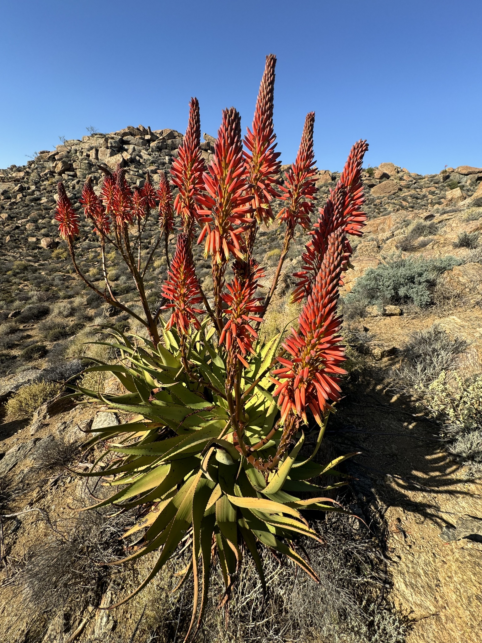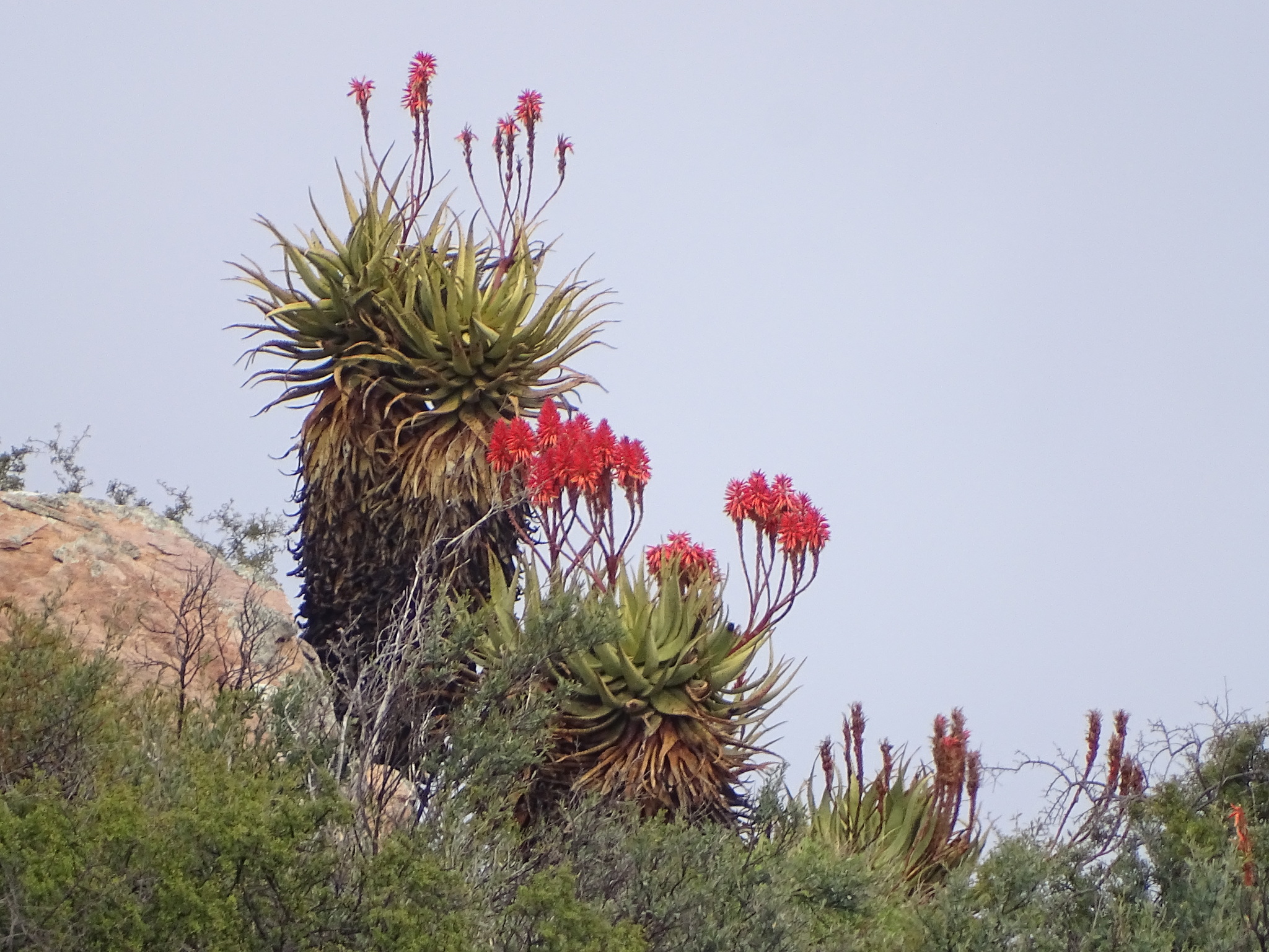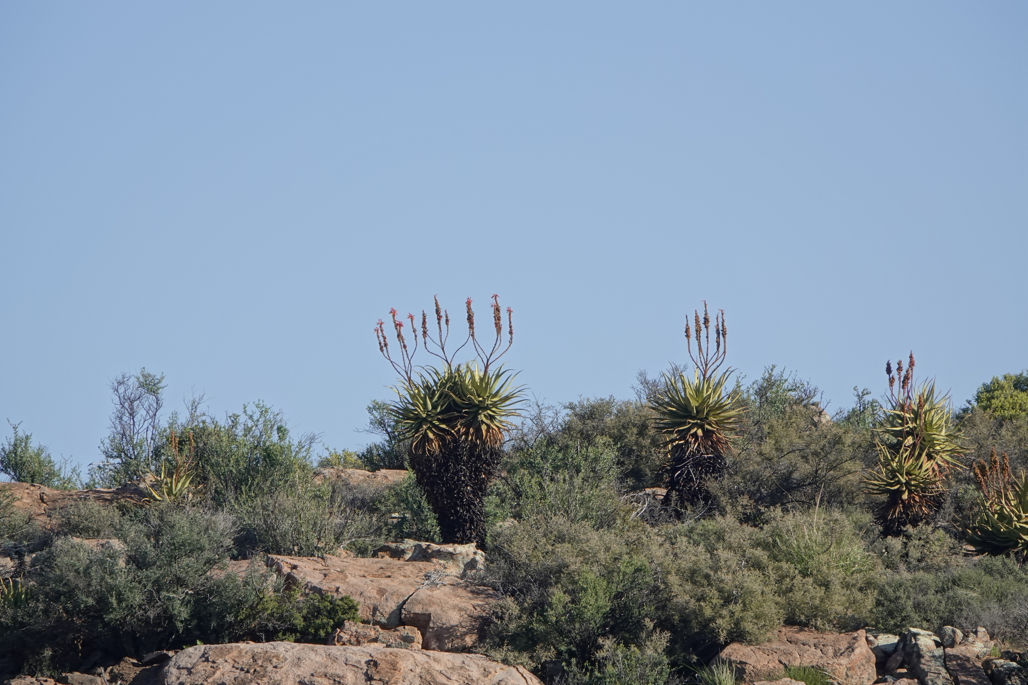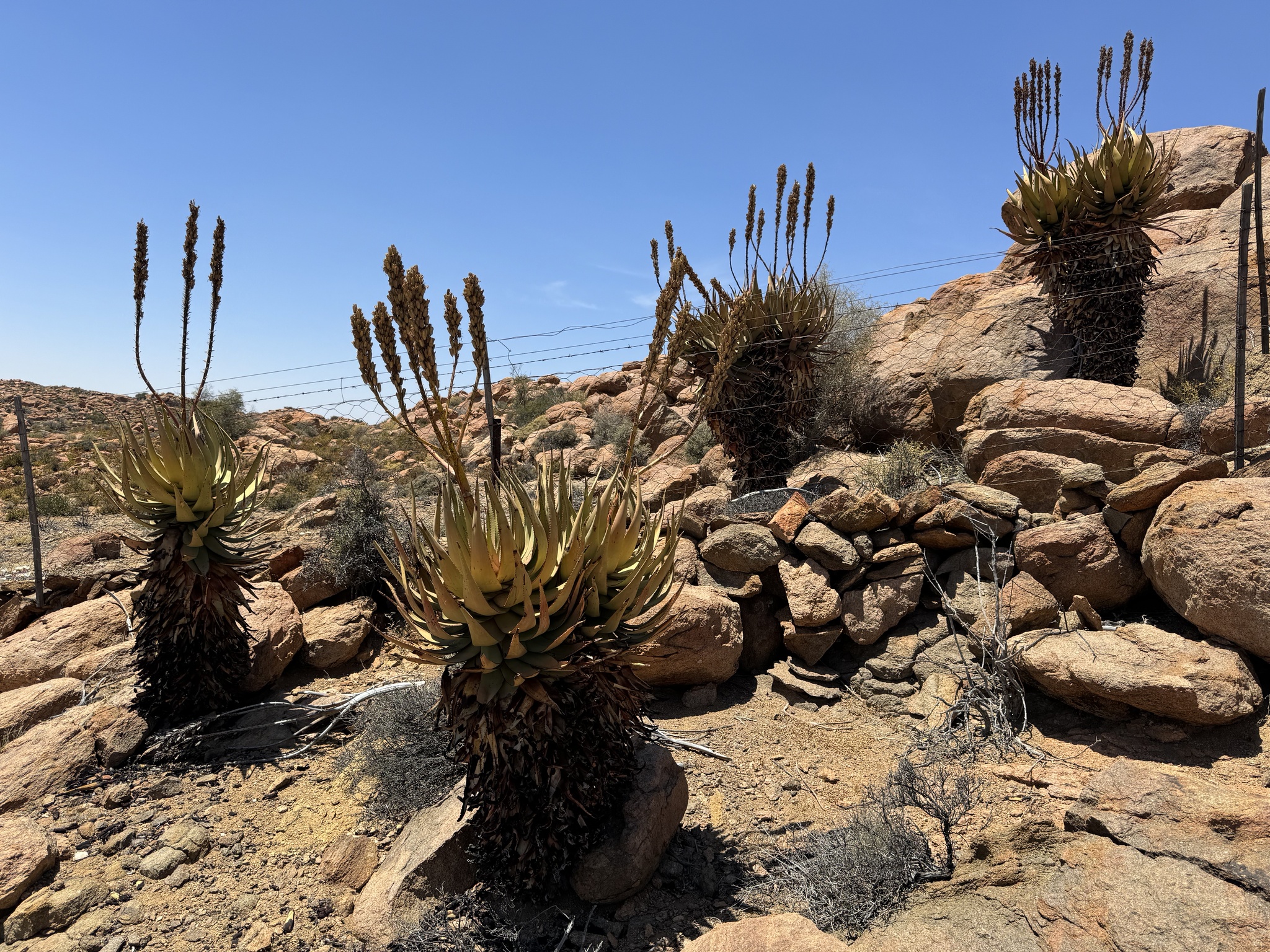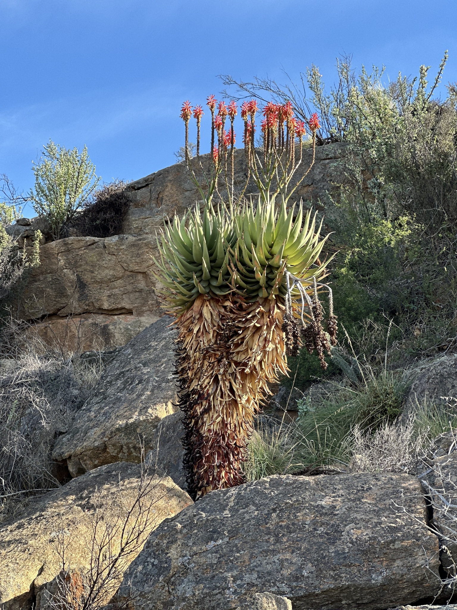 Aloe khamiesensis 是一种起源于南非北开普省干旱地区的耐旱芦荟属(Aloe)多肉植物,属于天门冬科(Asphodelaceae)。它通常表现为直立单干或少分枝的大型芦荟,具有长叶、白斑与显眼的冬季花序,是南部非洲荒漠与山地荒原植被的一部分。该物种由植物学家 Neville Stuart Pillans 于 1934 年在 South African Gardener上正式描述发表。