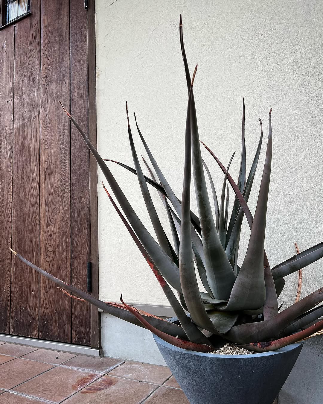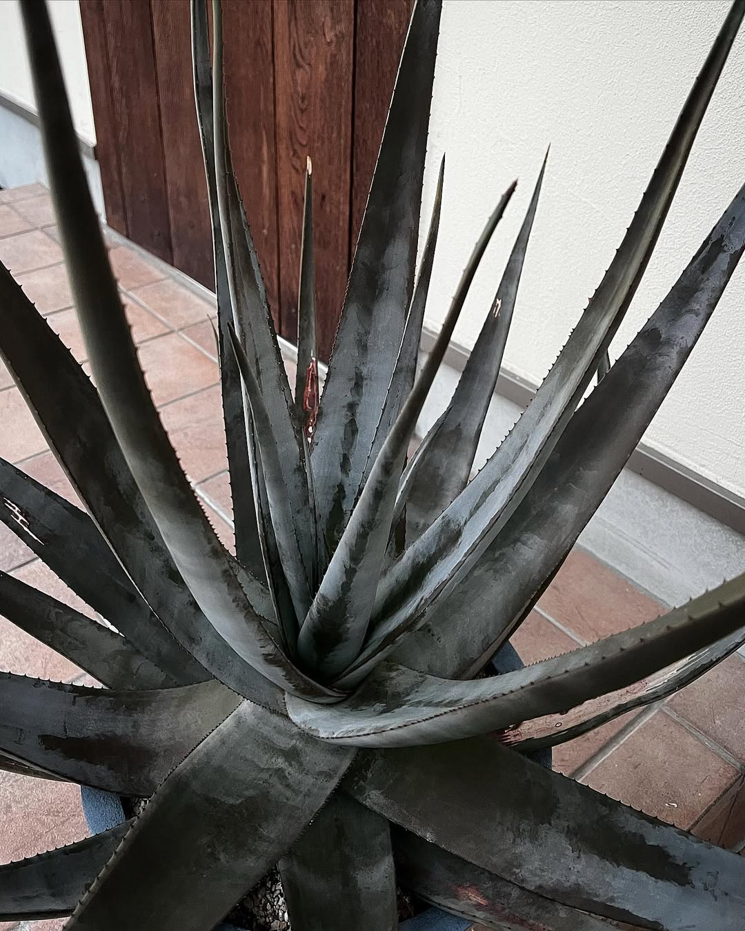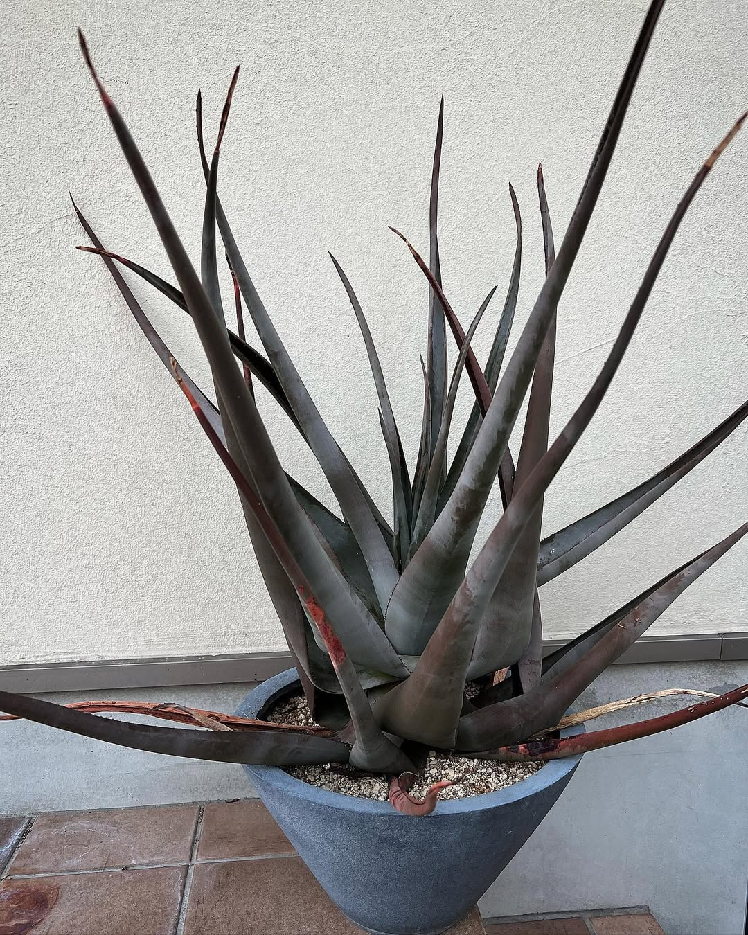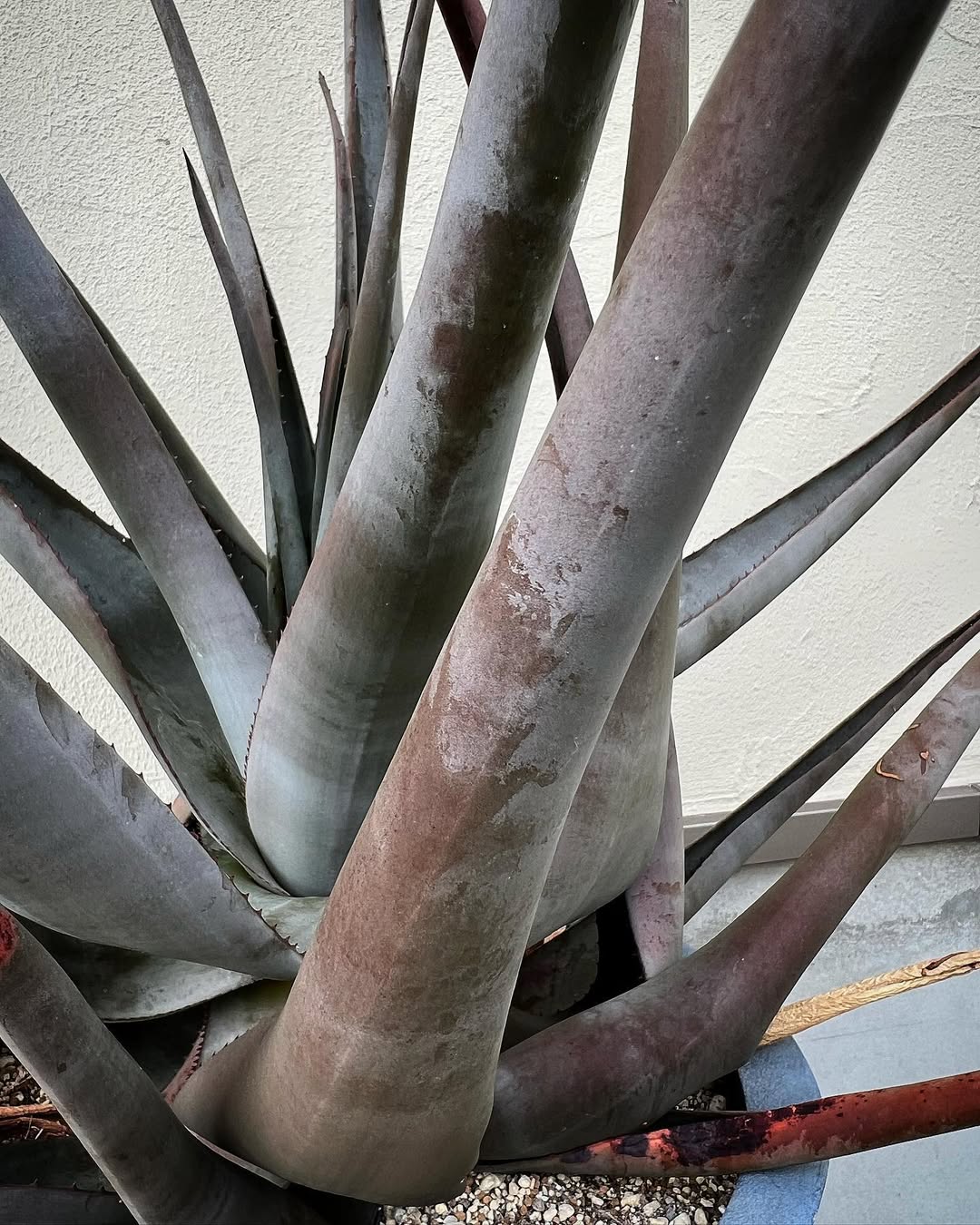叶片灰绿色至灰蓝绿,质地厚实,窄而长,叶缘具小锐齿,齿色多为棕红色或褐色。