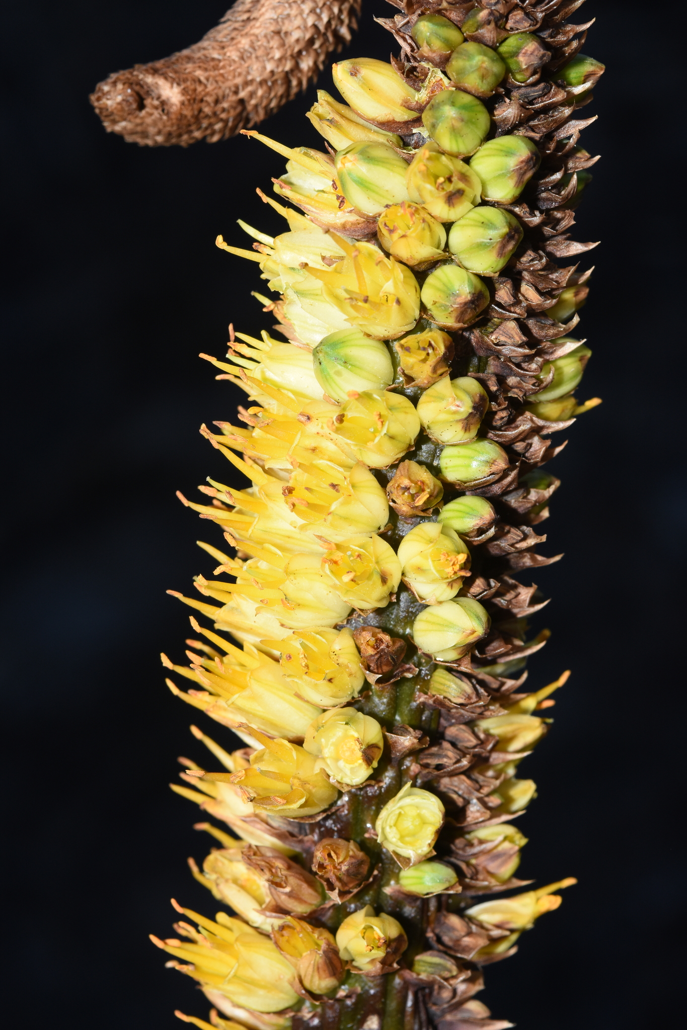 Aloe alooides,又称草头树芦荟或Graskop Aloe,是一种原生于南非的大型树状多肉植物,属于百合科(Asphodelaceae)芦荟属。它是一种生长缓慢的树状芦荟,有着粗壮的茎,茎上覆盖着旧的干枯的叶状残余物,顶上密布着橄榄绿色、有时略带红色的叶状苞叶。它可长到4米(13.1英尺)高,植株整体高度可达2-4米(6-13英尺),宽度约1-2米,通常呈单一茎干,或在基部附近有少数分枝。这种植物以其独特的橄榄绿叶片和冬季柠檬黄色花序闻名,在文化中常被视为耐旱园艺的珍贵品种。其历史可追溯到南非本土的野生分布,最早于1880年由英国植物学家John Gilbert Baker描述,如今已成为园艺爱好者和植物收藏家的热门选择,尤其因其耐寒性和冬季花期增添景观魅力。它与Aloe excelsa(卓越芦荟)关系密切,但区别在于其更粗壮的茎和特定的栖息地适应性。