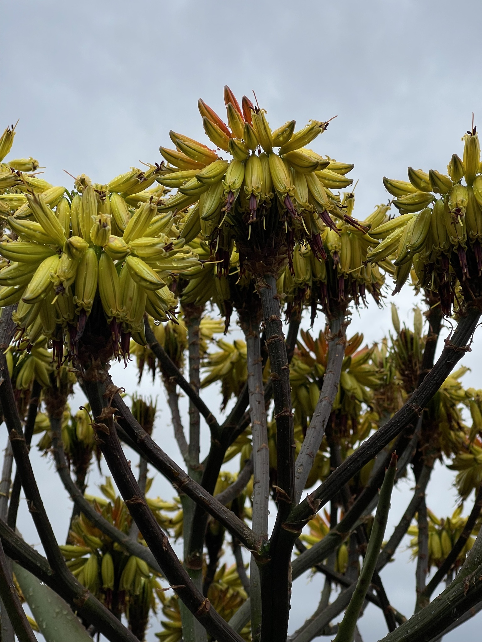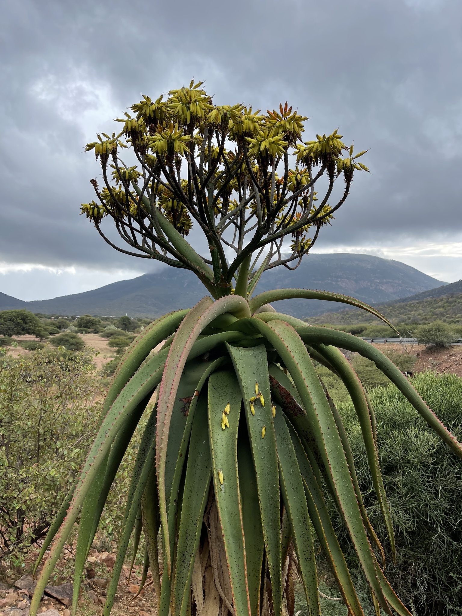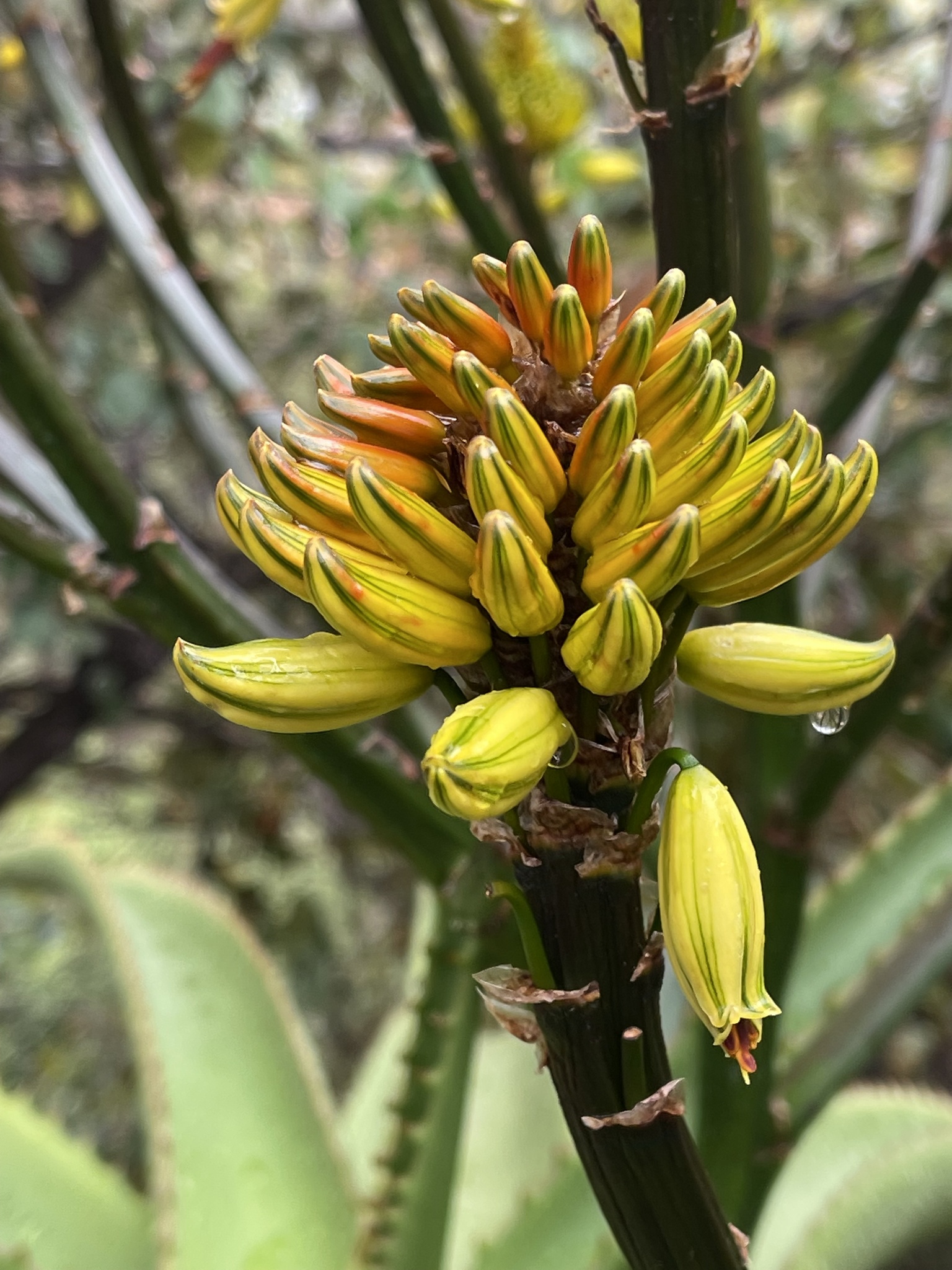 Aloe angelica 是一种大型的树状芦荟,通常具有单茎,但偶尔会分枝。茎粗壮,覆盖着干枯的叶残留物,顶端形成密集的莲座丛,叶片呈浅橄榄绿色或淡蓝绿色,弯曲向后,长达60-80厘米,宽度约10-15厘米,表面光滑肉质,有明显的叶脉,边缘具有小的棕红色刺。叶片适合储存水分,在阳光充足时可能呈红棕色调。花蕾为橙色,但开放后会呈现亮黄色,具有双色效果。花序分枝较多,可产生15-25个紧凑的圆柱状总状花序,花朵管状,长约2-3厘米,绽放期主要在冬季(南半球6-8月),形成引人注目的花穗。这些花序不仅吸引传粉者如鸟类和昆虫,还为景观增添温暖的色彩。植株整体呈常绿形态,生长速率缓慢,需要多年才能成熟开花。果实为蒴果,种子小而扁平。