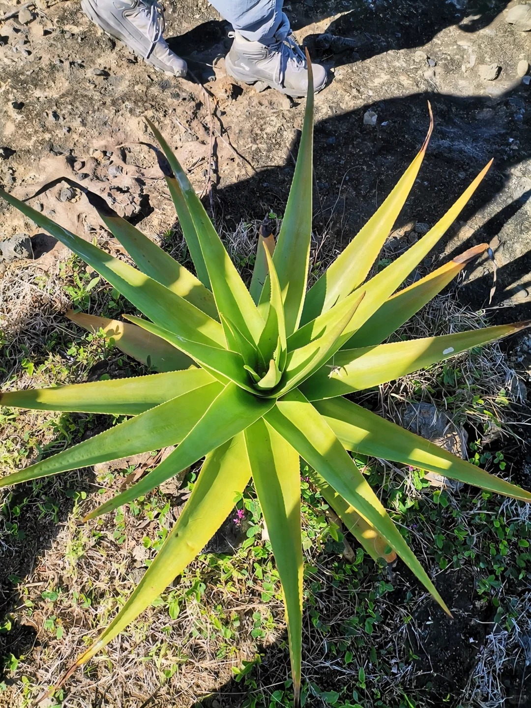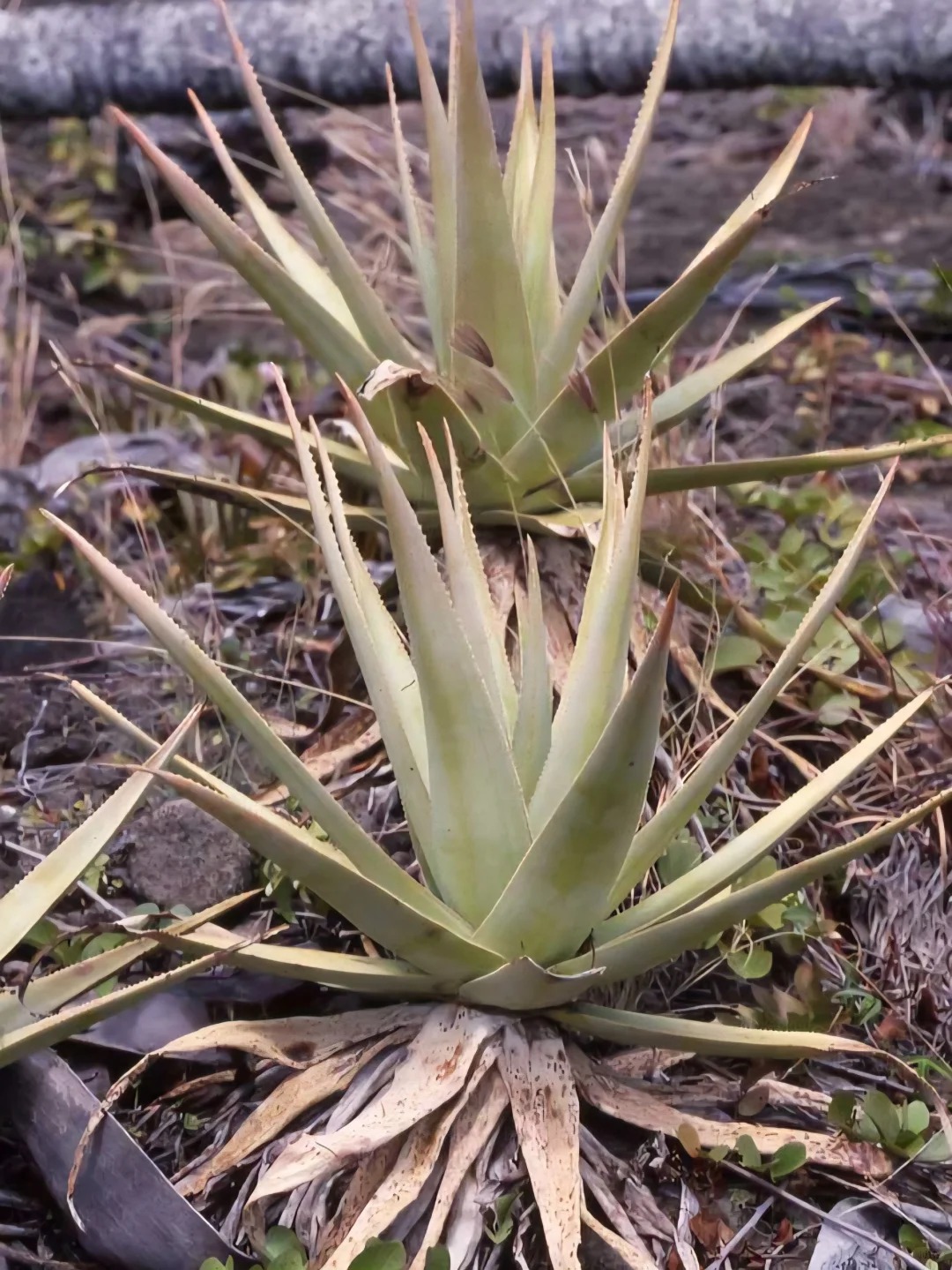 叶片长而直,呈披针形,肉质,长60厘米,宽15厘米,密集呈莲座状排列,颜色为绿松石绿,在阳光直射下有时会变成青铜色,边缘呈红色。通常矮小且单生,偶尔会产生分株,老株甚至会形成粗壮的匍匐茎。花序长90-120厘米,通常有3-7个分支,每个分支长30-60厘米,花序、花梗和直立的花芽均为橙红色,开花后变为淡黄色,花有绿色尖端。这些花序不仅吸引传粉者如昆虫,还为景观增添温暖的色彩。植株整体呈常绿形态,生长速率中等,需要数年才能成熟开花。果实为浆果,种子小而扁平。