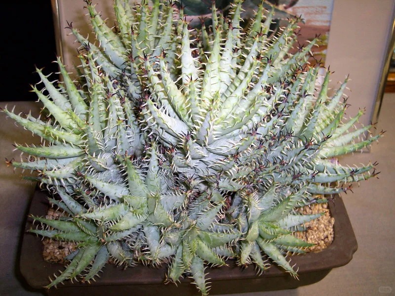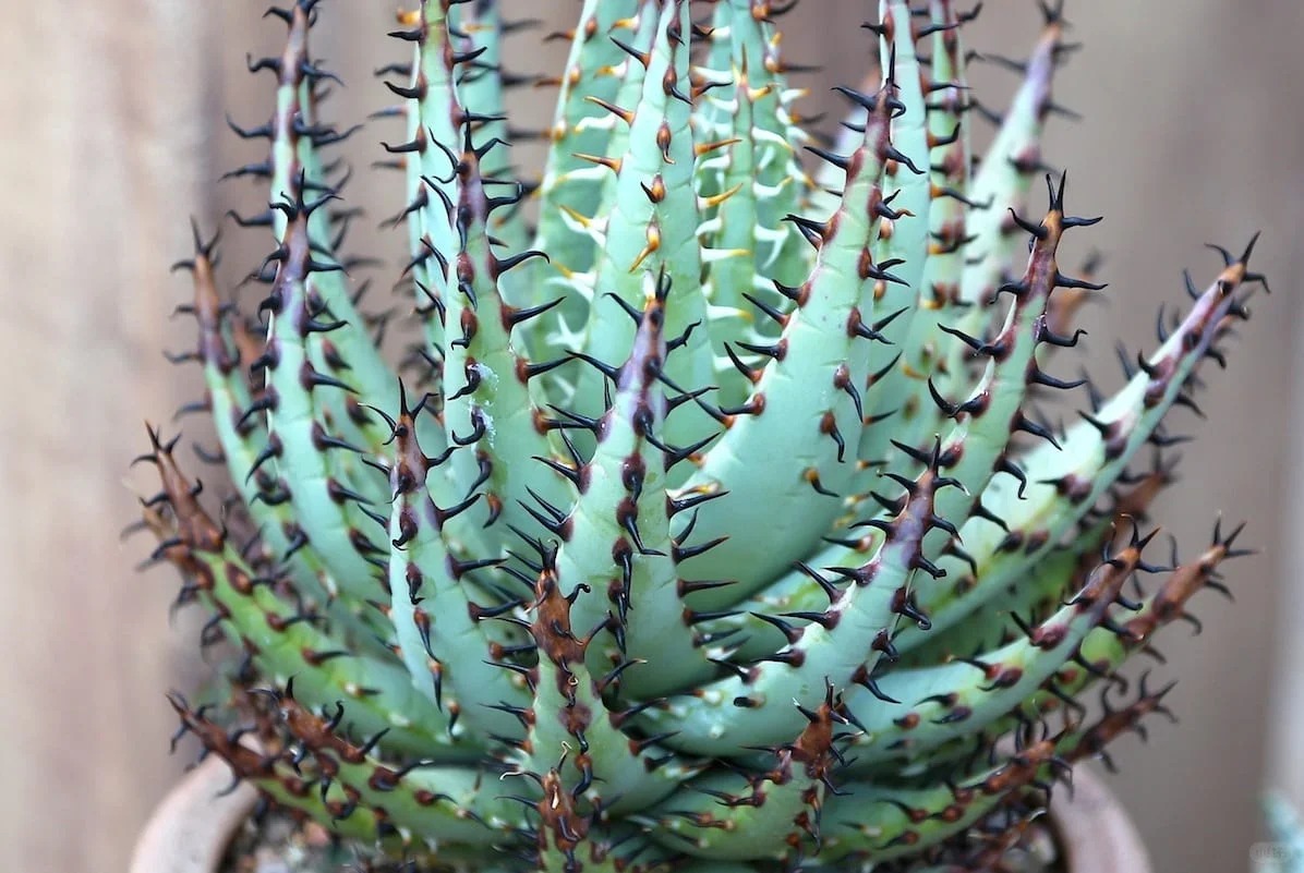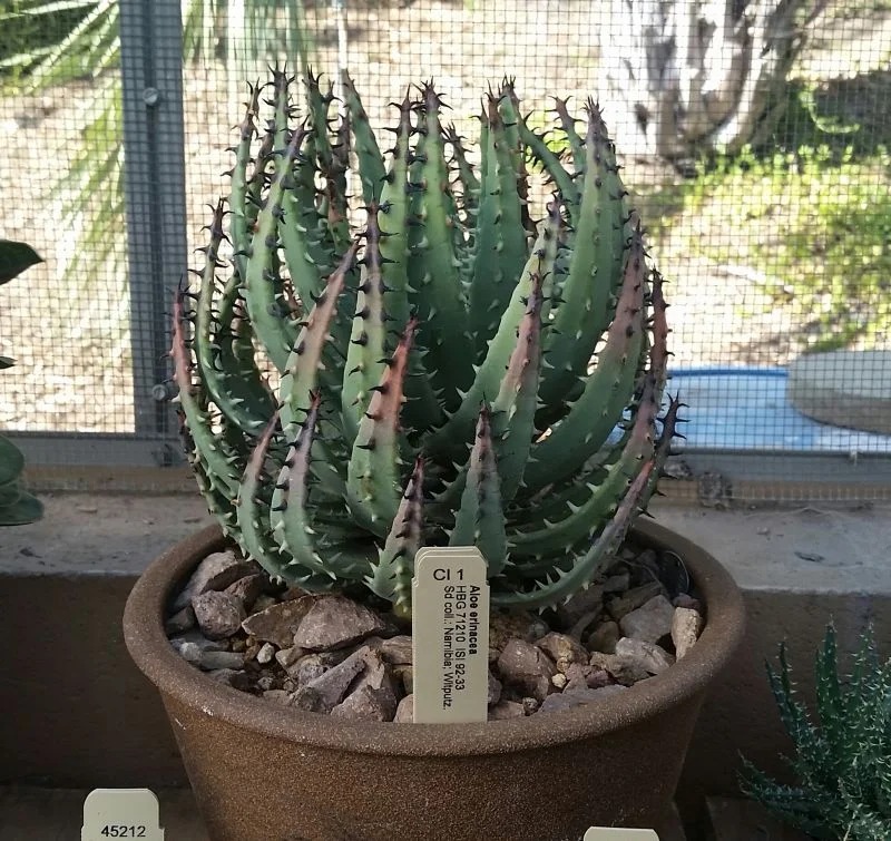 Aloe erinacea,又称刺猬芦荟或糙叶芦荟,是一种原生于纳米比亚南部的特有种,生长在纳米布沙漠冬季降雨量非常低的岩石露头上的小块沙质土壤中。它也被称为Aloe melanacantha var. erinacea,是一种生长缓慢的植物,以其灰绿色或灰蓝色叶子和莲座丛,叶缘和叶脊上有坚硬、锋利的白色或黑色牙齿闻名,在文化中常被视为干旱园艺的珍贵品种。其历史可追溯到非洲本土的野生分布,最早于1936年由德国植物学家Kurt Dinter描述,如今已成为园艺爱好者和植物收藏家的热门选择,尤其因其耐旱性和独特的蓝灰色调增添景观魅力。