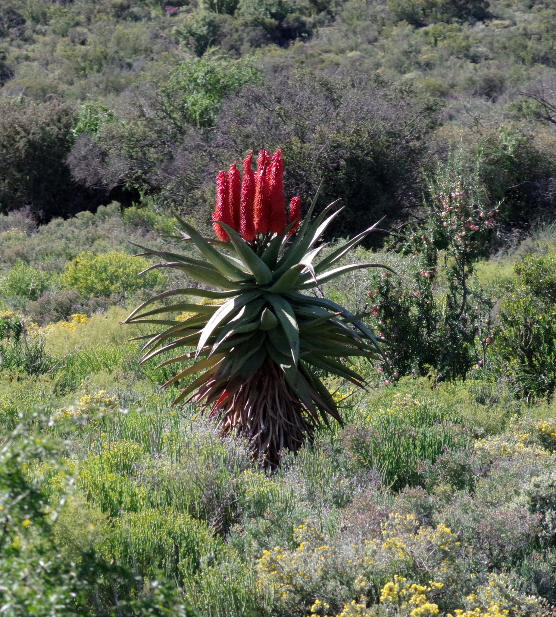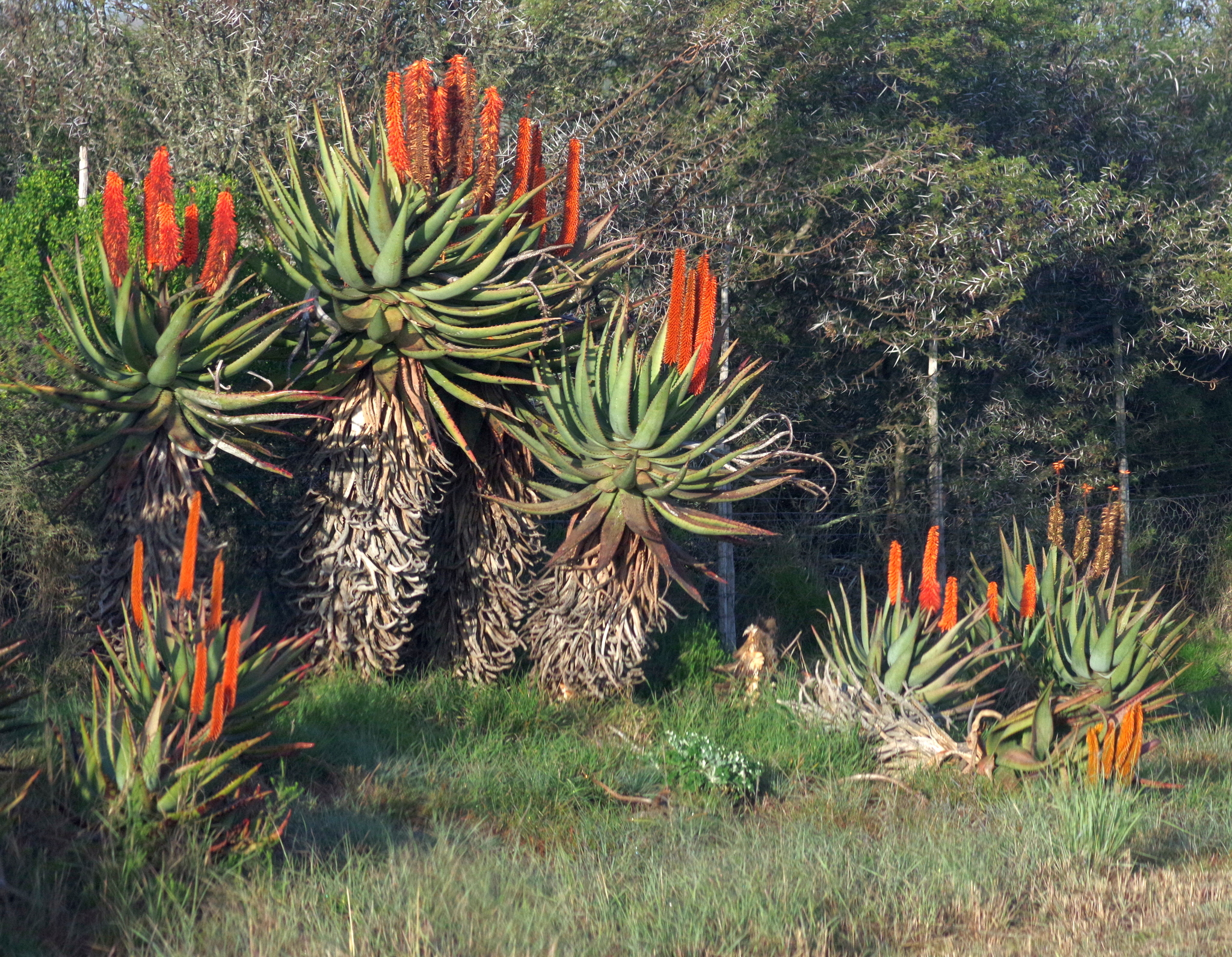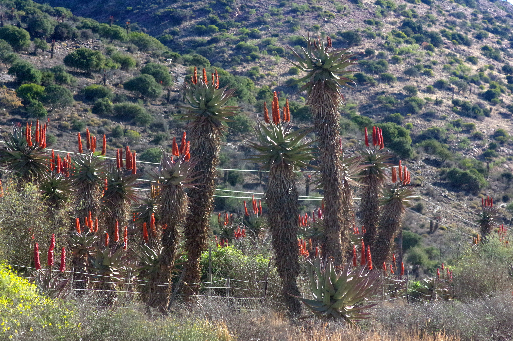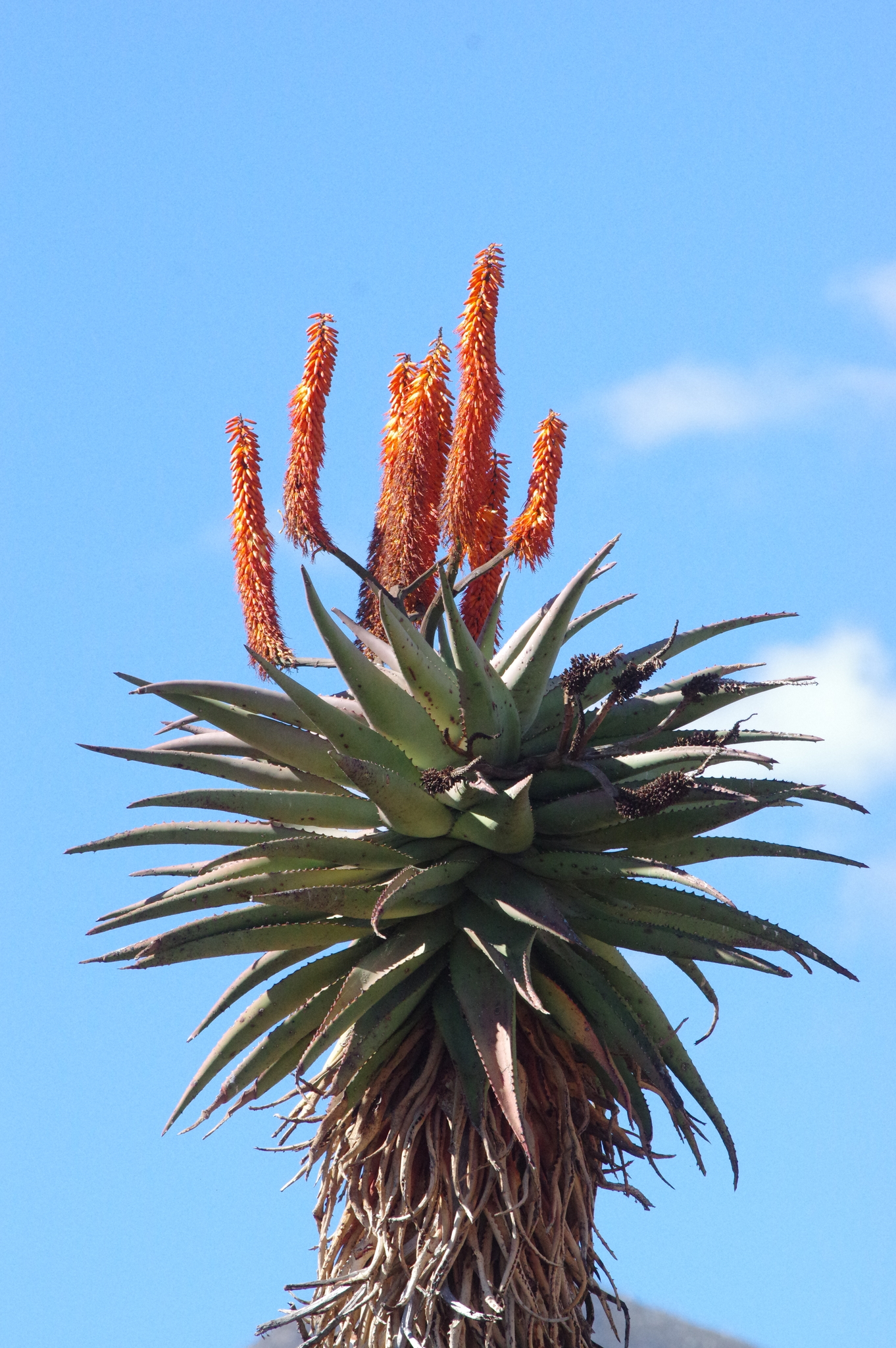 Aloe ferox,又称苦芦荟或开普芦荟,是一种原生于南非的大型树状多肉植物,属于百合科(Asphodelaceae)芦荟属。它是一种高大的单茎芦荟,分布范围广泛,从开普敦西南部到夸祖鲁-纳塔尔省南部,范围超过1000公里。它也分布在自由邦的东南角和莱索托南部。在野外可以长到2-3米高,叶子排列成莲座状。老叶干燥后会留在茎上,在茎上形成“衬裙”。叶子是暗绿色的,有时看起来略带蓝色。它们也可能带有淡红色调。叶尖略微向下弯曲,沿着叶缘的刺是红色的。刺也可能存在于叶子的上表面和下表面。幼苗往往非常多刺。花朵被装在一个大烛台状的花头中。通常有五到八个树枝,每个树枝上都有一个穗状的花头,上面有许多花。花的颜色从黄橙色到鲜红色不等。花期在5月至8月之间,但在该国较冷的地区,开花可能会推迟到9月。开花期间吸引了许多鸟类,如太阳鸟、织布鸟、有光泽的椋鸟和鼠鸟。昆虫也会造访花朵,在自然区域,猴子和狒狒会袭击芦荟以获取花蜜。游客通常会带着大片的花粉离开,这经常引起观鸟者的困惑!它是一种极好的园林标本植物,适应多种条件。