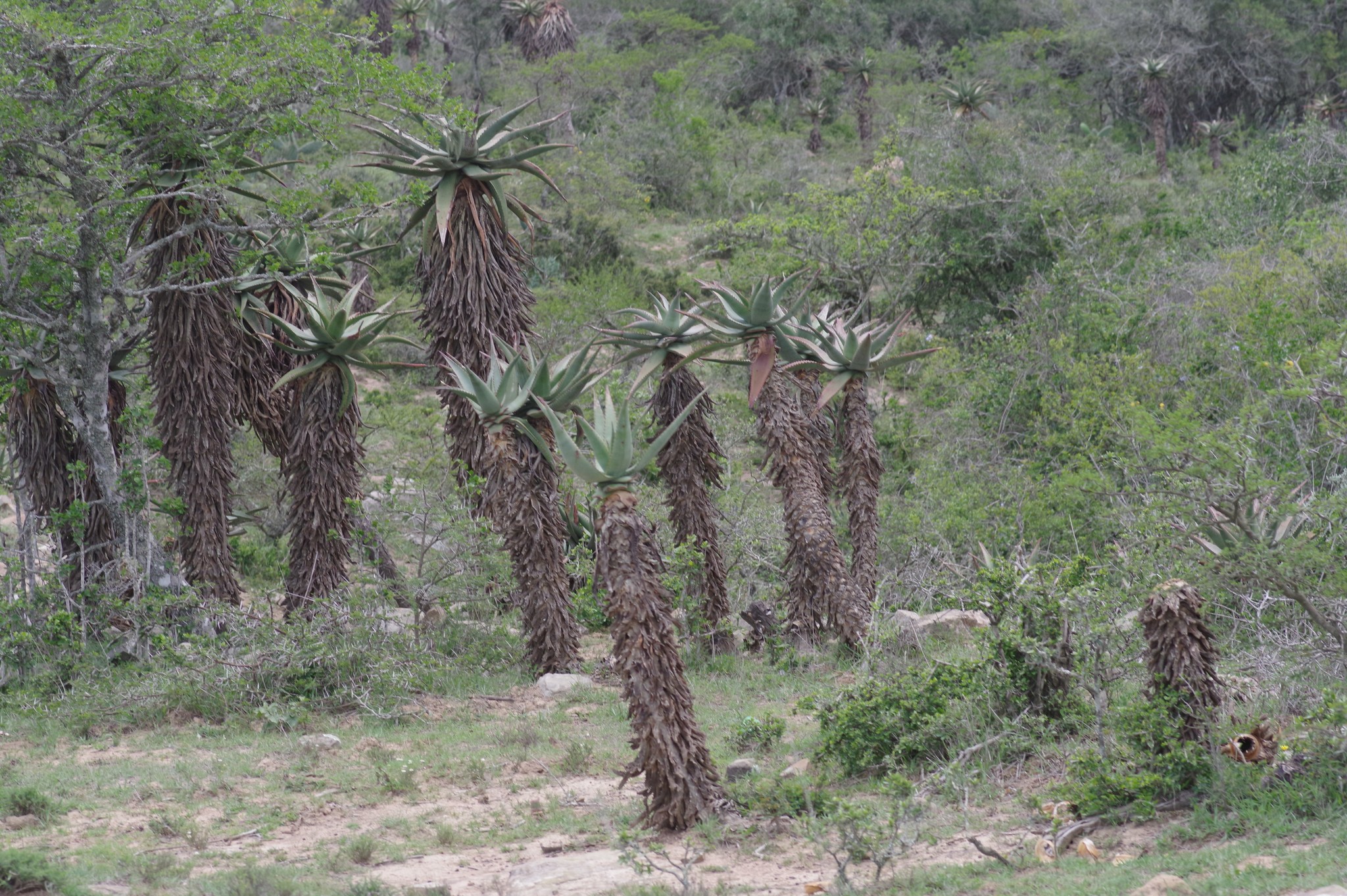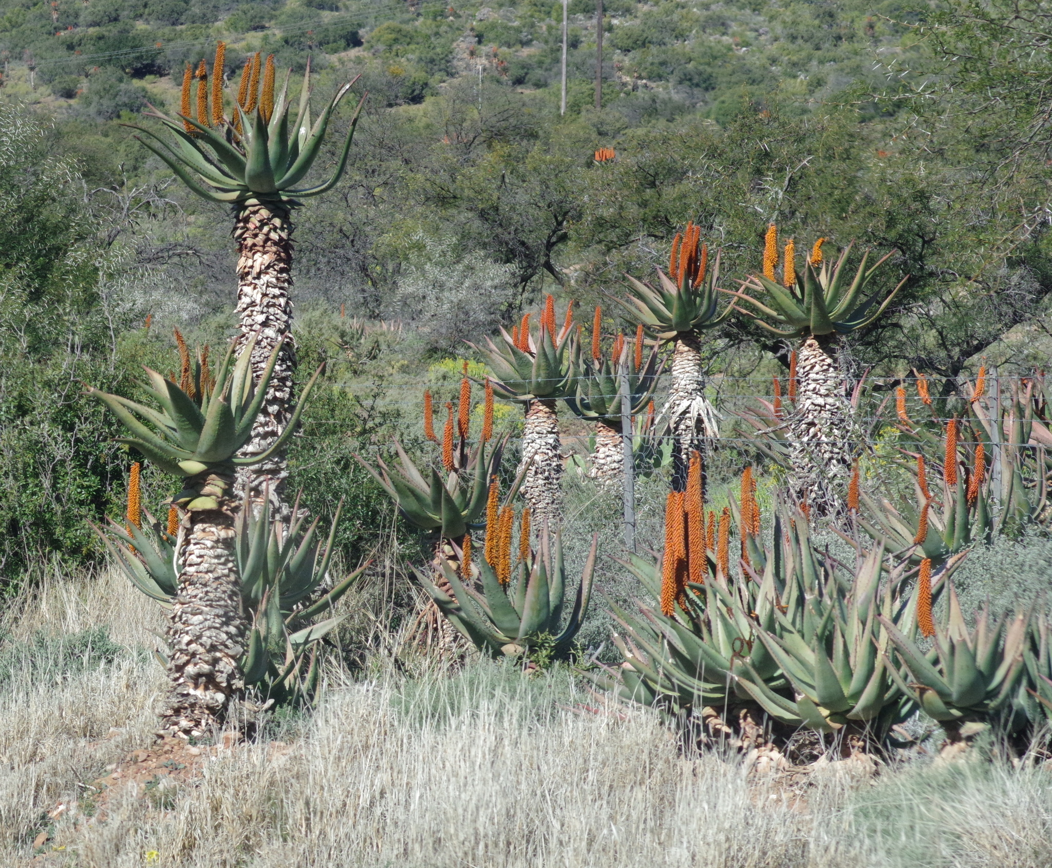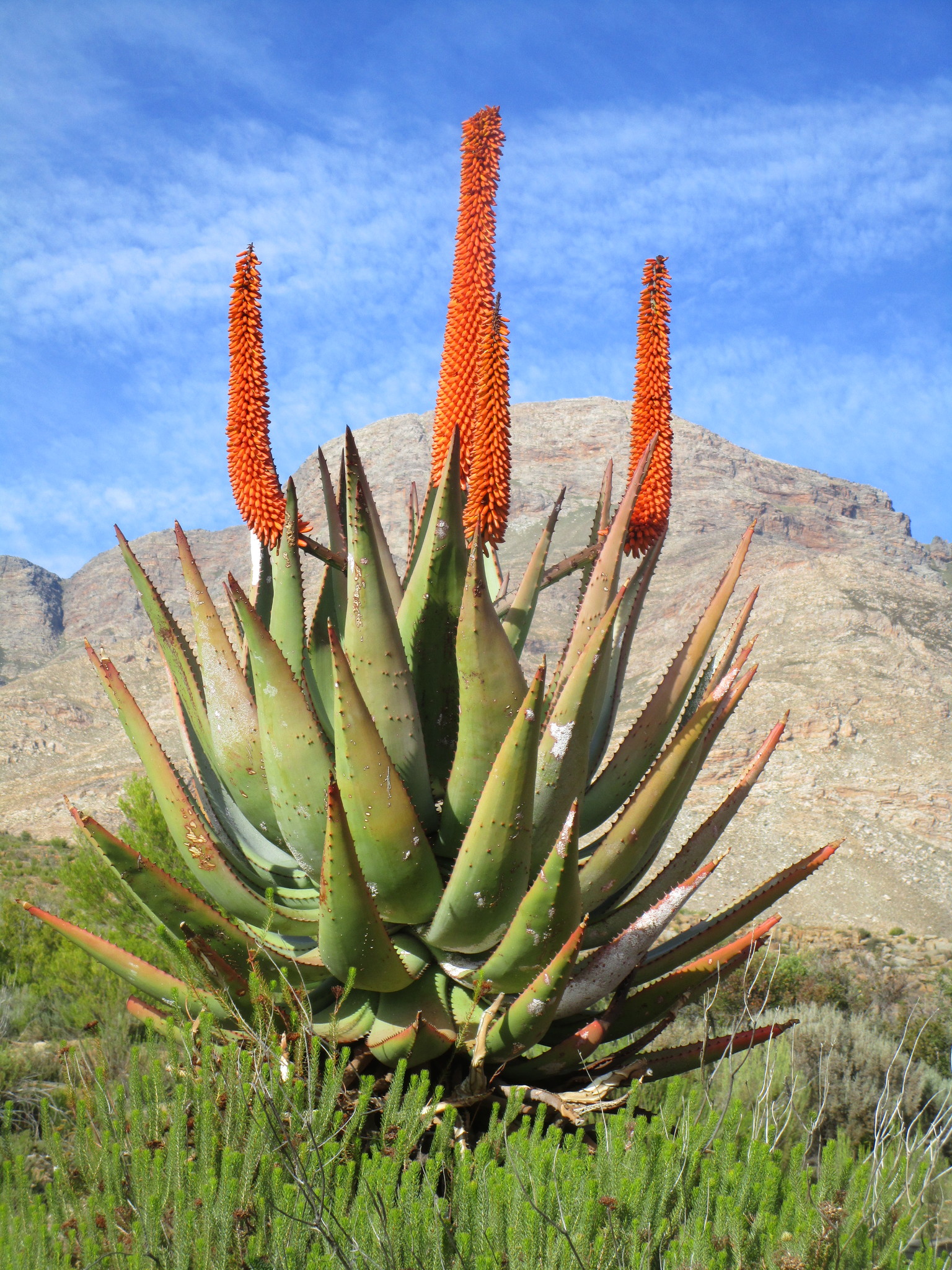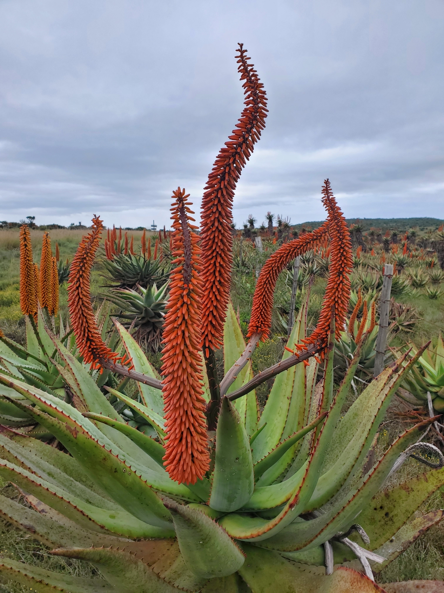Aloe ferox,又称苦芦荟或开普芦荟,是一种原生于南非的大型树状多肉植物,属于百合科(Asphodelaceae)芦荟属。它是一种高大的单茎芦荟,分布范围广泛,从开普敦西南部到夸祖鲁-纳塔尔省南部,范围超过1000公里。它也分布在自由邦的东南角和莱索托南部。在野外可以长到2-3米高,叶子排列成莲座状。老叶干燥后会留在茎上,在茎上形成“衬裙”。叶子是暗绿色的,有时看起来略带蓝色。它们也可能带有淡红色调。叶尖略微向下弯曲,沿着叶缘的刺是红色的。刺也可能存在于叶子的上表面和下表面。幼苗往往非常多刺。花朵被装在一个大烛台状的花头中。通常有五到八个树枝,每个树枝上都有一个穗状的花头,上面有许多花。花的颜色从黄橙色到鲜红色不等。花期在5月至8月之间,但在该国较冷的地区,开花可能会推迟到9月。开花期间吸引了许多鸟类,如太阳鸟、织布鸟、有光泽的椋鸟和鼠鸟。昆虫也会造访花朵,在自然区域,猴子和狒狒会袭击芦荟以获取花蜜。游客通常会带着大片的花粉离开,这经常引起观鸟者的困惑!它是一种极好的园林标本植物,适应多种条件。