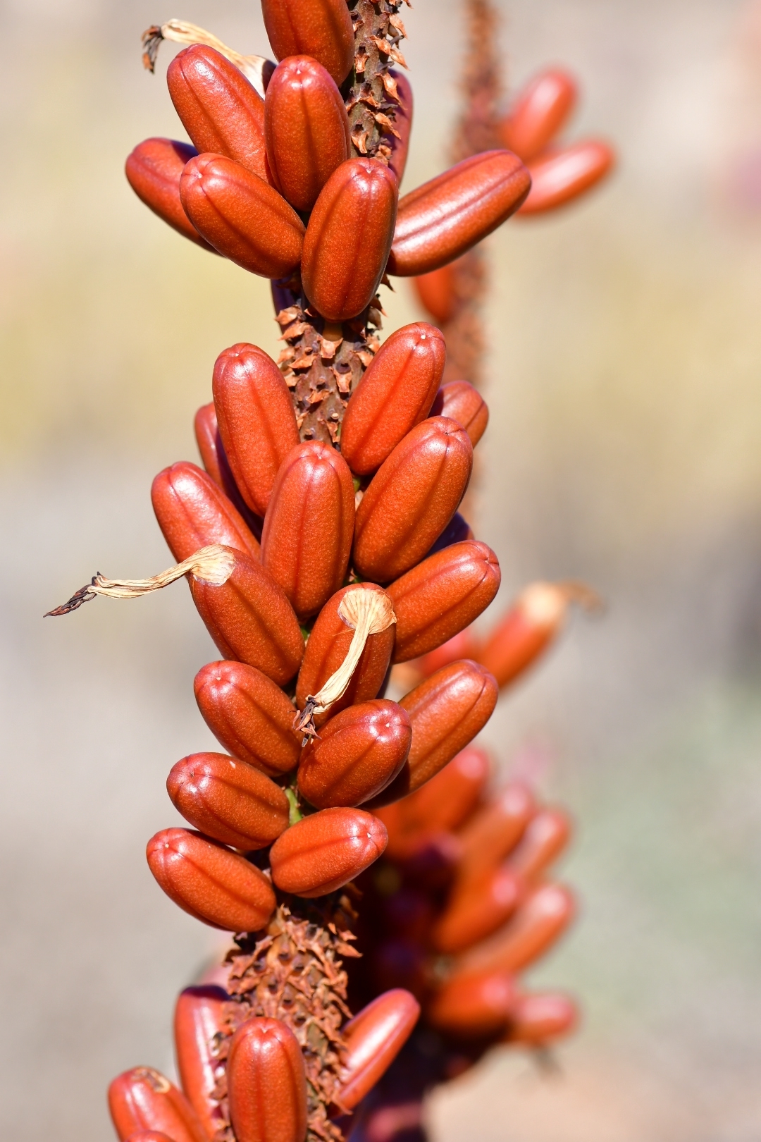 Aloe ferox是一种高大的单茎芦荟,在野外可以长到2-3米高,叶子排列成莲座状。老叶干燥后会留在茎上,在茎上形成“衬裙”。叶子是暗绿色的,有时看起来略带蓝色。它们也可能带有淡红色调。叶尖略微向下弯曲,沿着叶缘的刺是红色的。刺也可能存在于叶子的上表面和下表面。幼苗往往非常多刺。花朵被装在一个大烛台状的花头中。通常有五到八个树枝,每个树枝上都有一个穗状的花头,上面有许多花。花的颜色从黄橙色到鲜红色不等。花期在5月至8月之间,但在该国较冷的地区,开花可能会推迟到9月。这些花序不仅吸引传粉者如鸟类和昆虫,还为景观增添温暖的色彩。植株整体呈常绿形态,生长速率缓慢,需要多年才能成熟开花。果实为蒴果,种子小而扁平。