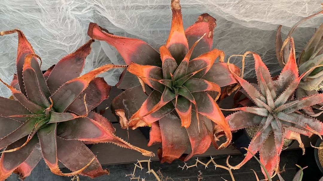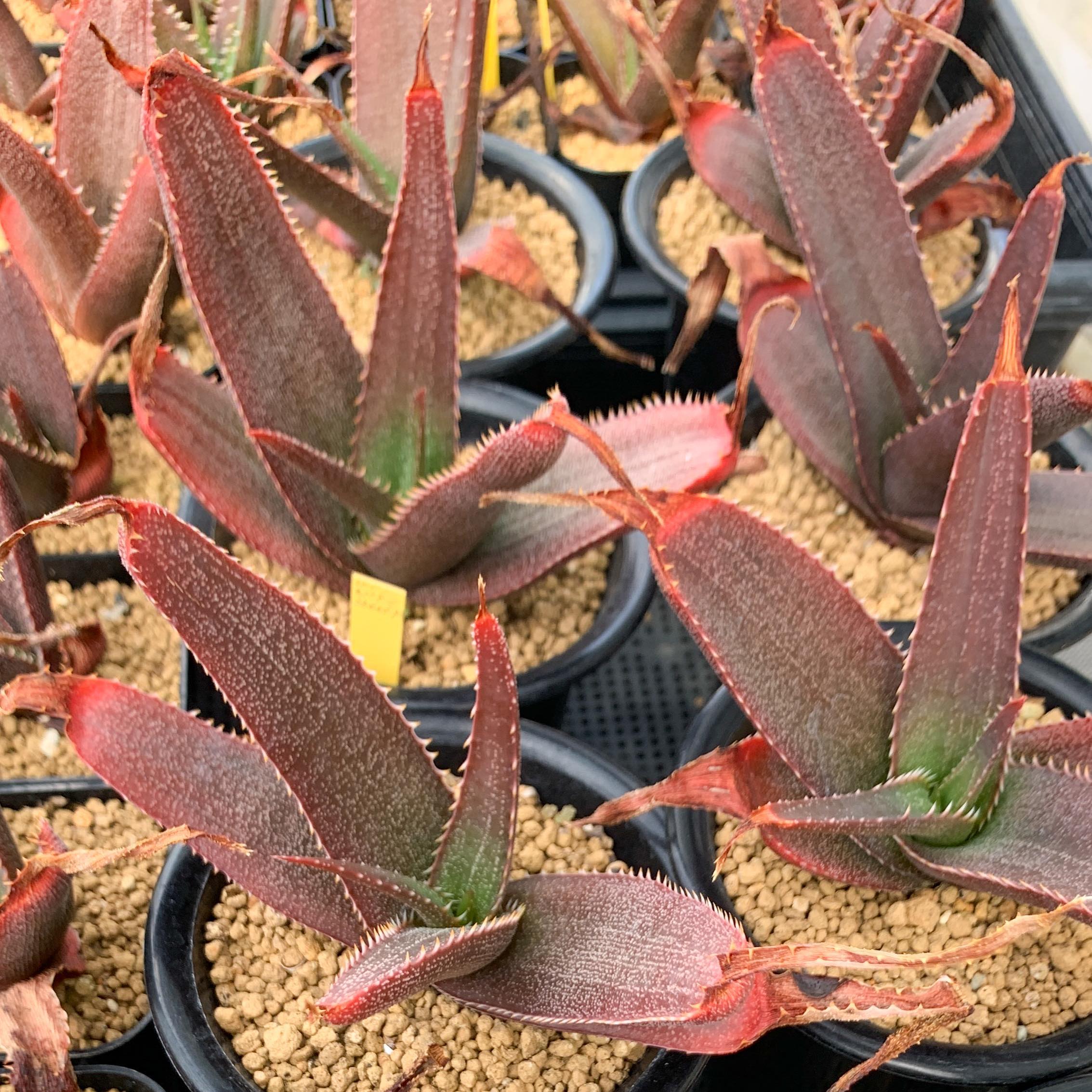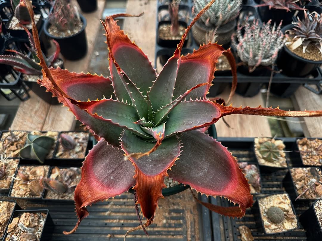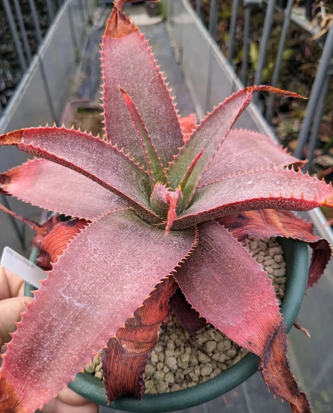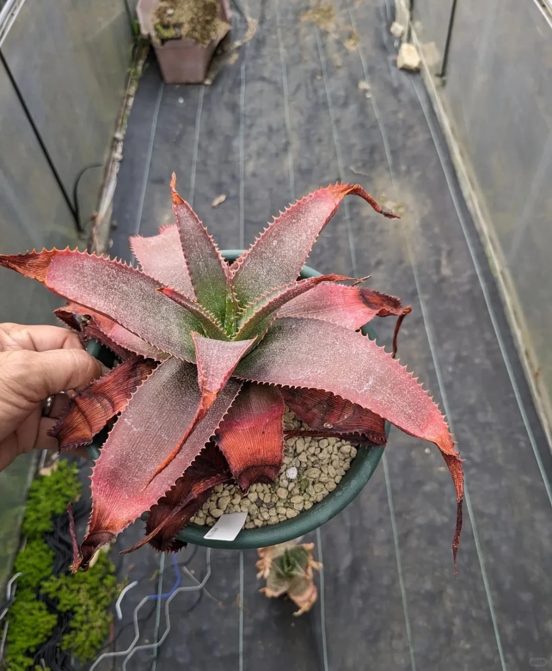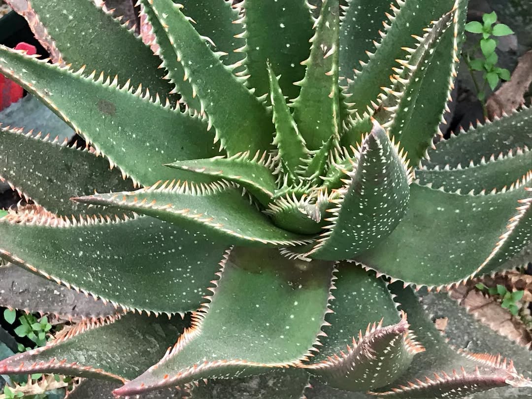 – **叶片**:约25–30片披针形叶片形成致密的莲座状。叶片呈暗灰绿色或蓝灰色,触感粗糙,向顶端呈红绿色,长达40厘米,宽10–14厘米。叶表面粗糙,边缘有红棕色、尖锐的齿状突起,长3–4毫米,间距8–12毫米。