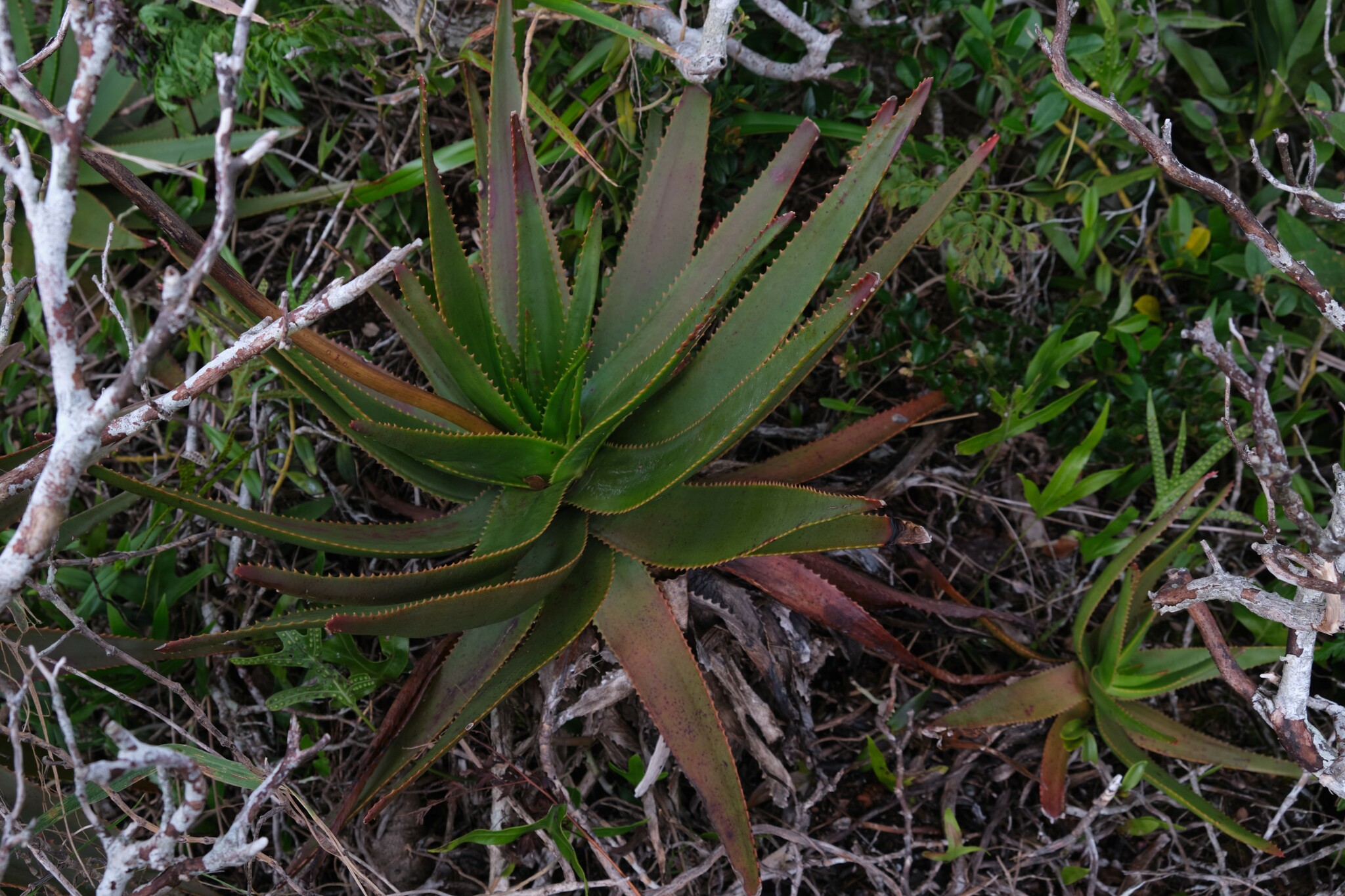 Aloe werneri是一种小型到中型的无茎芦荟(stemless aloe),形成扩散的莲座状叶丛(rosettes)。叶片呈亮绿色,带有红色调,形状为线状(linear),边缘可能有细小的齿或光滑,典型的多肉叶片用于储存水分以适应干旱环境。植株整体紧凑,适合岩石缝隙或贫瘠土壤生长。花序为总状花序,花朵小巧,呈绿色并带有白色条纹或斑点,吸引特定的传粉者如鸟类或昆虫。种子传播可能依赖于风或动物,但具体细节有限。该种的形态变异性较小,与马达加斯加其他芦荟物种(如Aloe ampefyana)相似,但通过叶片颜色和花色区分。 作为芦荟属的一部分,它具有典型的肉质叶片和浅根系,适应从海平面到较高海拔的多样栖息地,但具体到Aloe werneri,主要限于马达加斯加的局部区域。