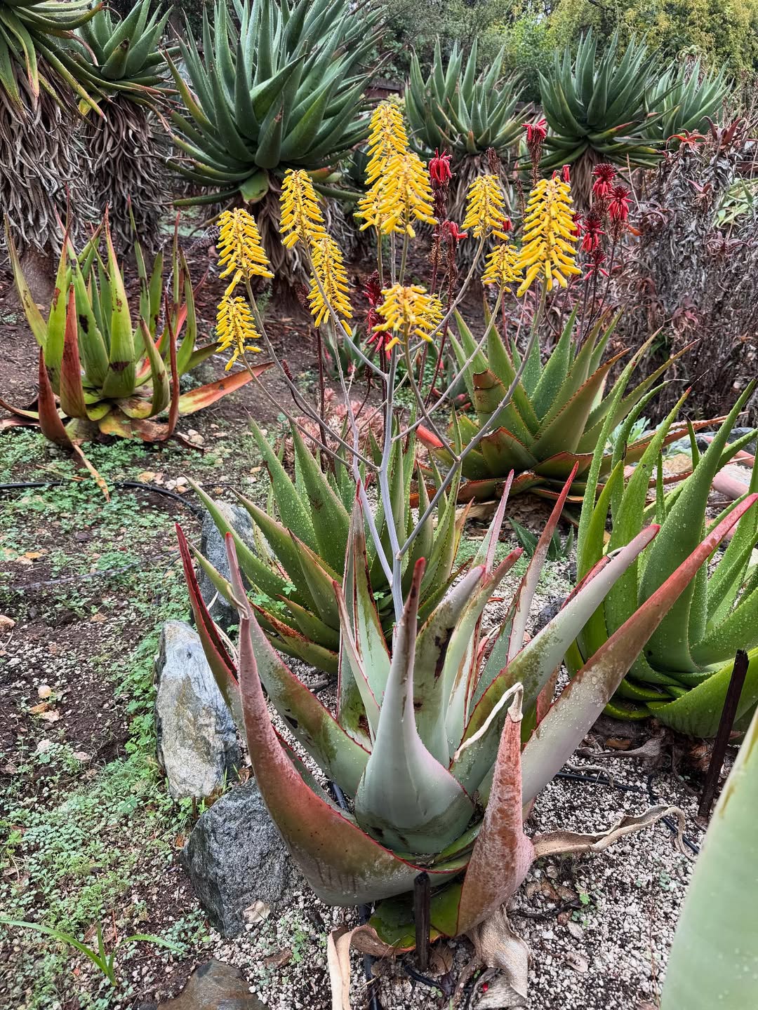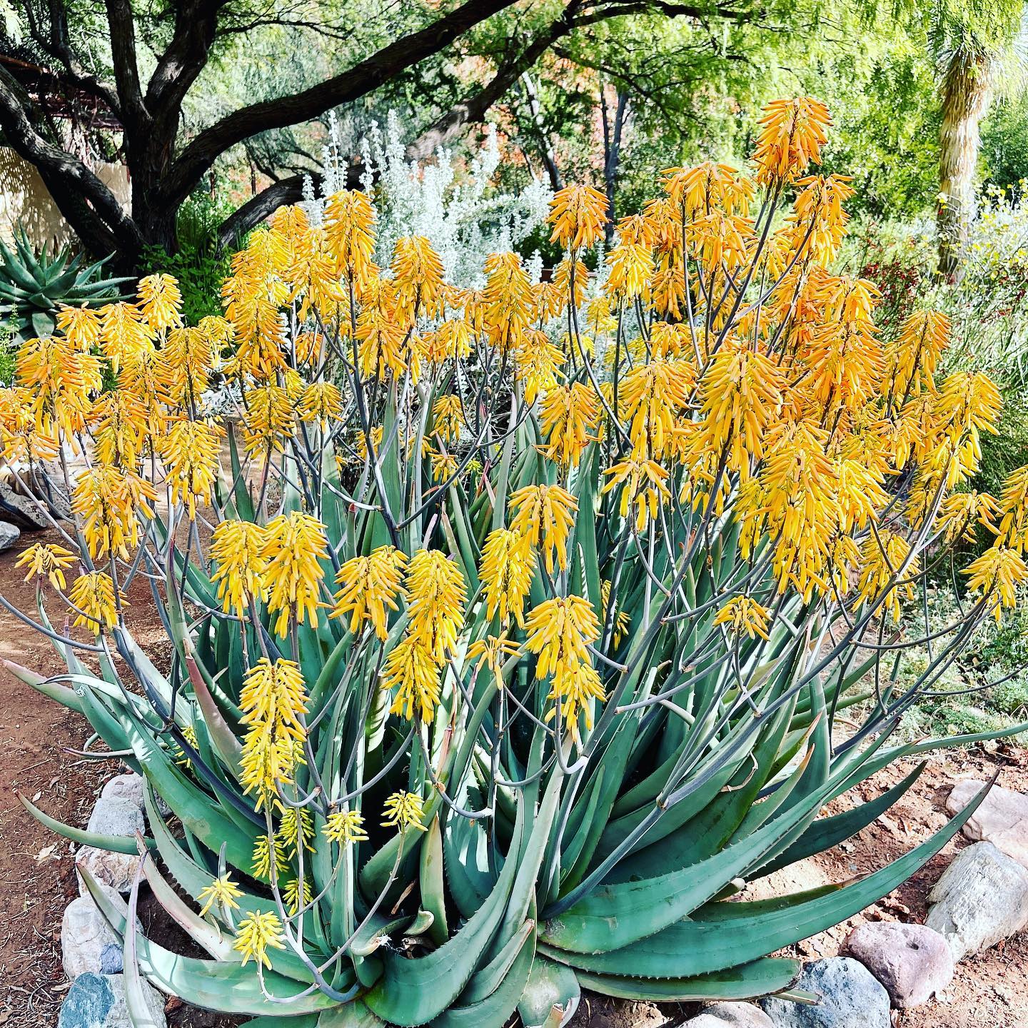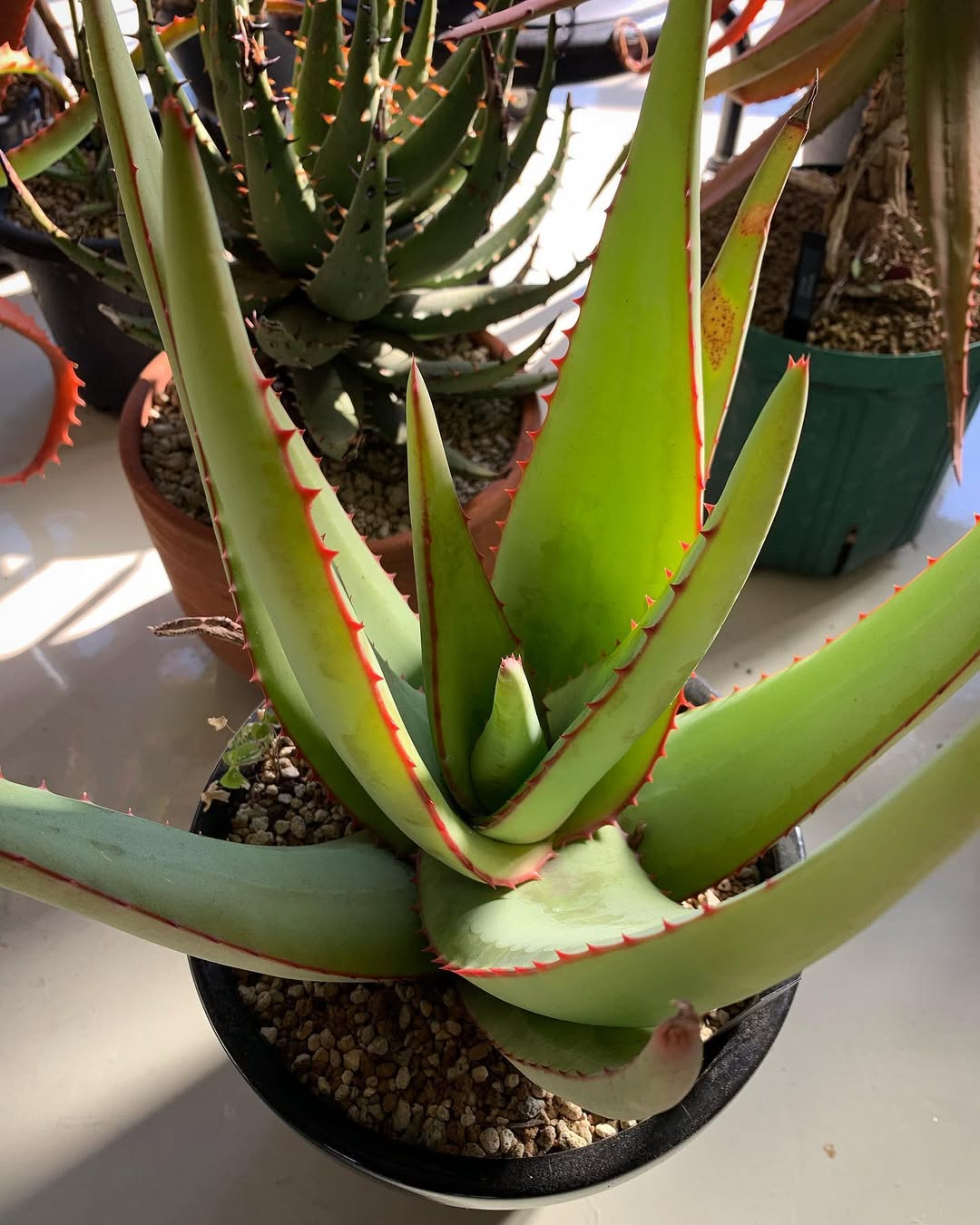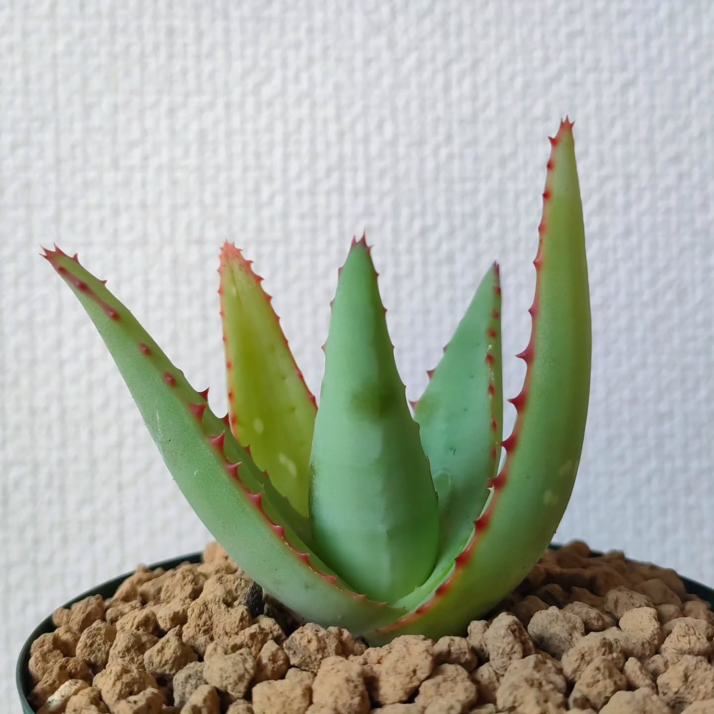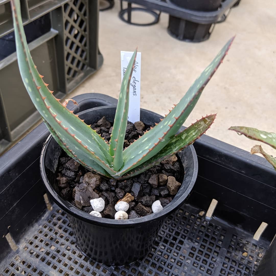 Aloe elegans通常为无茎或极短茎的物种,形成开放的莲座状叶丛,直径可达30-60厘米。叶片呈灰绿色至蓝绿色,形状为披针形(lance-shaped),长度约30-60厘米(1-2英尺),宽度3-6厘米,表面光滑或略带蜡质纹理,偶尔有浅斑点,边缘有红色齿状突起(reddish teeth),尤其在干旱胁迫或充足阳光下更明显;叶片肉质厚实,用于储存水分,叶色在压力下可转为红褐色(reddish brown)。花序为分枝的总状花序(2-4个分支),从叶丛中心伸出,高约50-80厘米,花梗直立。花朵呈管状或锥形簇生(conical heads),颜色从浅黄色、橙色到红色(pale yellow to orange-red),管状花冠长约2-4厘米,在冬季和早春开放(南半球为12-3月,北半球视气候调整)。花期后形成干燥的种子荚,种子多边形,传播依赖风或动物。植株整体生长缓慢,成年植株高度18-24英寸(约45-60厘米),可能产生侧芽,形成小群落。变异性高,包括花色从黄色到橙红,叶色从灰绿到蓝绿,取决于环境条件。特定栽培品种如Aloe elegans ‘Yellow’以浅黄色花为主,’Orange’为橙色花。