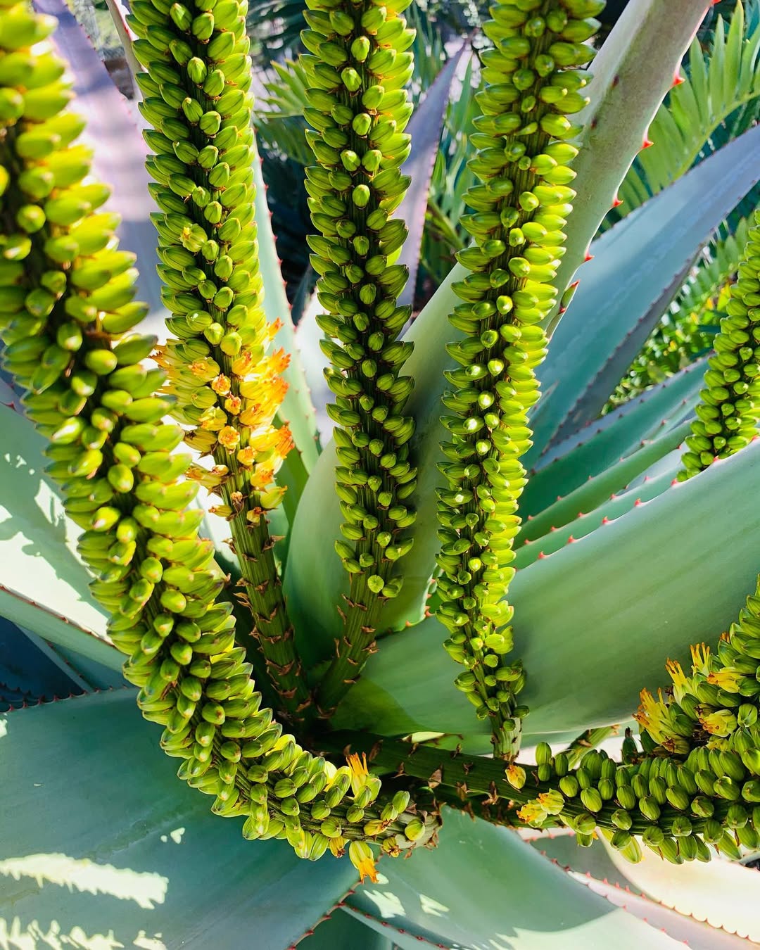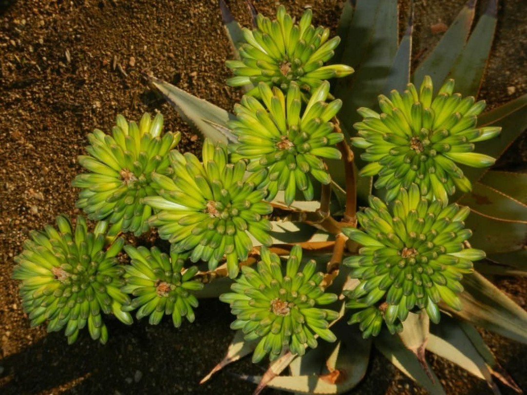 Aloe viridiflora通常为无茎或极短茎的物种,形成密集的莲座状叶丛,直径可达1米。叶片呈蓝绿色至浅绿色,形状为披针形狭窄(lanceolate attenuated),长度约40-60厘米,宽度约8厘米,表面光滑或覆有粉霜(glaucous),带有清晰的纹理线条,无斑点,边缘有粉红色或红褐色的齿状突起(pungent reddish-brown teeth),齿长约2毫米,间隔2-5毫米。叶片肉质厚实,用于储存水分,在干旱压力下可保持光泽。花序为分枝的总状花序(up to 6 branches),从叶丛中心伸出,高约1.5米,花梗直立。花朵呈管状或棒状,颜色为绿色(club-shaped green flowers),有时中心偏柠檬黄色(tinged with lemon yellow),长度约33毫米,花梗长20毫米,密集簇生于10厘米长的穗状花序中,早春至夏季开放。花期后形成干燥的种子荚,种子传播依赖风或动物。植株整体生长缓慢,成年植株可能产生少量侧芽,形成小群落。变异性包括花色从绿色到黄色,叶色取决于环境条件。