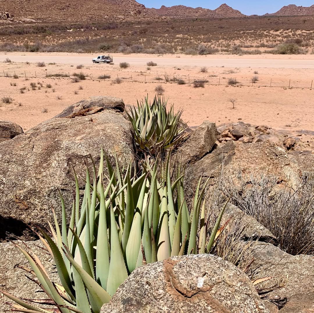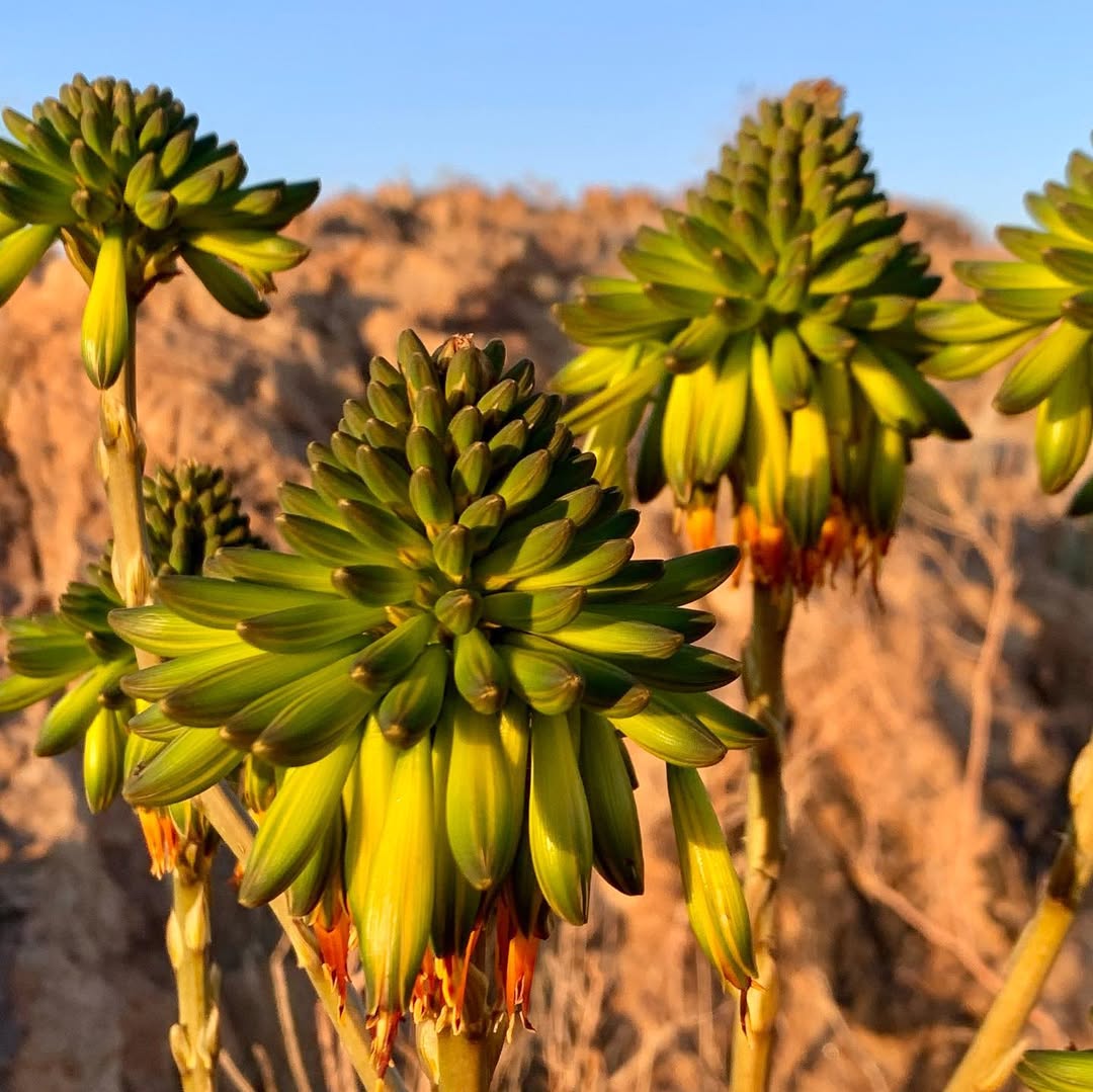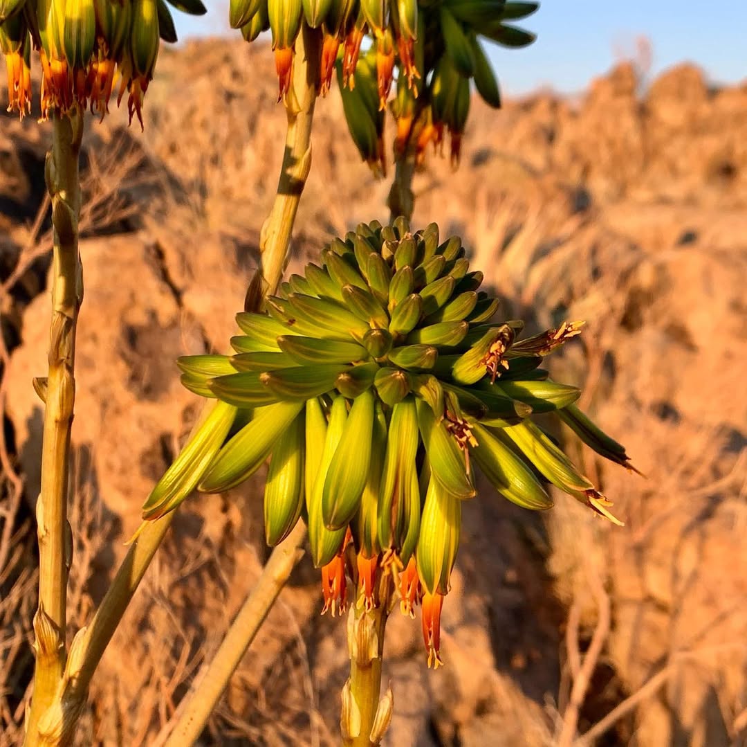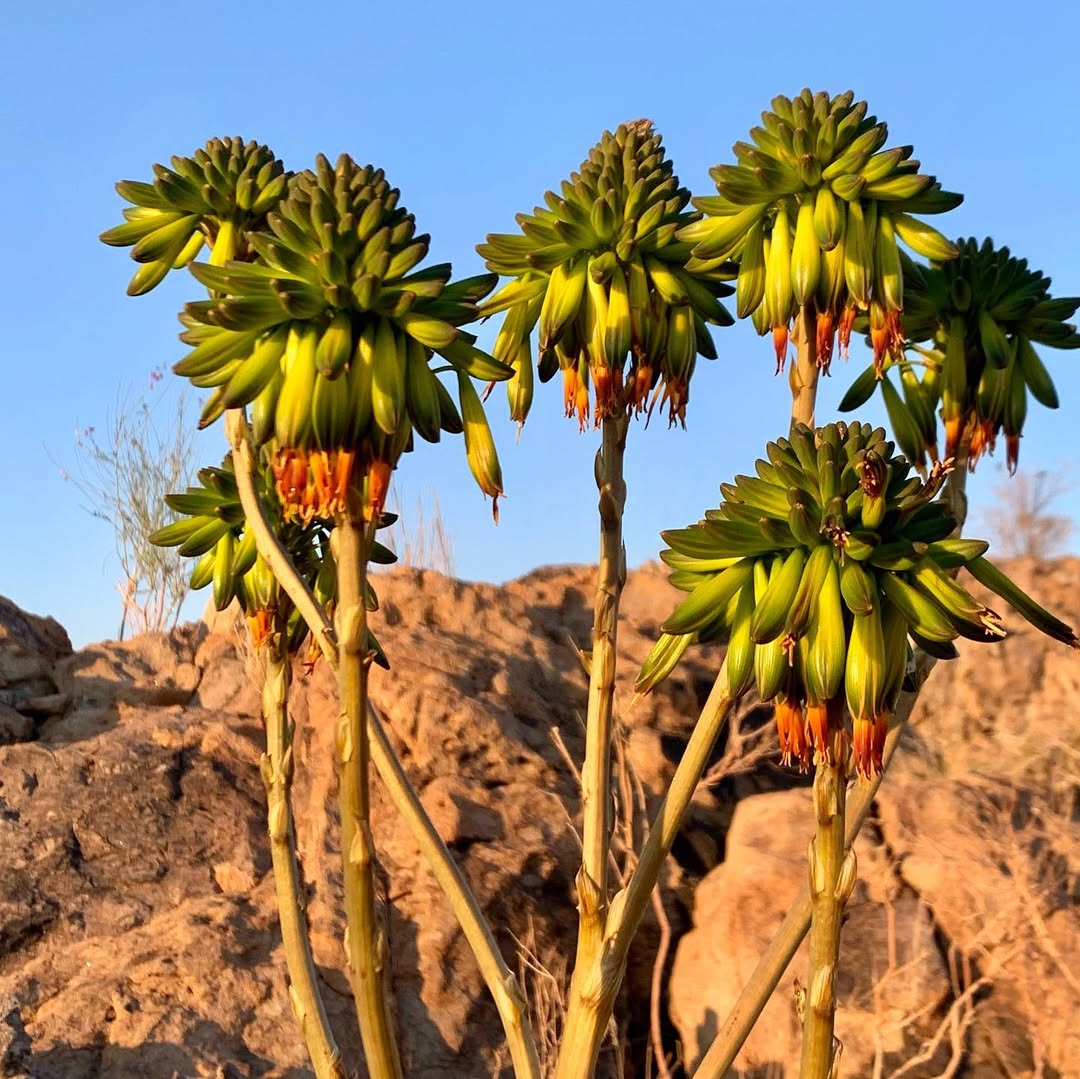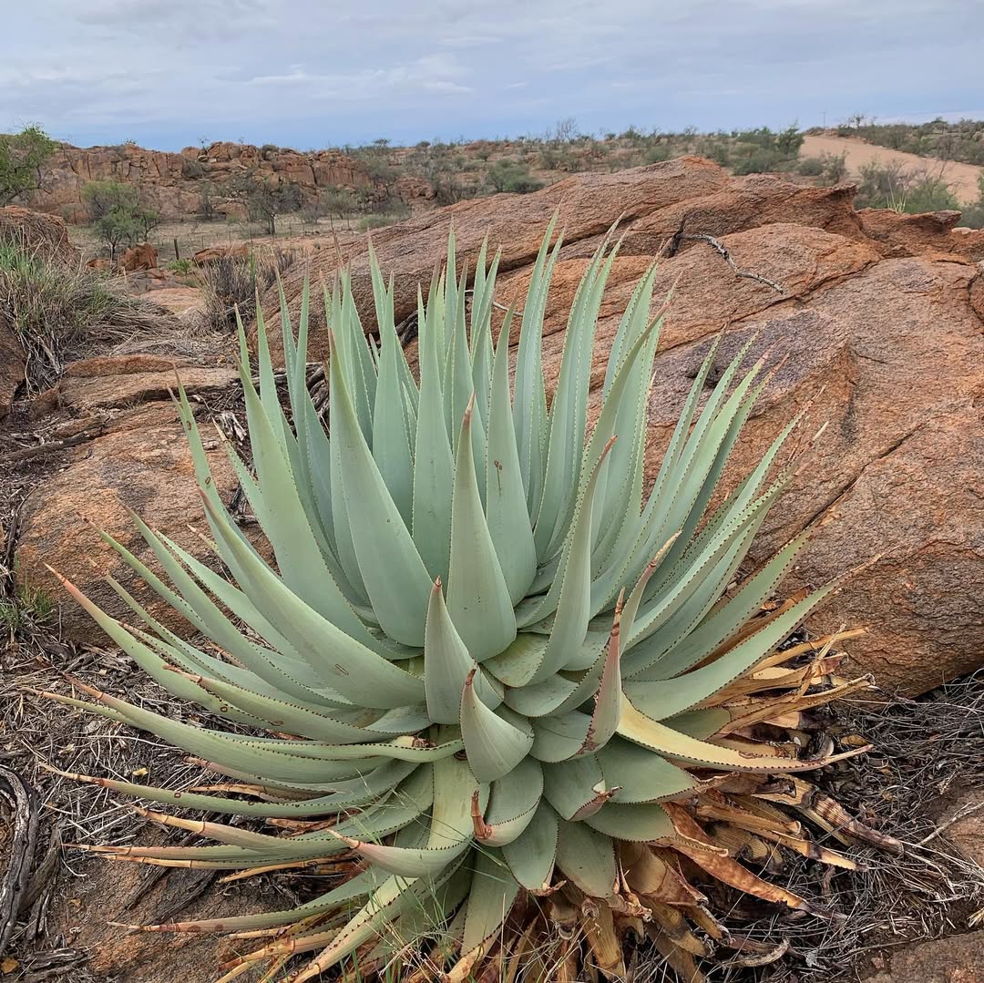 Aloe viridiflora是纳米比亚的特有种,主要分布在干燥稀树草原(dry savanna)、热带干灌木丛(subtropical or tropical dry shrubland)和岩石区(rocky areas),海拔范围从低地到中等高度。该种生长在沙漠或干旱灌木丛生物群落中,偏好排水良好的砂质或石质土壤,受季节性雨季影响,年降雨量约200-500毫米,旱季漫长,温度在15-35°C之间波动。它常与当地其他多肉植物共生,形成局部生态系统,分布范围广泛(发生范围>20,000 km²),至少有六个已知种群,但种群密度较低。野生植株多见于难以接近的山区,避免人类干扰。