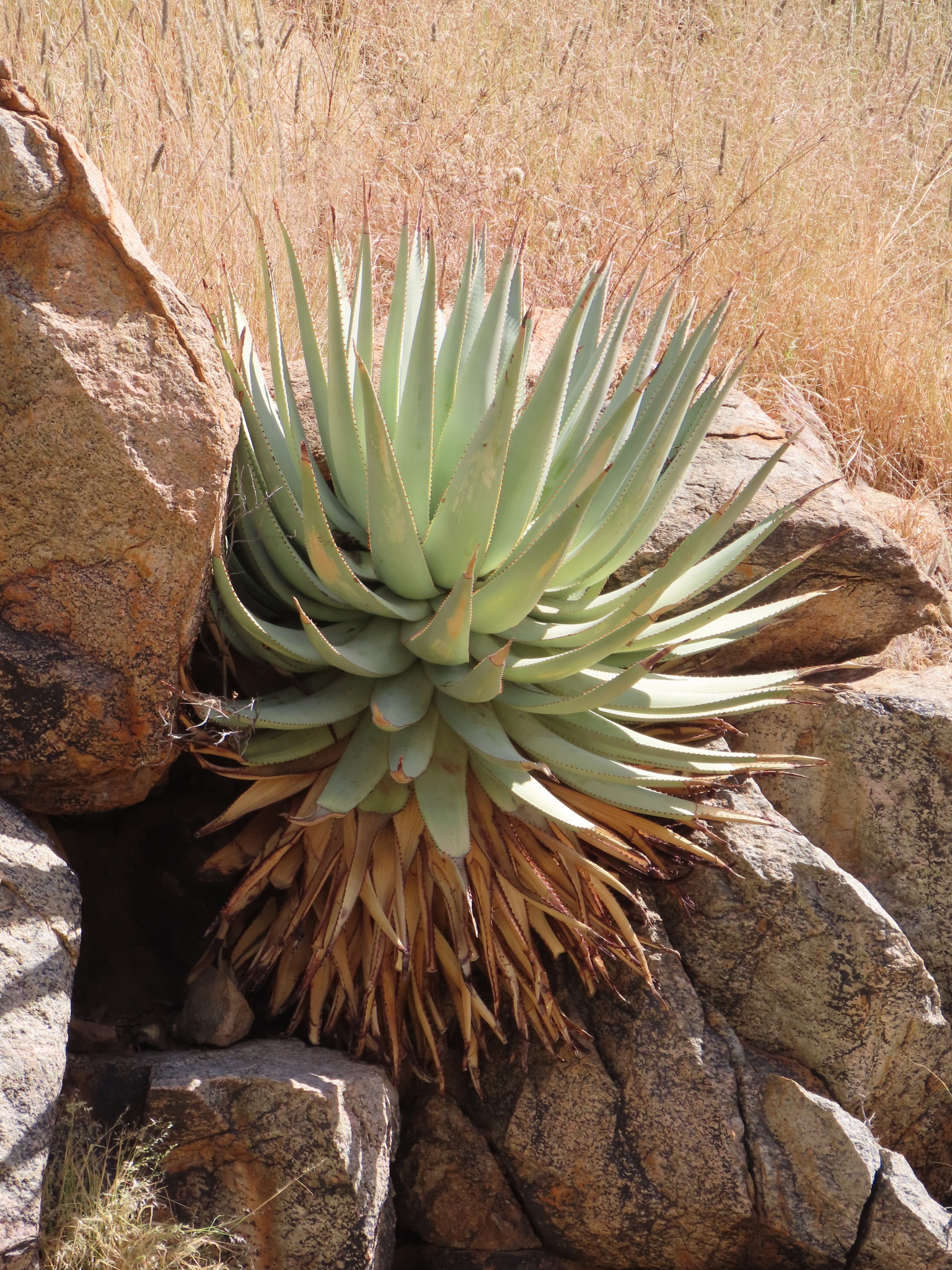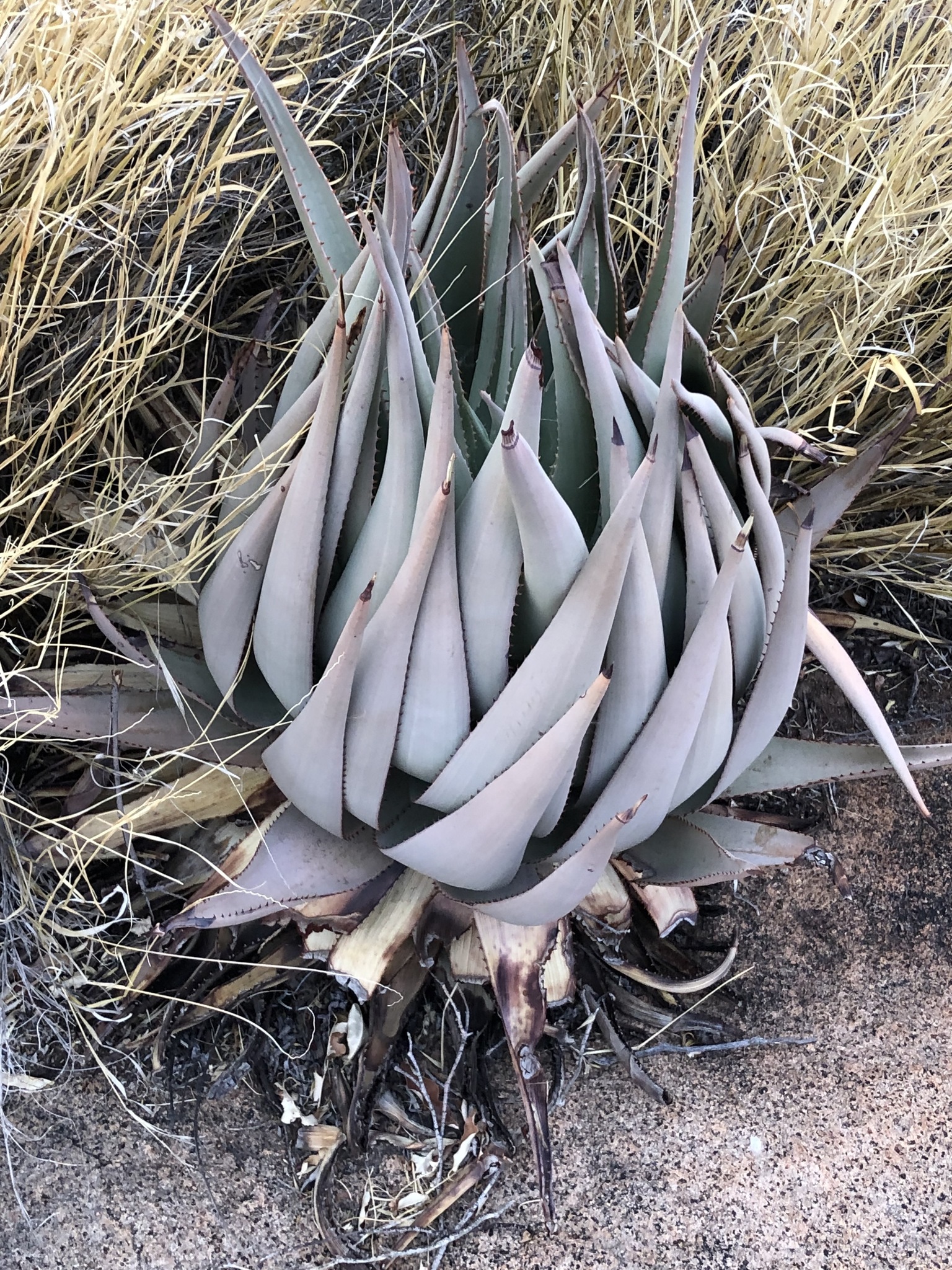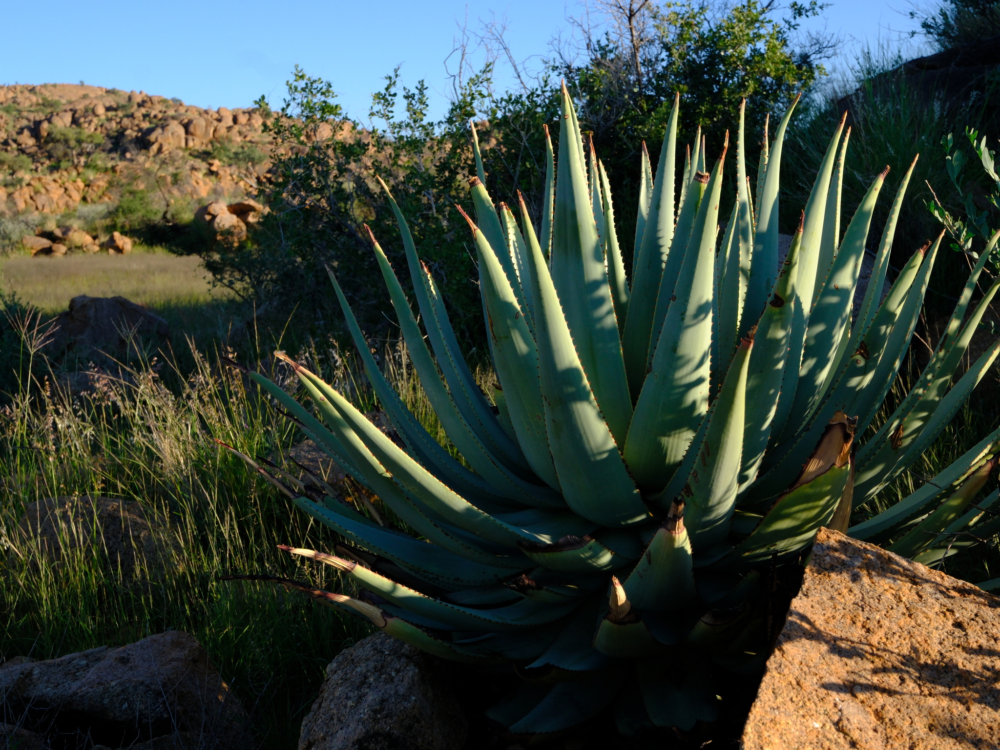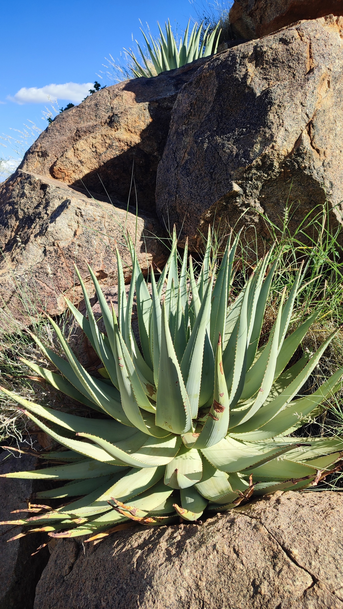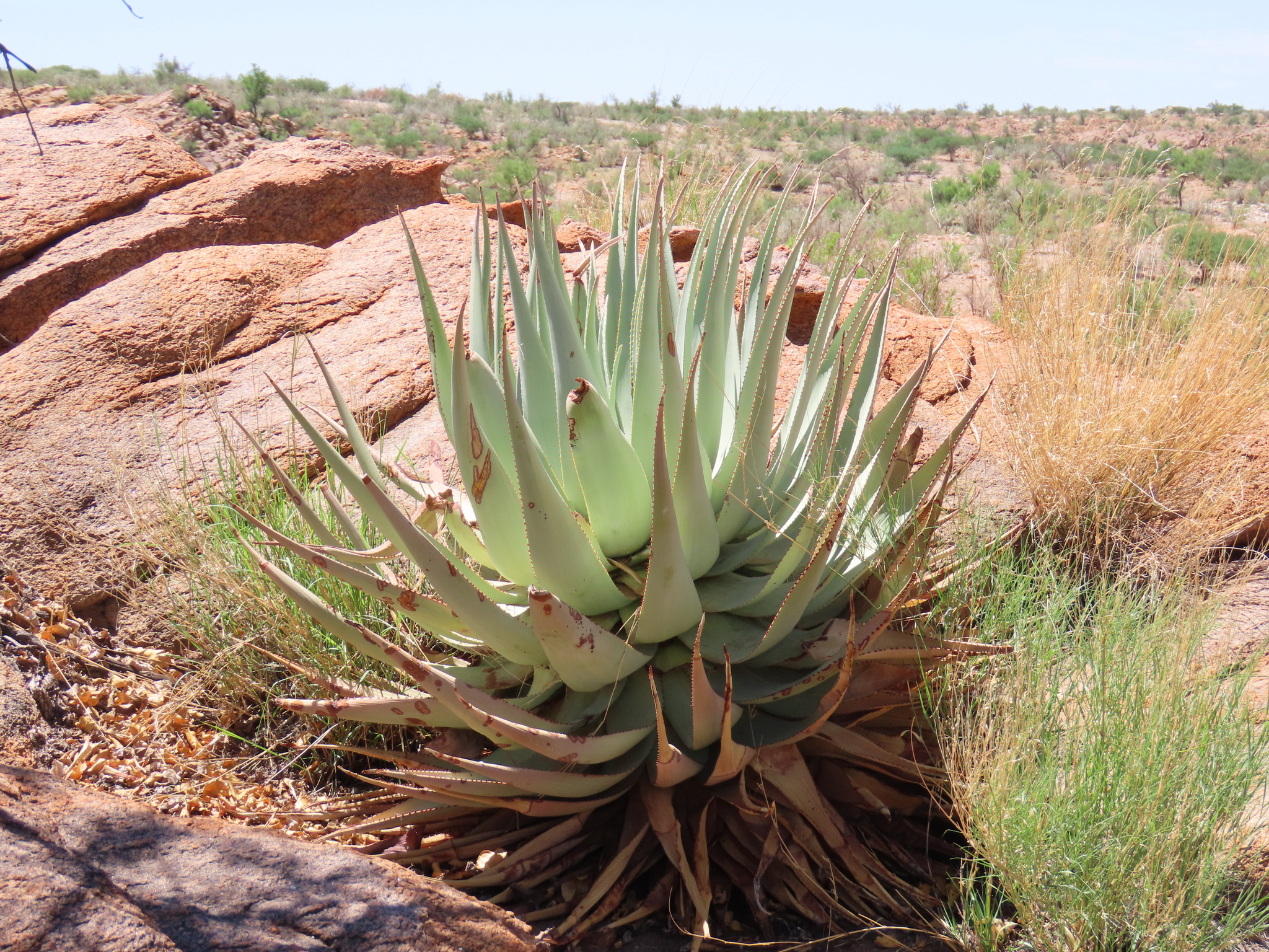 Aloe viridiflora是纳米比亚的特有种,主要分布在干燥稀树草原(dry savanna)、热带干灌木丛(subtropical or tropical dry shrubland)和岩石区(rocky areas),海拔范围从低地到中等高度。该种生长在沙漠或干旱灌木丛生物群落中,偏好排水良好的砂质或石质土壤,受季节性雨季影响,年降雨量约200-500毫米,旱季漫长,温度在15-35°C之间波动。它常与当地其他多肉植物共生,形成局部生态系统,分布范围广泛(发生范围>20,000 km²),至少有六个已知种群,但种群密度较低。野生植株多见于难以接近的山区,避免人类干扰。