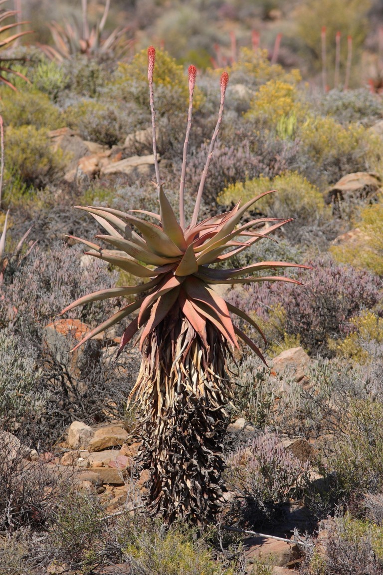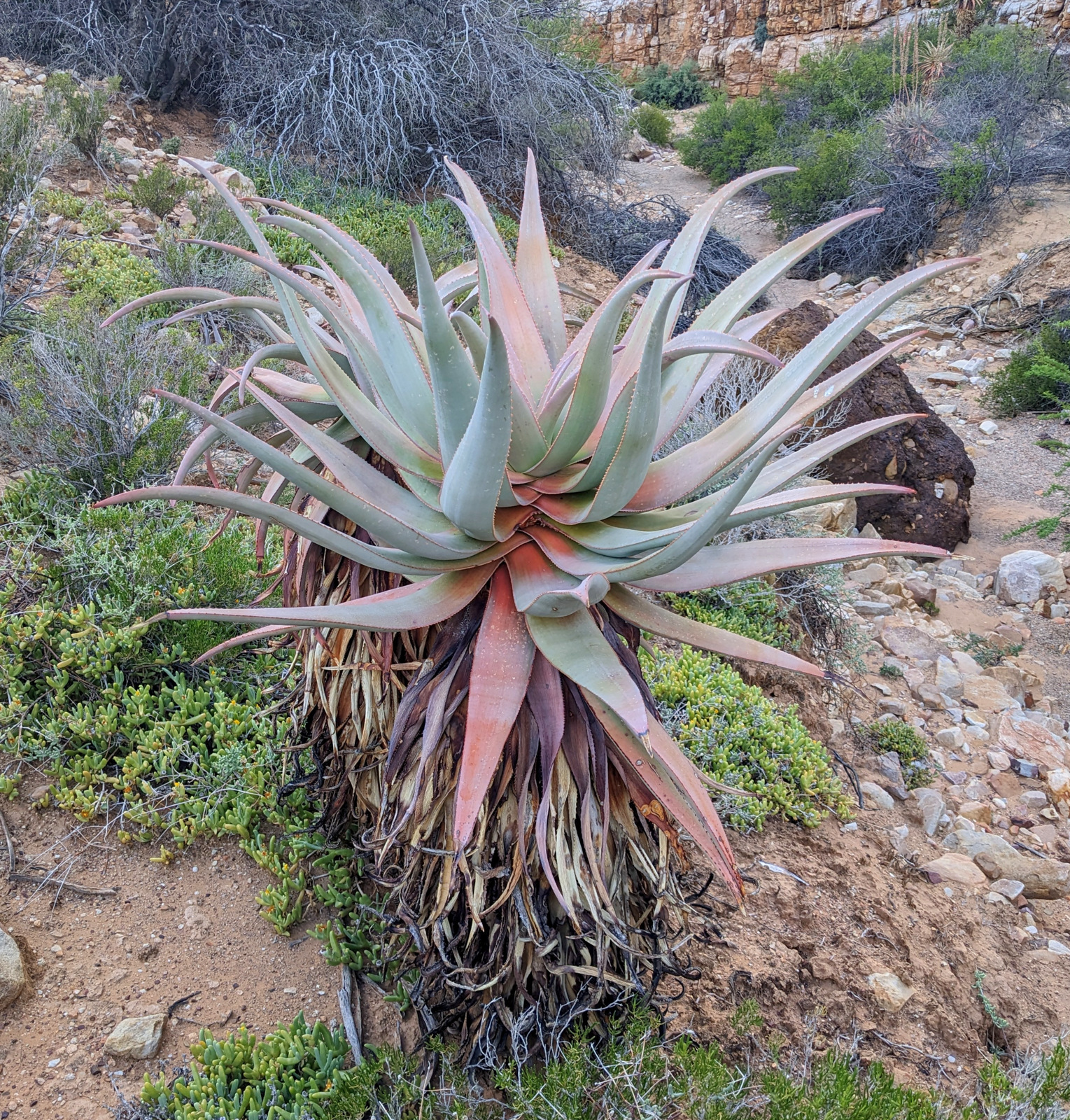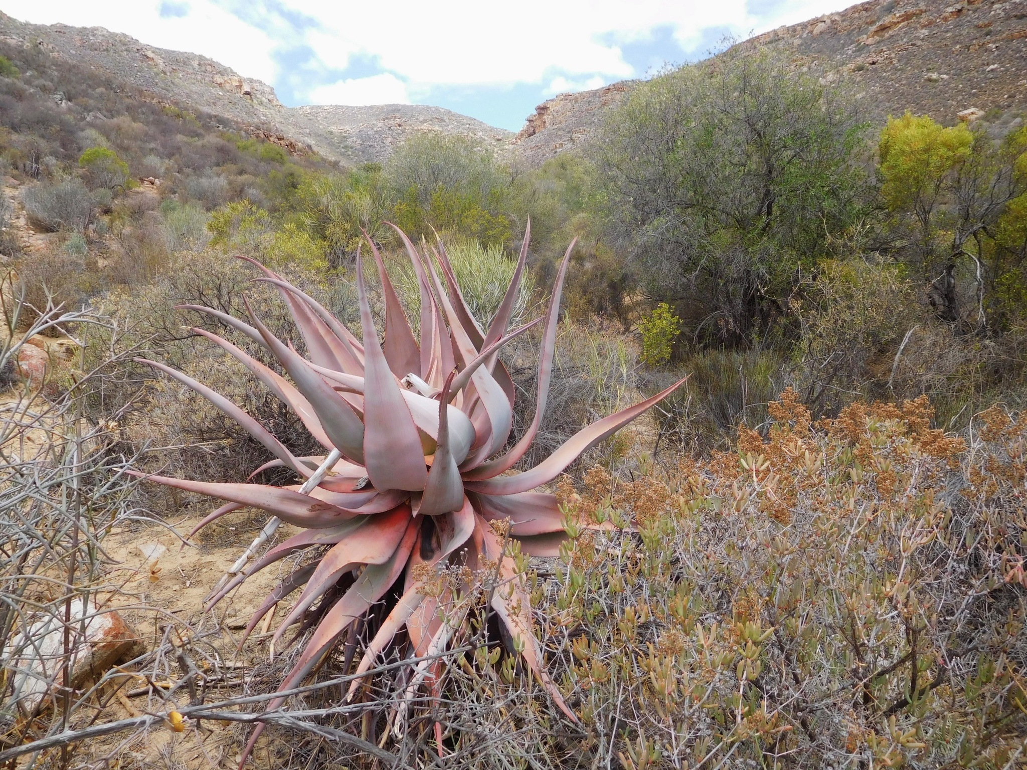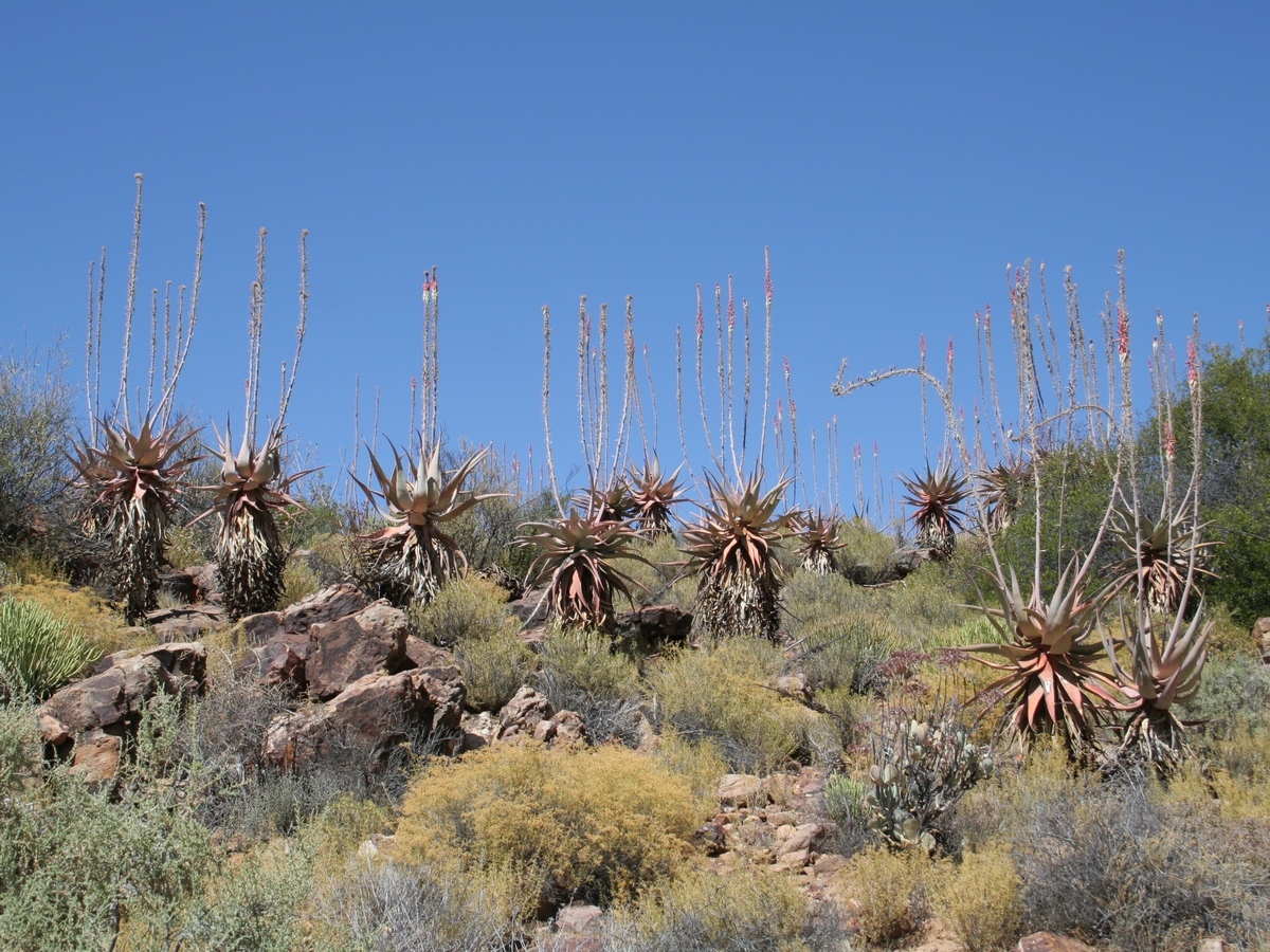 Aloe comosa是南非的特有种,主要分布在西开普省的Olifants River Valley,位于Clanwilliam以北,延伸到Cederberg Mountains附近。该种生长在非常干燥、多岩石的地方,如岩石砂岩斜坡、岩石山谷和平坦的石质地面,海拔约300-600米(1,000-2,000英尺)。这些栖息地为干燥喀鲁类型,年降雨量低(约200-400毫米),主要集中在冬季,土壤贫瘠、排水良好,常与Cotyledon或其他多肉植物共生,形成小群落。分布范围受限,发生面积(EOO)约5,051平方公里,种群密度低,但局部健康。