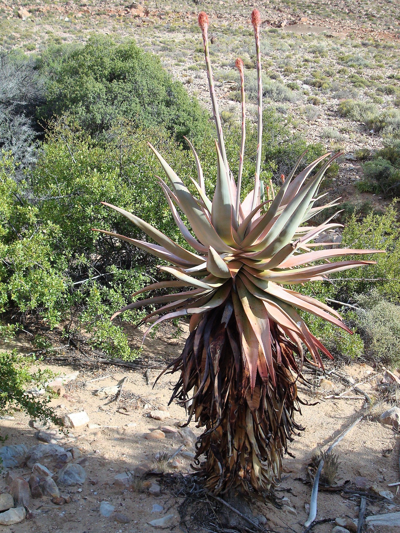 是一种南非特有芦荟属植物,原产于西开普省(Western Cape)的Olifants River Valley,位于Clanwilliam以北。该物种生长在非常干燥、多岩石的地方,如岩石砂岩斜坡和岩石山谷,常形成小群落。它是一种树状芦荟,保留枯叶以保护茎干免受阳光、寒冷和动物侵害,同时提供防火屏障。该植物每个莲座丛产生1-3个细长的总状花序,简单(偶尔分枝),非常高(1-3米),花紧紧压在茎上,形成一个密集的穗状花序,高达2.5米,直径约20厘米,穗状花序特点是双色,下部浅乳白色,上部较深的粉红色。苞片长达40毫米。花绿白色或象牙色(偶尔深粉红色),长达40毫米,基部略窄,子房扩大,中间收缩,直径12毫米。花梗长约20毫米,几乎直立。花被片几乎游离,长约200毫米。雄蕊和雌蕊突出约10-12毫米。开花季节为南半球夏季(12月至1月)。作为一种稀有物种,它适合作为观赏植物栽培,但由于栖息地破坏和非法采集,需要注意保护。