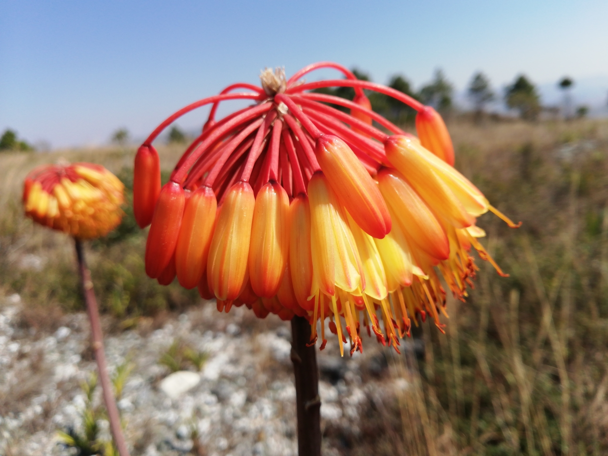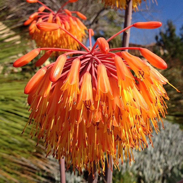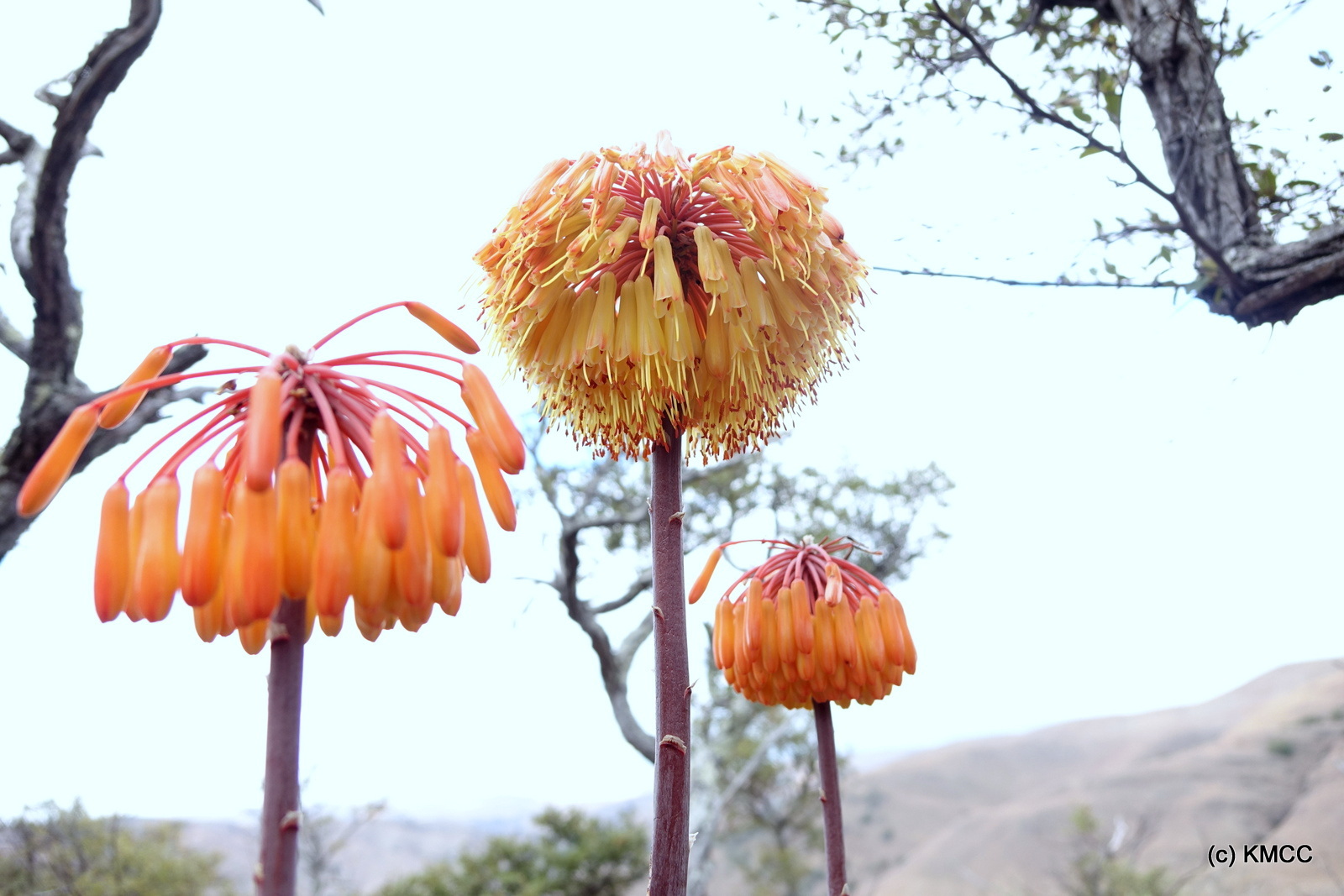 是一种无茎芦荟,原产于马达加斯加中部高原南部的石英岩土壤地区,生长海拔在3200至5200英尺之间。其学名中的“capitata”指的是头状的花簇,而变种名“quartziticola”则表明它生长在石英岩基质上。该植株形态独特,有着紧密却又相对开阔的莲座状叶丛,通常为单生。叶片呈灰绿色,肉质厚实,宽约2英寸,长12至18英寸,叶片可能会带有蓝调、粉色甚至深红色的红晕,边缘为红色,还长有小而尖锐的棕色锯齿。每年仲冬时节,这种植物会绽放出极为壮观的花朵。花序可高达3英尺,顶端是密集的球形头状总状花序,直径约4英寸,由橙红色的花梗支撑着橙色的花苞。花朵呈窄钟形,长约1英寸,开放时从花序顶部附近开始,花色为橙黄色,明艳动人。在种植方面,该芦荟变种适应能力较强。它可以种植在全日照至部分日照,或有轻微遮荫的环境中,土壤需排水良好。浇水频率无需过高,偶尔浇灌即可。与大多数马达加斯加芦荟相比,它更为耐寒,能够短时间耐受低至25°F的低温,在核桃溪市的露丝·班克罗夫特花园,甚至经受住了20°F的低温考验。这使它在许多地区都能作为独特的观赏植物进行栽培。这种植物是极具观赏性的植物,开花时尤为惊艳。无论是在花园中作为点缀,还是在容器中栽培,都能展现出独特的魅力。