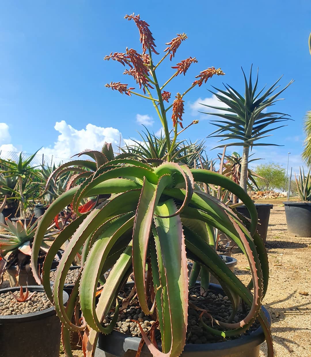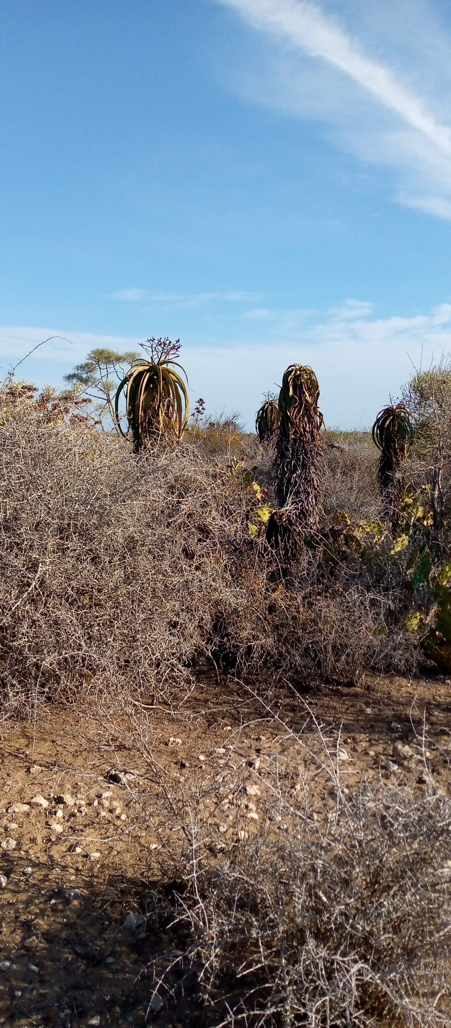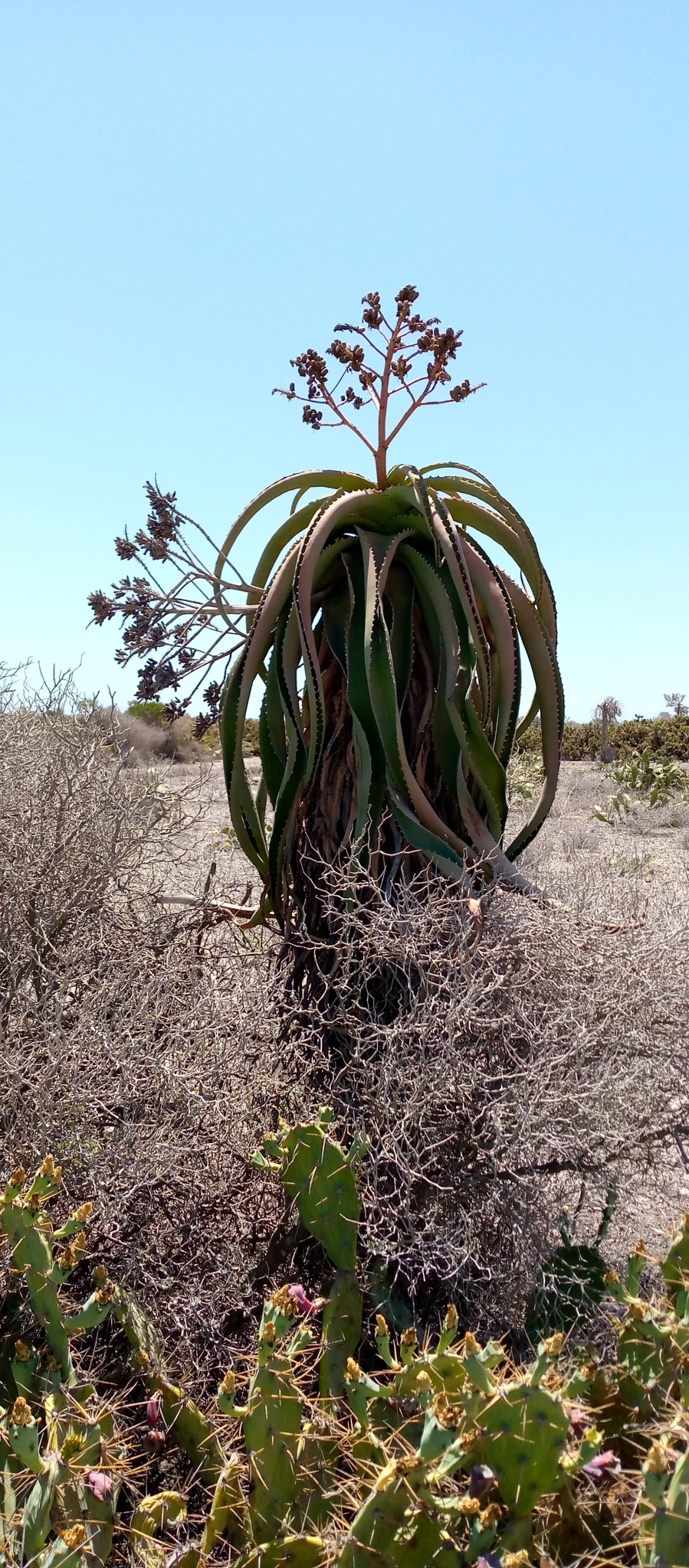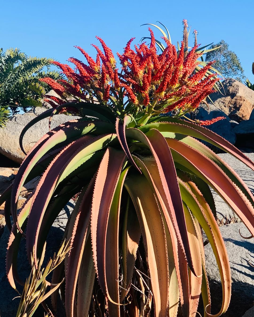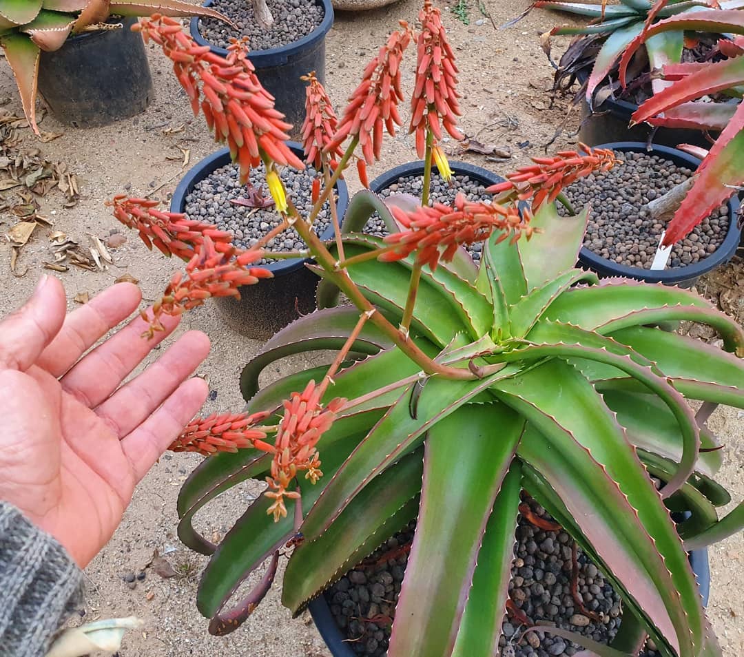 Aloe vaotsanda通常为中等大小的树状芦荟,成年植株高度2-4米(偶达5米),茎短而细长,常弯曲或匍匐,直径约10-15厘米。叶片形成冠状叶丛,多达40片,叶片上升、蓝绿色至灰绿色(偶有红色调),表面具明显瘤状突起(tubercles),提供纹理感;叶片披针形(lanceolate),长达100厘米(40英寸),宽15厘米(6英寸),强烈反折(recurved),肉质厚实,用于储存水分;边缘具小齿状突起或刺,长5-6毫米,间隔15毫米,红色或红棕色,作为防御机制。叶汁干燥呈黄褐色。花序从叶丛中心伸出,高约50厘米,多分枝(许多分枝再分枝),总状花序密集,具50-70朵花;花苞三角形渐狭,长7-8毫米,宽3毫米;花梗长4-6毫米;花被橙黄色,长约22毫米,管状,基部圆形,吸引传粉者如昆虫或鸟类。花期主要在南半球夏季(约11-2月)。果实为蒴果,长圆形;种子有翅。植株整体孤立生长,生长缓慢,长寿,变异性主要在叶色从蓝绿到红调和表面瘤突起密度上,取决于光照和水分。