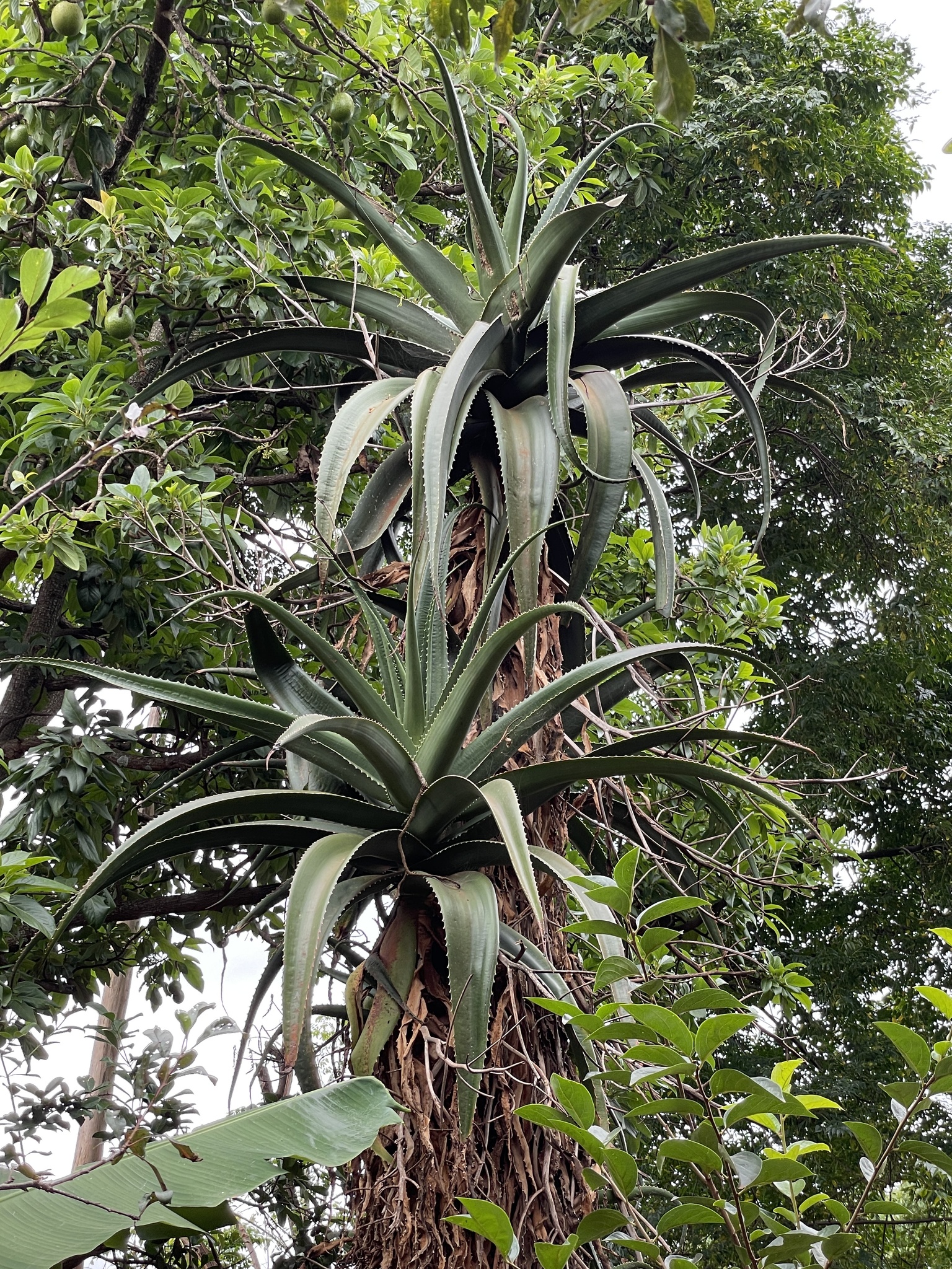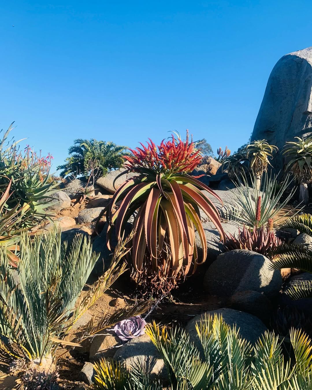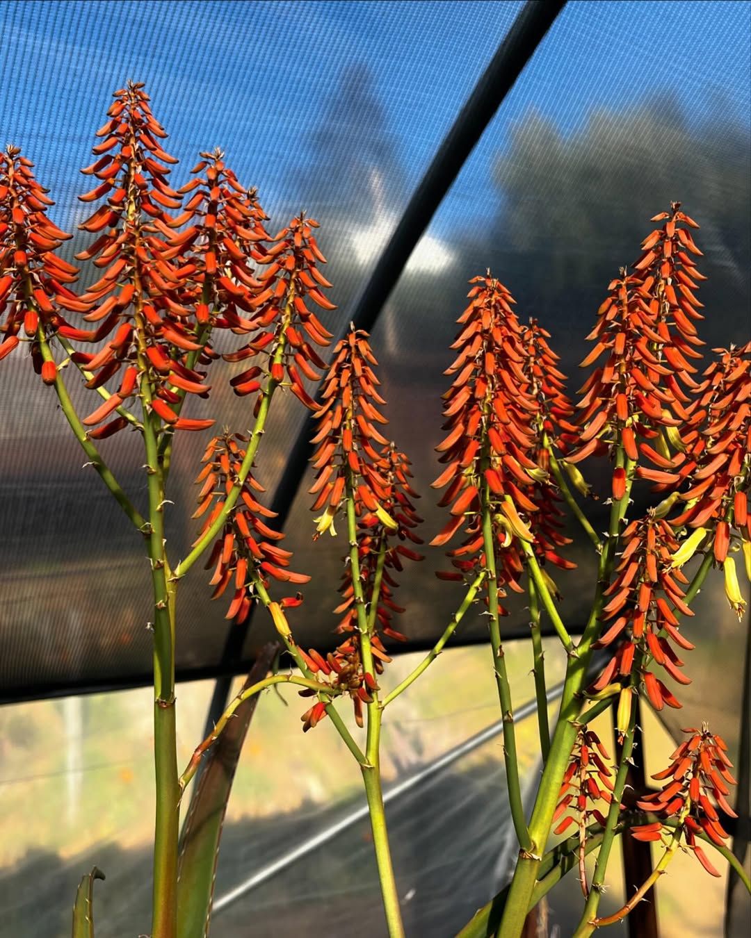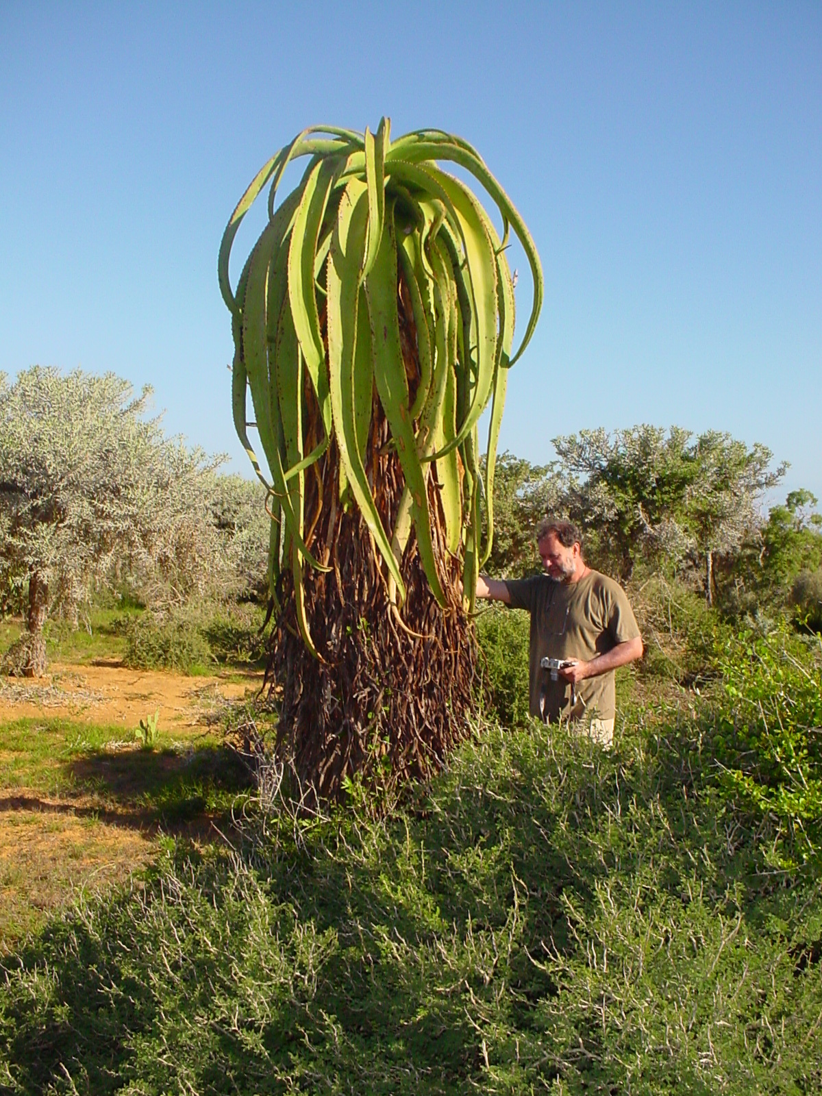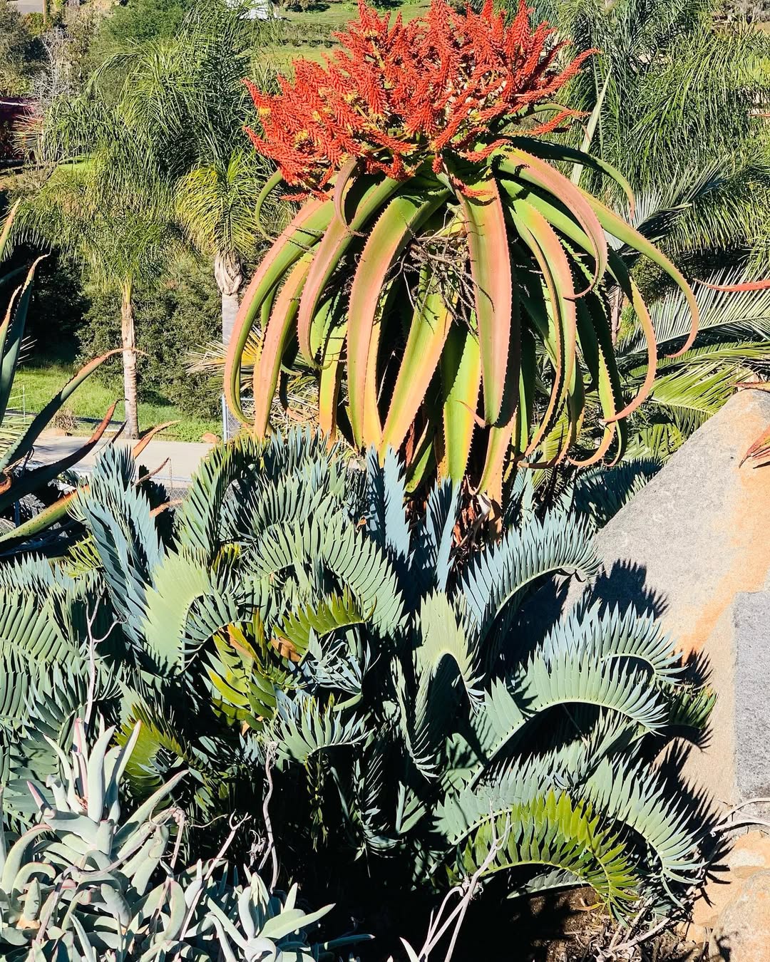 Aloe vaotsanda通常为中等大小的树状芦荟,成年植株高度2-4米(偶达5米),茎短而细长,常弯曲或匍匐,直径约10-15厘米。叶片形成冠状叶丛,多达40片,叶片上升、蓝绿色至灰绿色(偶有红色调),表面具明显瘤状突起(tubercles),提供纹理感;叶片披针形(lanceolate),长达100厘米(40英寸),宽15厘米(6英寸),强烈反折(recurved),肉质厚实,用于储存水分;边缘具小齿状突起或刺,长5-6毫米,间隔15毫米,红色或红棕色,作为防御机制。叶汁干燥呈黄褐色。花序从叶丛中心伸出,高约50厘米,多分枝(许多分枝再分枝),总状花序密集,具50-70朵花;花苞三角形渐狭,长7-8毫米,宽3毫米;花梗长4-6毫米;花被橙黄色,长约22毫米,管状,基部圆形,吸引传粉者如昆虫或鸟类。花期主要在南半球夏季(约11-2月)。果实为蒴果,长圆形;种子有翅。植株整体孤立生长,生长缓慢,长寿,变异性主要在叶色从蓝绿到红调和表面瘤突起密度上,取决于光照和水分。