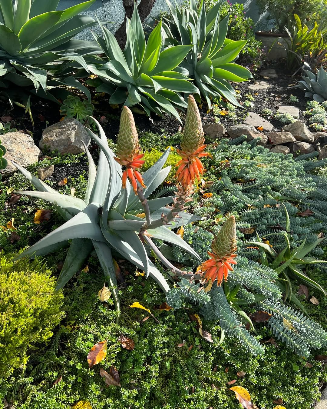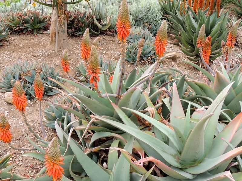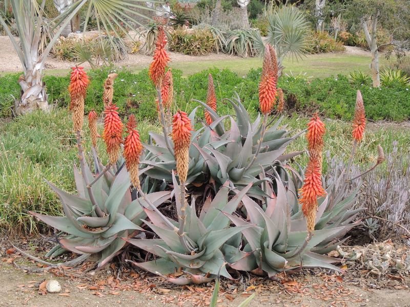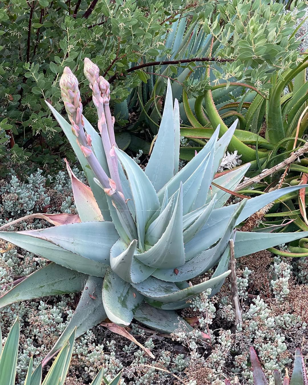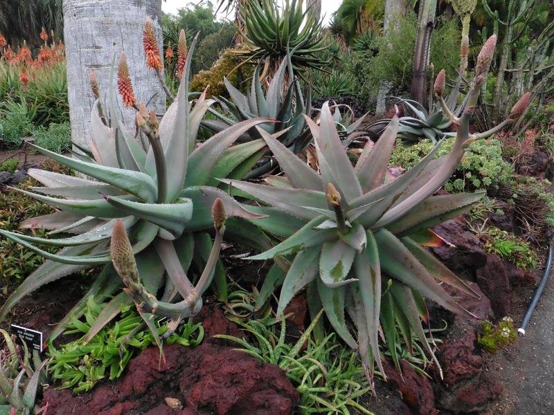 Aloe rubroviolacea通常为无茎或极短茎的单生莲座状植物,形成2-3英尺高(60-90厘米)、4-6英尺宽(120-180厘米)的叶丛。叶片约15-25片,呈三角形或宽披针形,长约30-45厘米(12-18英寸),宽约5-10厘米(2-4英寸),表面光滑蜡质,蓝绿色至灰绿色,在凉爽冬季或干旱胁迫下转为粉红色、紫色或红紫色调(故得名),边缘有小而尖锐的红棕色牙齿,长约1-2毫米,间隔5-10毫米。叶片肉质厚实,用于储存水分,在自然栖息地常呈下垂形态以适应陡坡。花序从叶丛中心伸出,高约1米(3英尺),多分枝;总状花序圆柱形,长约20-30厘米(8-12英寸);花朵橙红色至红色,长约3厘米(1.2英寸),管状,密集排列,吸引传粉者如鸟类和昆虫。花期主要在南半球冬季(约6-8月)。果实为蒴果,长圆形,长约2厘米,直径1厘米;种子有翅。植株生长缓慢,长寿,变异性主要在叶色从蓝绿到红紫,取决于光照和温度。’Violet’品种叶片在冬季更显紫色调。