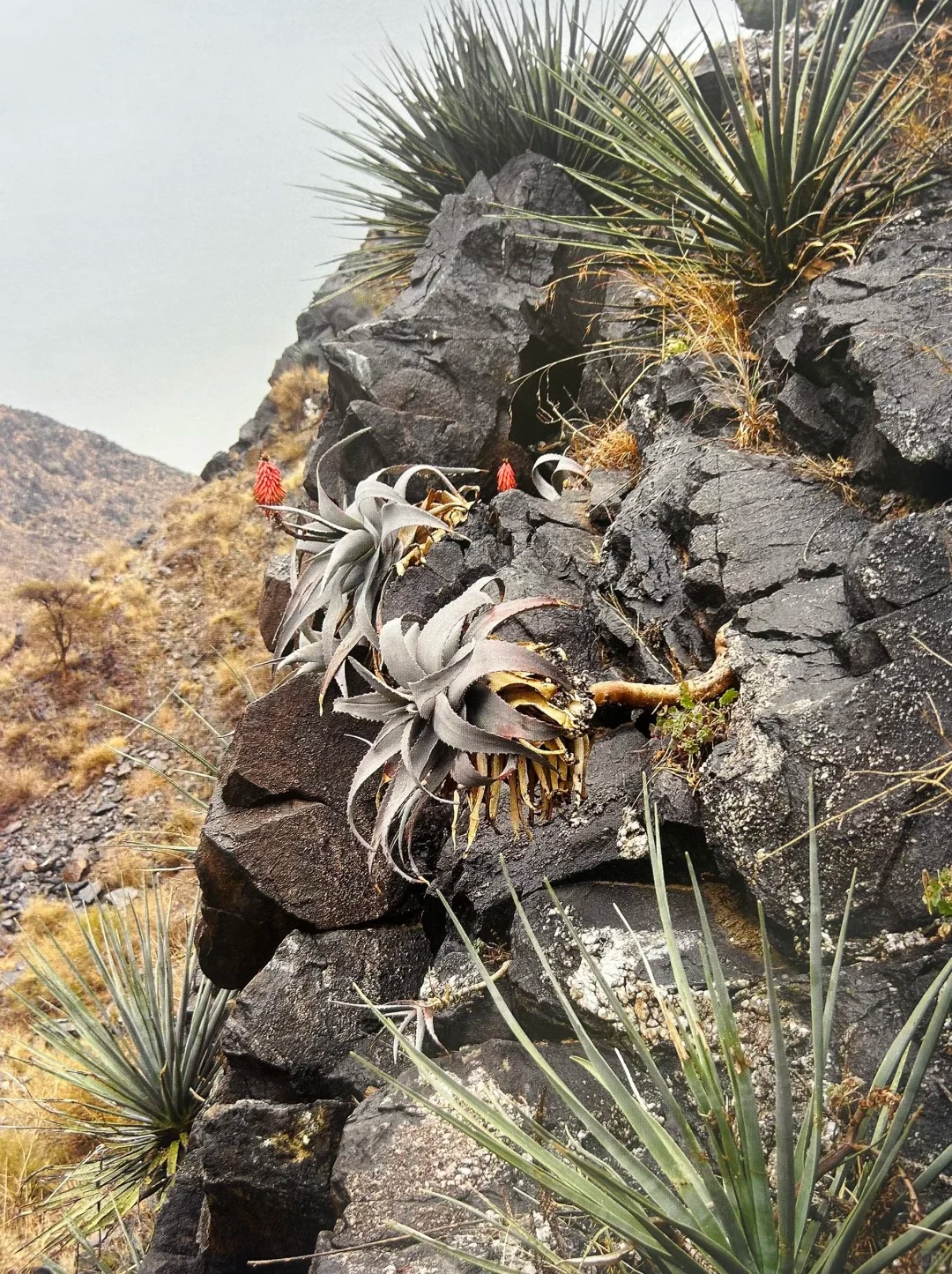 Aloe rubroviolacea是阿拉伯半岛的特有种,主要分布在沙特阿拉伯和也门的山区,海拔2100米以上的陡峭岩石坡地和悬崖。该种生长在干燥的热带生物群落中,土壤贫瘠、排水良好,常呈下垂或半下垂形态以适应坡面,年降雨量较低,受季风影响,旱季漫长高温。植株常出现在岩石裂缝或露头,与其他阿拉伯半岛耐旱植物共生,形成局部微生态系统。分布范围狭窄,总面积有限,导致其对干扰敏感。