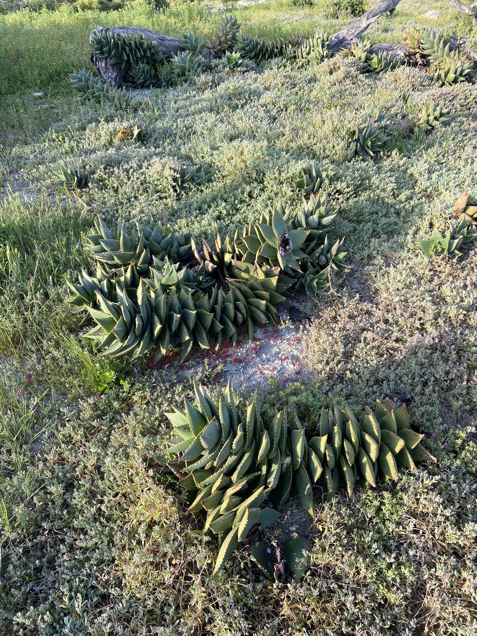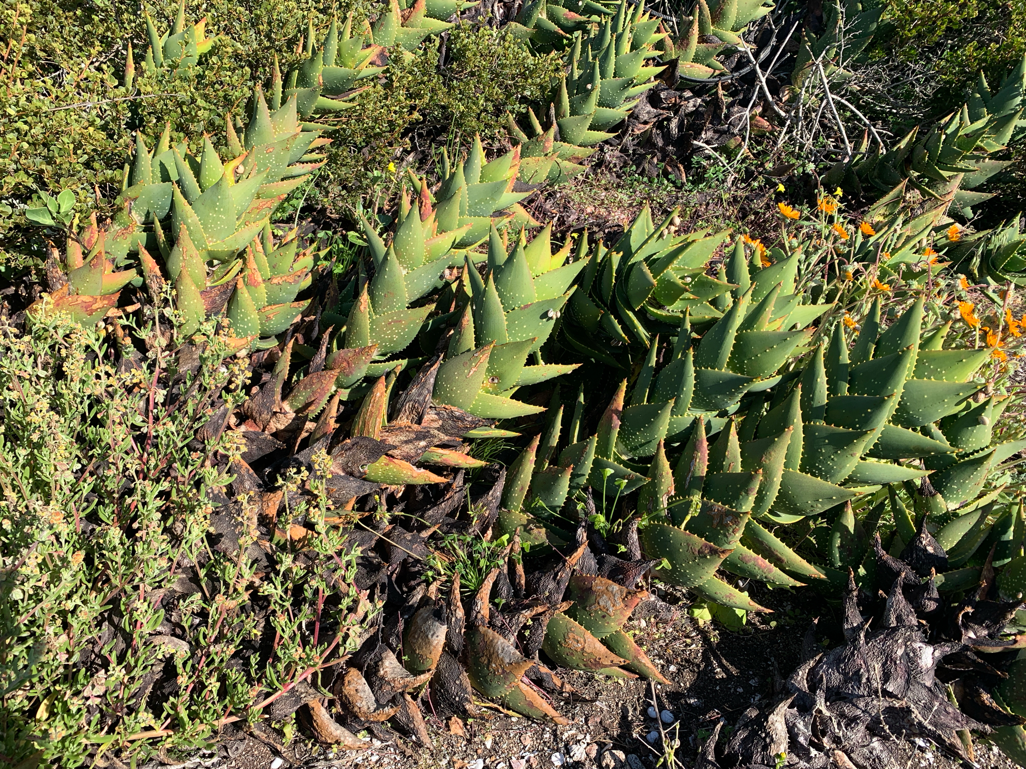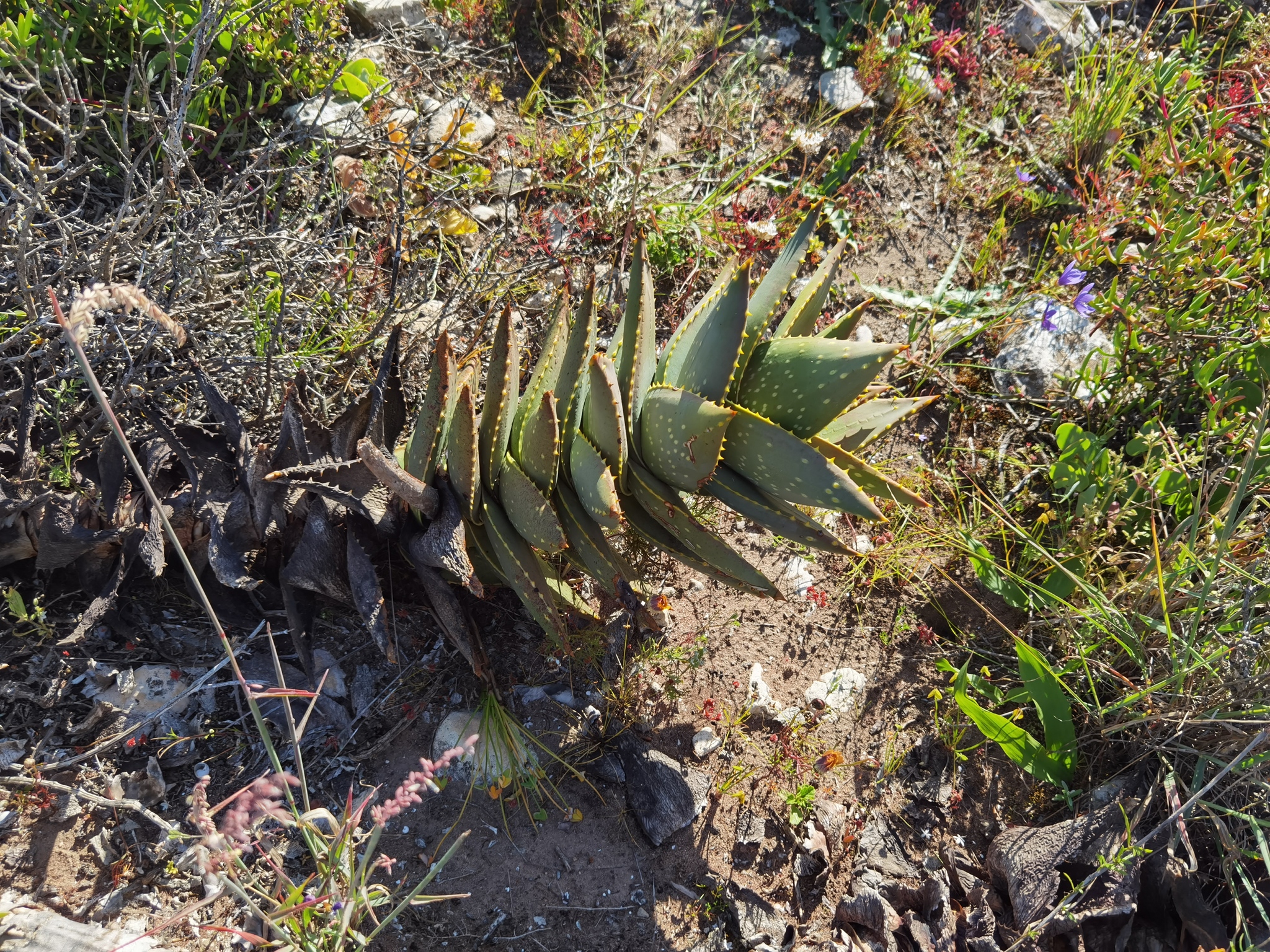 Aloe distans主要分布在南非西开普省的沿海干旱地区,从开普敦半岛向东延伸至乔治(George)一带,海拔0-500米。该种生长在石英岩或砂岩坡地、岩石露头或灌木丛中,土壤贫瘠排水良好,年降雨量约300-600毫米,主要集中在冬季,夏季干旱高温。植株常出现在典型Fynbos和Renosterveld植被中,与其他南非多肉植物共生,形成局部生态系统。分布范围较广,但局部碎片化。