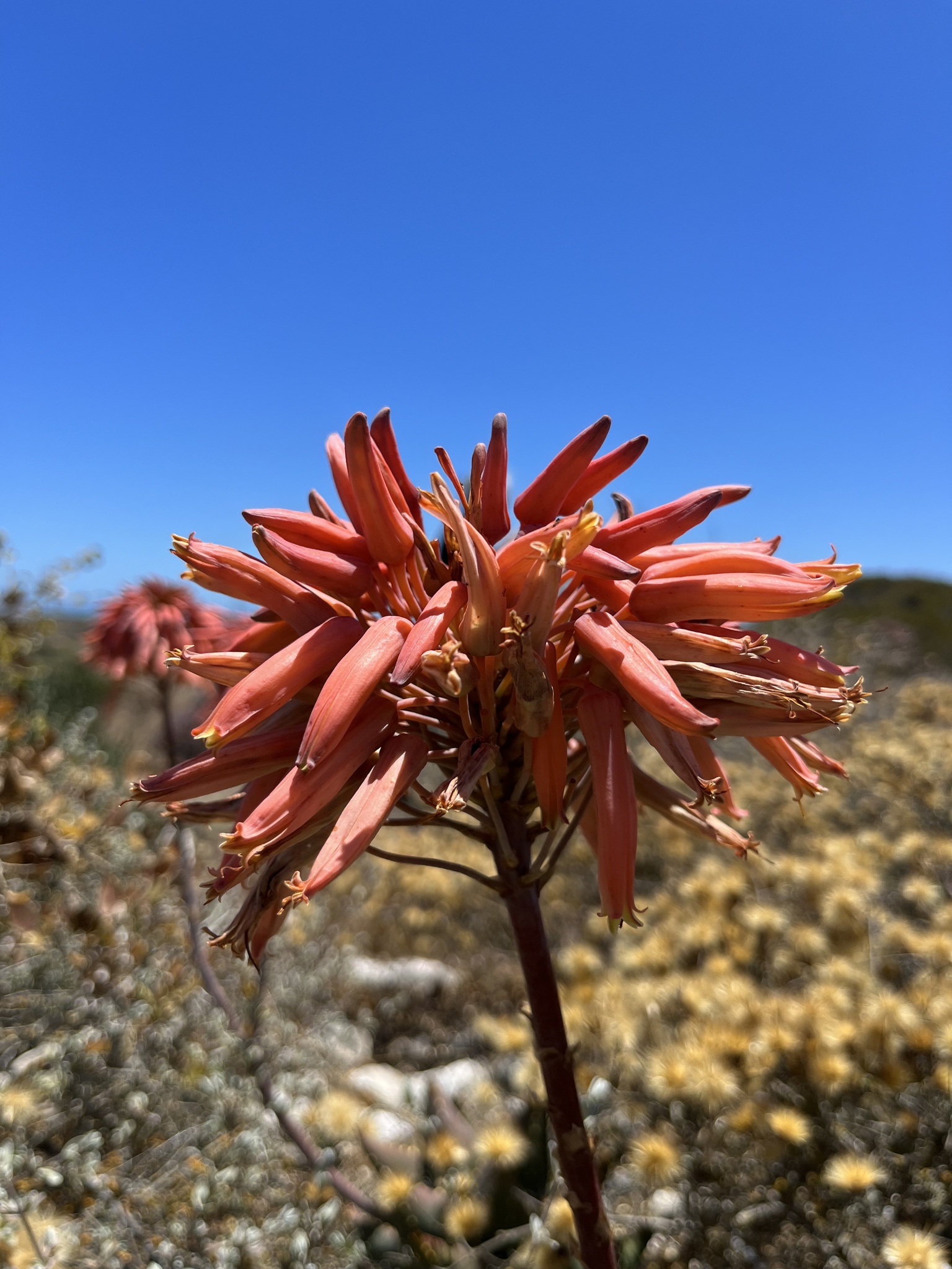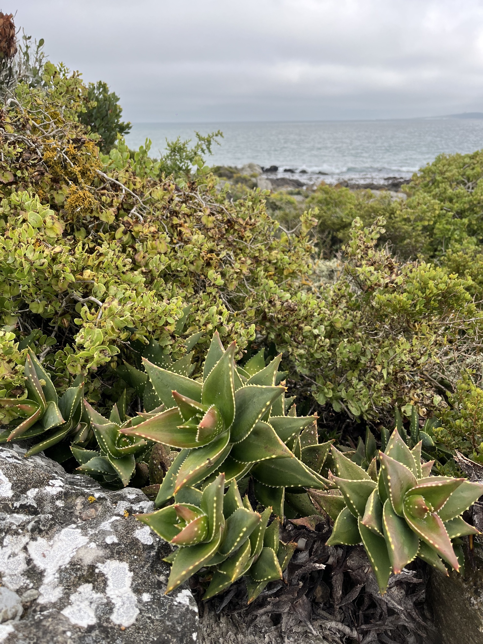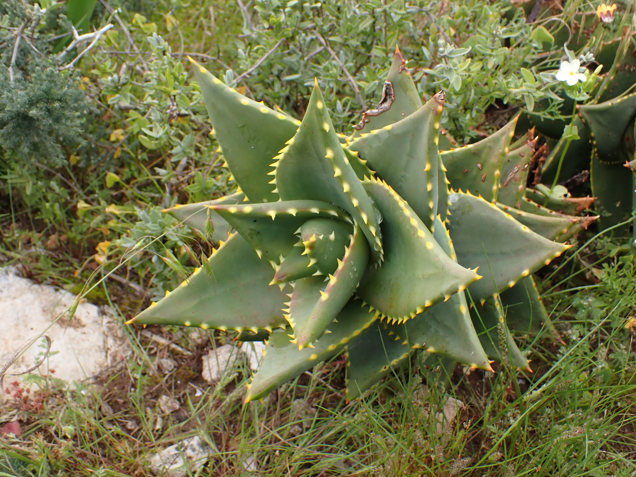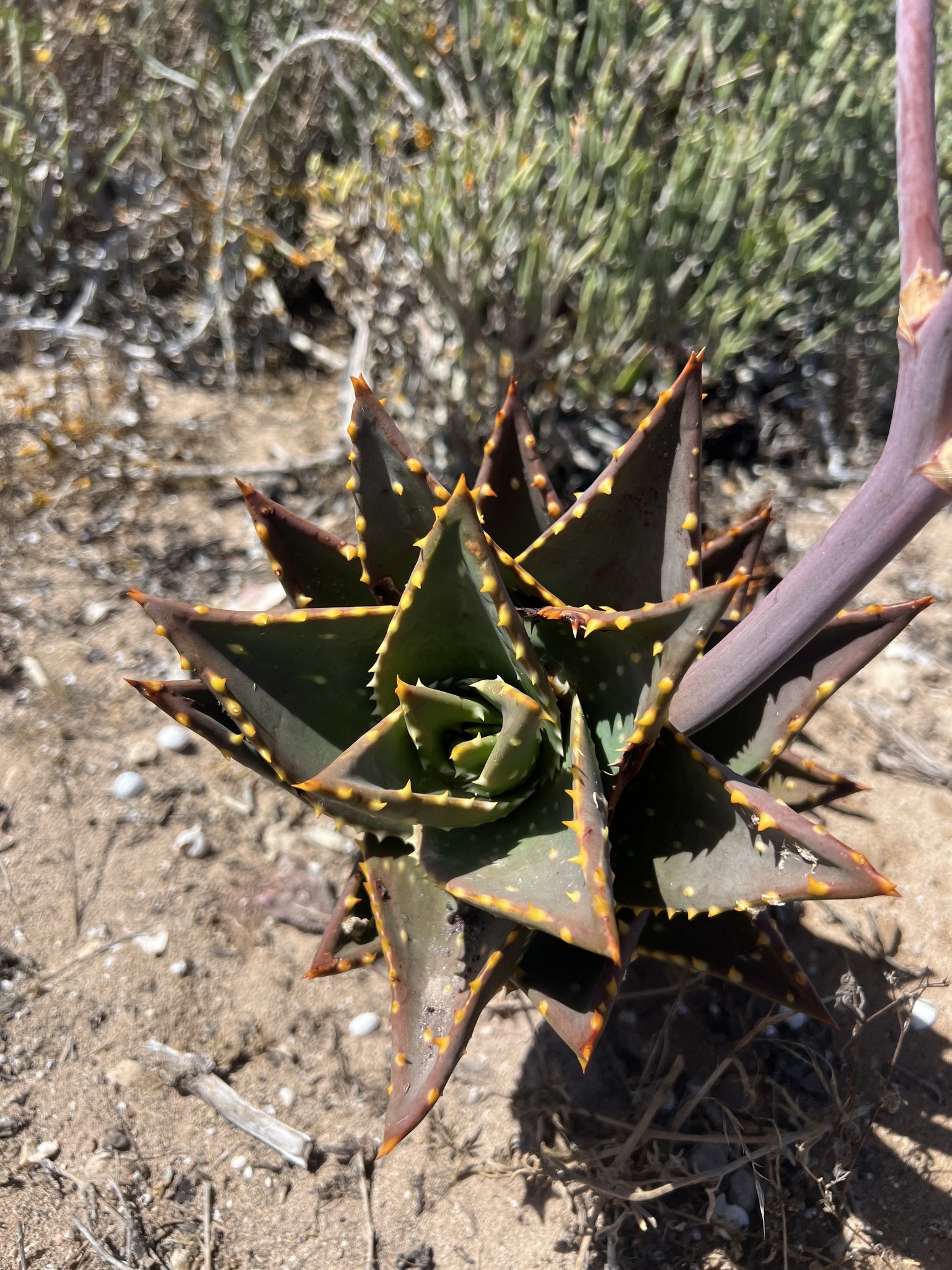 Aloe distans主要分布在南非西开普省的沿海干旱地区,从开普敦半岛向东延伸至乔治(George)一带,海拔0-500米。该种生长在石英岩或砂岩坡地、岩石露头或灌木丛中,土壤贫瘠排水良好,年降雨量约300-600毫米,主要集中在冬季,夏季干旱高温。植株常出现在典型Fynbos和Renosterveld植被中,与其他南非多肉植物共生,形成局部生态系统。分布范围较广,但局部碎片化。