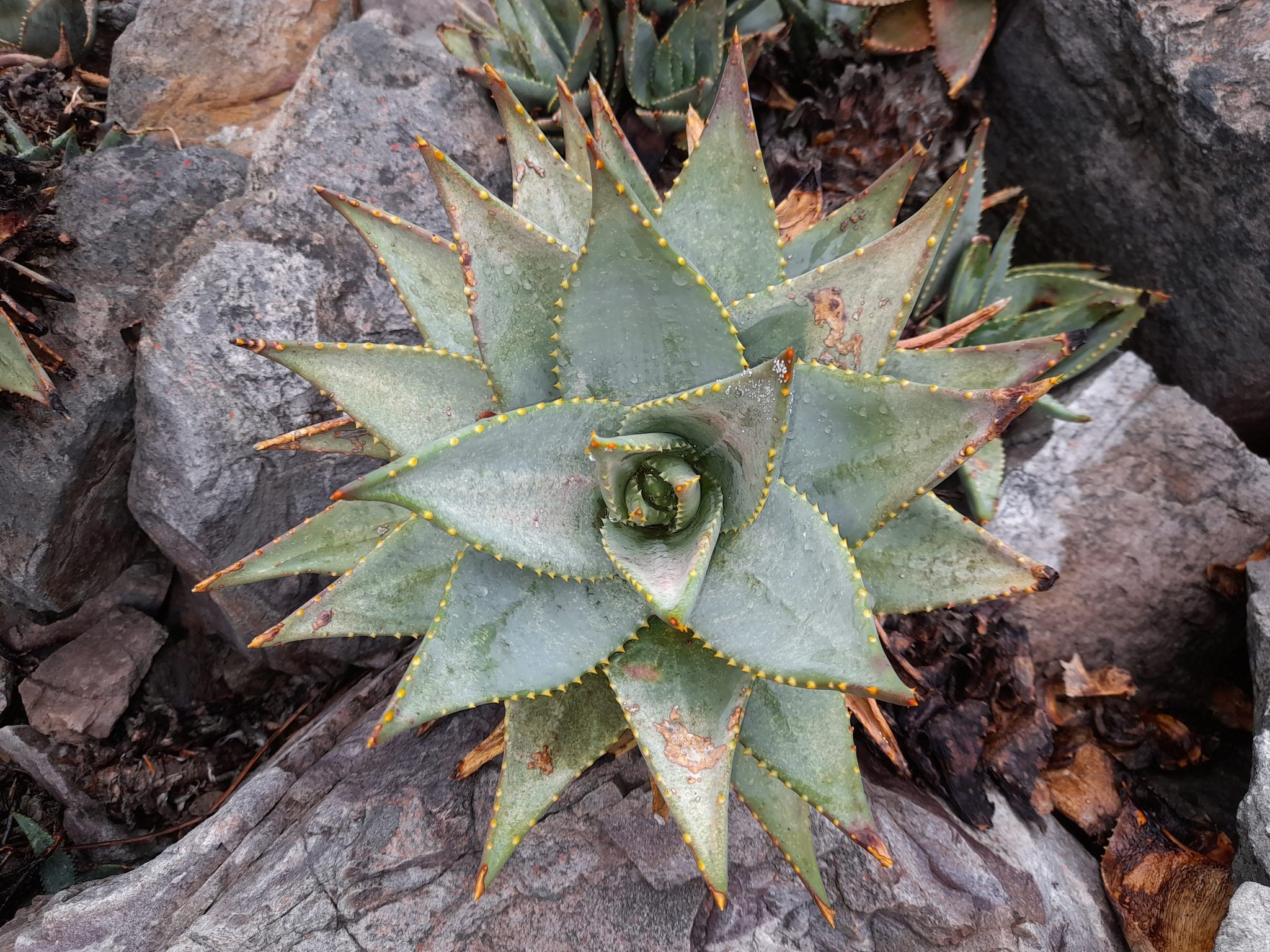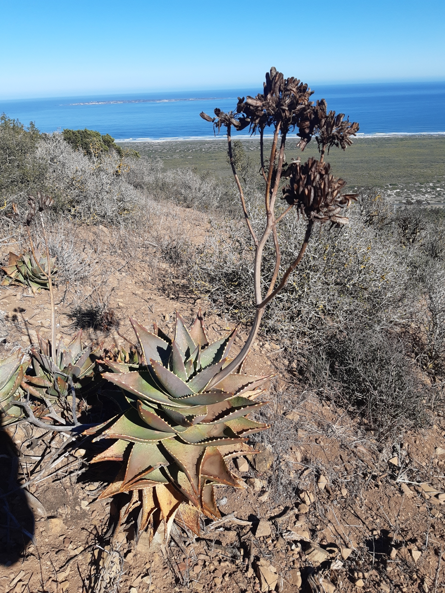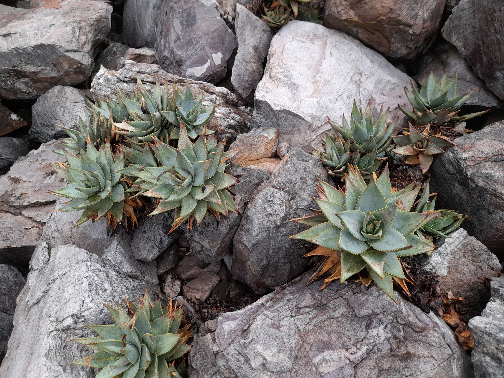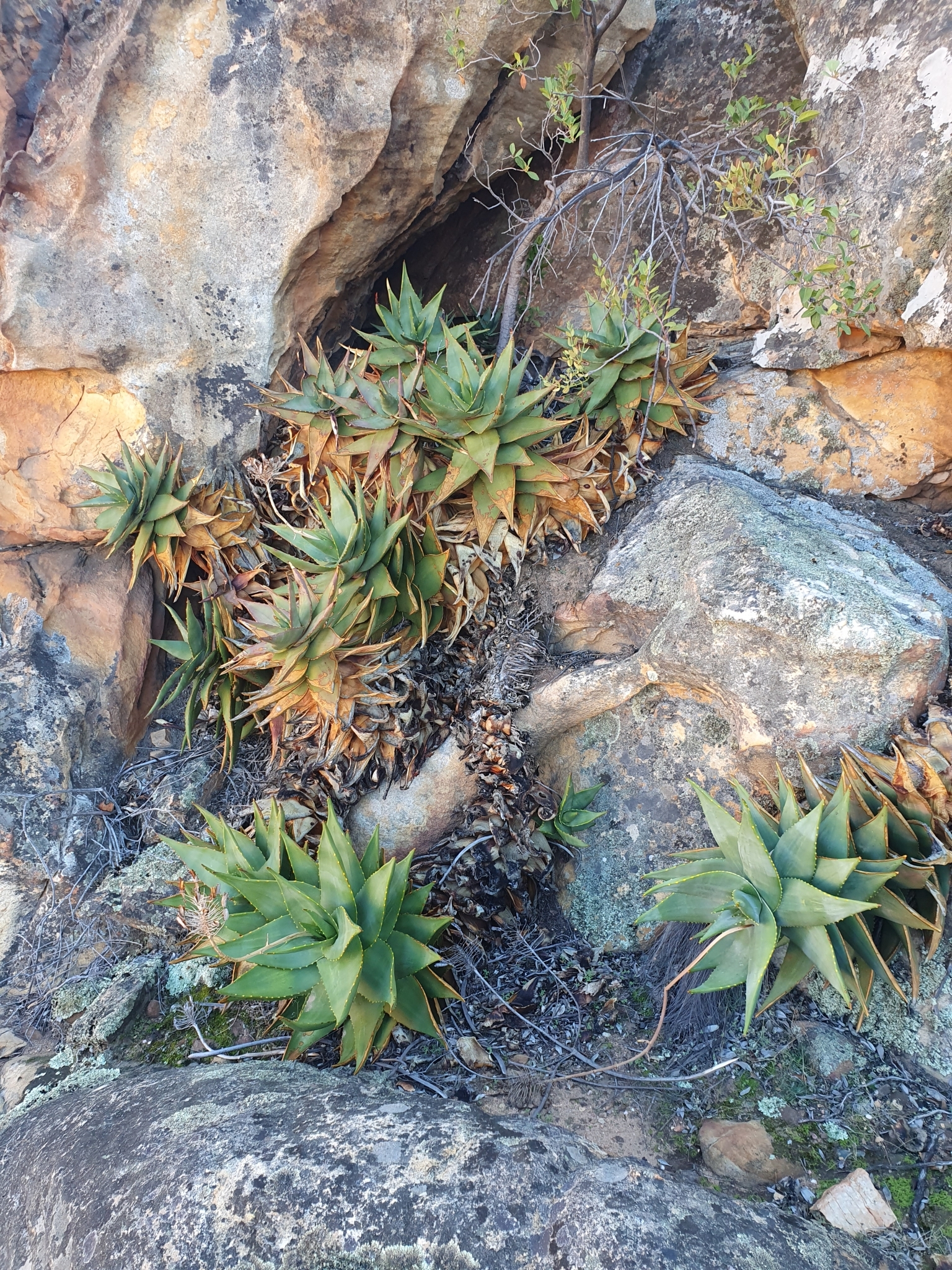 Aloe mitriformis主要分布在南非西开普省的沿海干旱地区,从开普敦半岛向东延伸至乔治(George)一带,海拔0-500米。该种生长在石英岩或砂岩坡地、岩石露头或灌木丛中,土壤贫瘠排水良好,年降雨量约300-600毫米,主要集中在冬季,夏季干旱高温。植株常出现在典型Fynbos和Renosterveld植被中,与其他南非多肉植物共生,形成局部生态系统。分布范围较广,但局部碎片化。