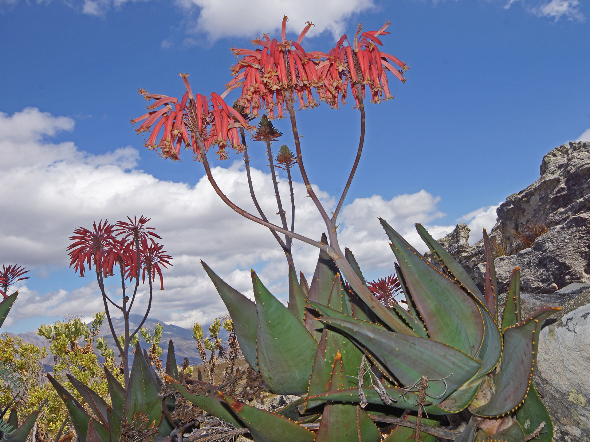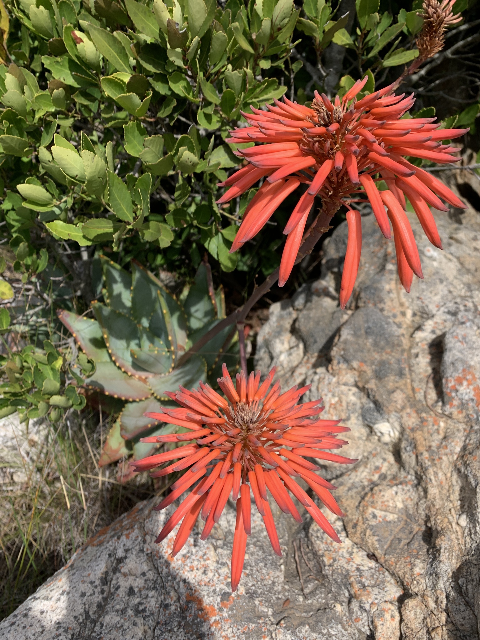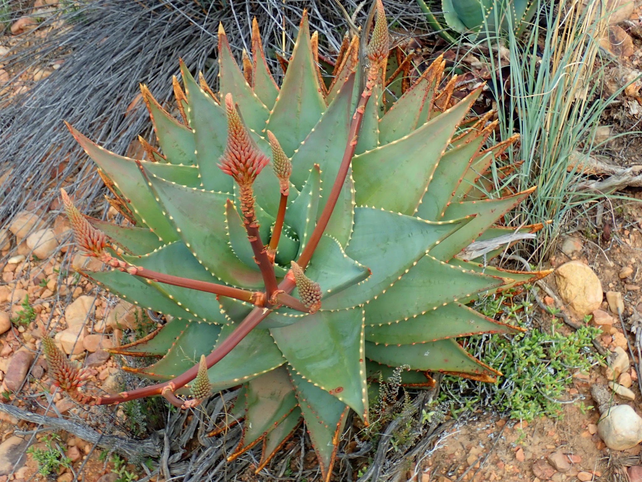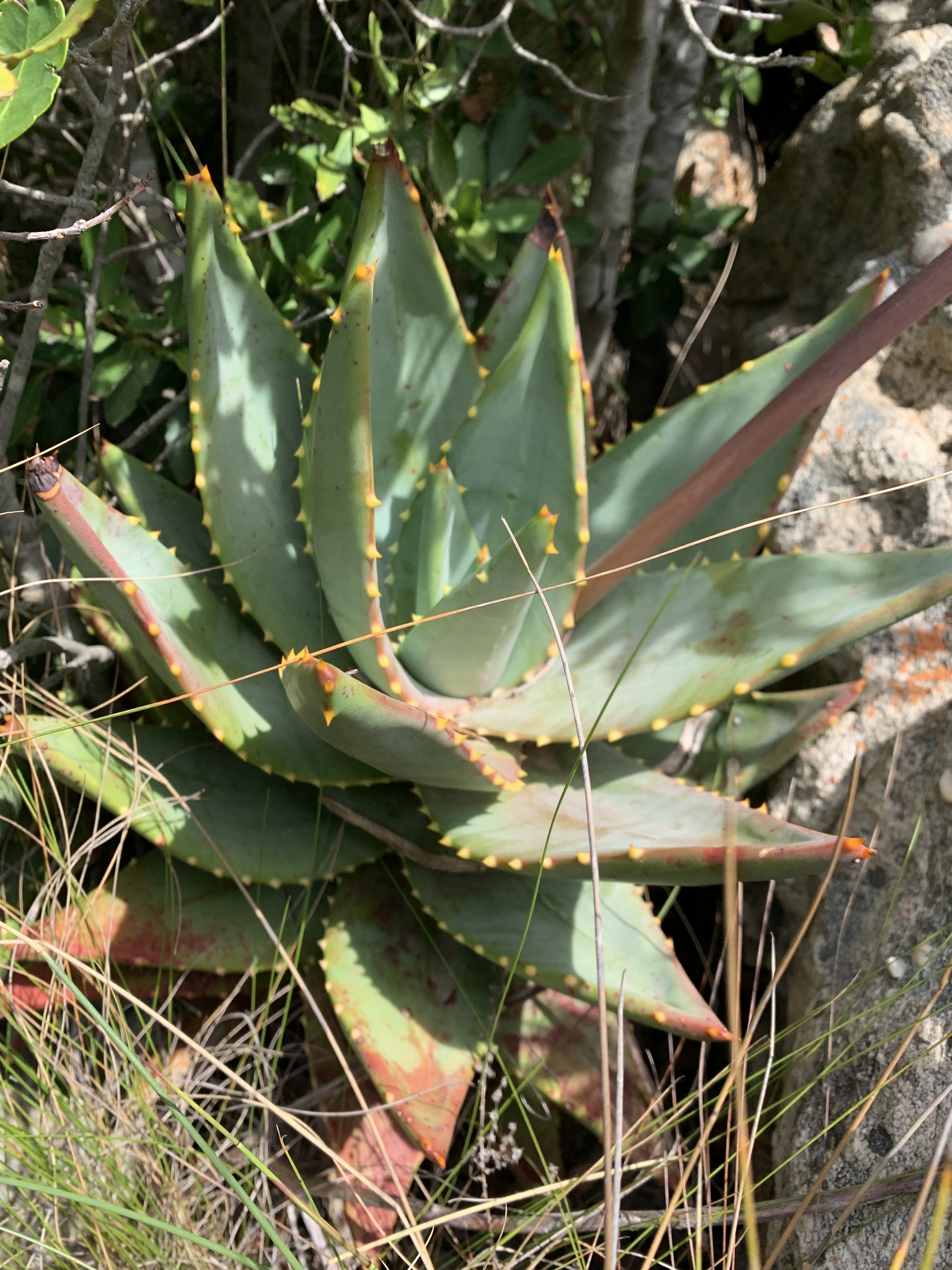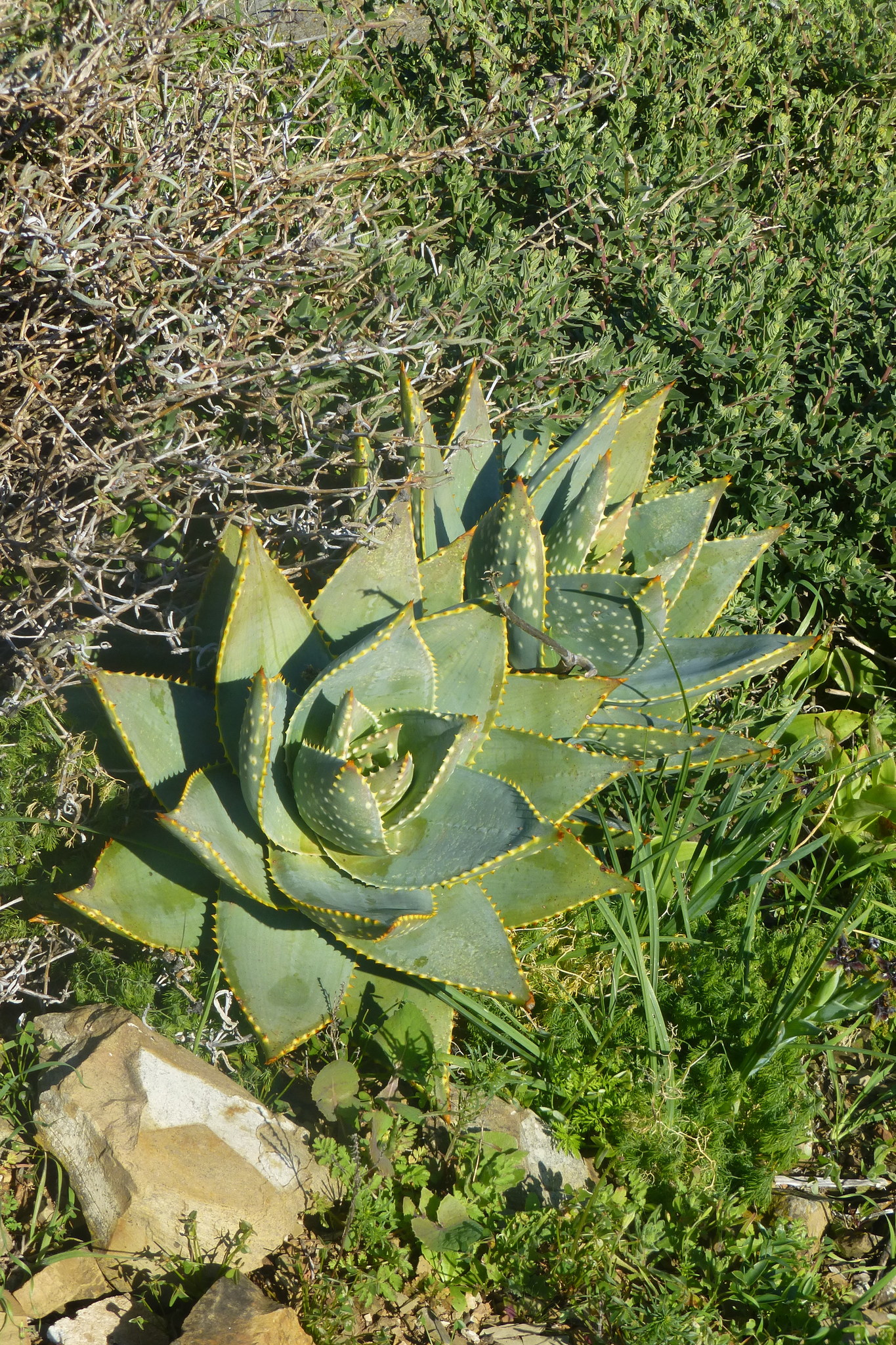 Aloe mitriformis主要分布在南非西开普省的沿海干旱地区,从开普敦半岛向东延伸至乔治(George)一带,海拔0-500米。该种生长在石英岩或砂岩坡地、岩石露头或灌木丛中,土壤贫瘠排水良好,年降雨量约300-600毫米,主要集中在冬季,夏季干旱高温。植株常出现在典型Fynbos和Renosterveld植被中,与其他南非多肉植物共生,形成局部生态系统。分布范围较广,但局部碎片化。