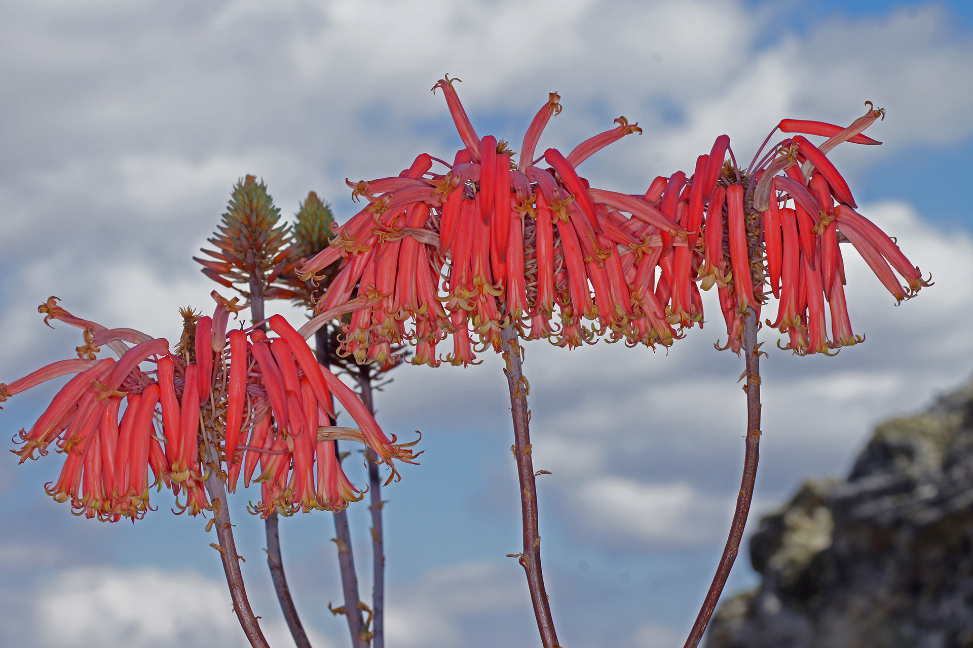 Aloe mitriformis通常为匍匐或攀援状灌木,成年植株高度约20-40厘米,但茎长可达1-2米,直径1-2厘米,常沿地面蔓延或攀附岩石,形成密集丛生。叶片三角形、肉质、柔软下垂,长8-15厘米(3-6英寸),宽2-4厘米(0.8-1.6英寸),深绿色至灰绿色,强光下呈红褐色;叶面光滑,偶尔有细小白斑;叶缘具白色软骨质齿,长约1-2毫米,间隔5-10毫米。叶片排列疏松于茎上。花序每枝1-3个短总状,高约30-45厘米(12-18英寸);花密集、鲜艳珊瑚红至橙红色,长约35毫米(1.4英寸),花被基部膨大呈“灯泡状”,花期主要为南半球冬季(5-8月),能大量吸引太阳鸟。果实为蒴果,种子有翅。植株整体生长迅速、耐修剪,变异性主要在叶色从绿到红褐,取决于光照和水分。