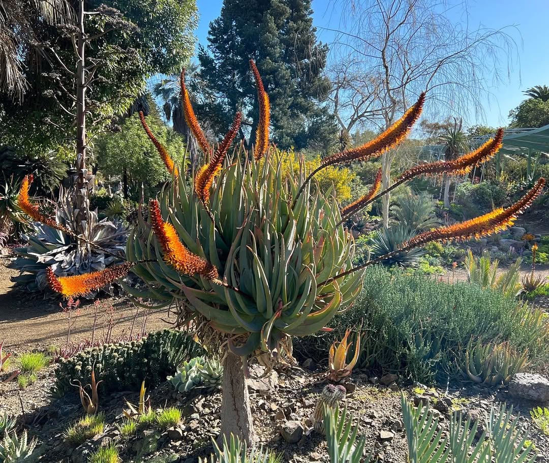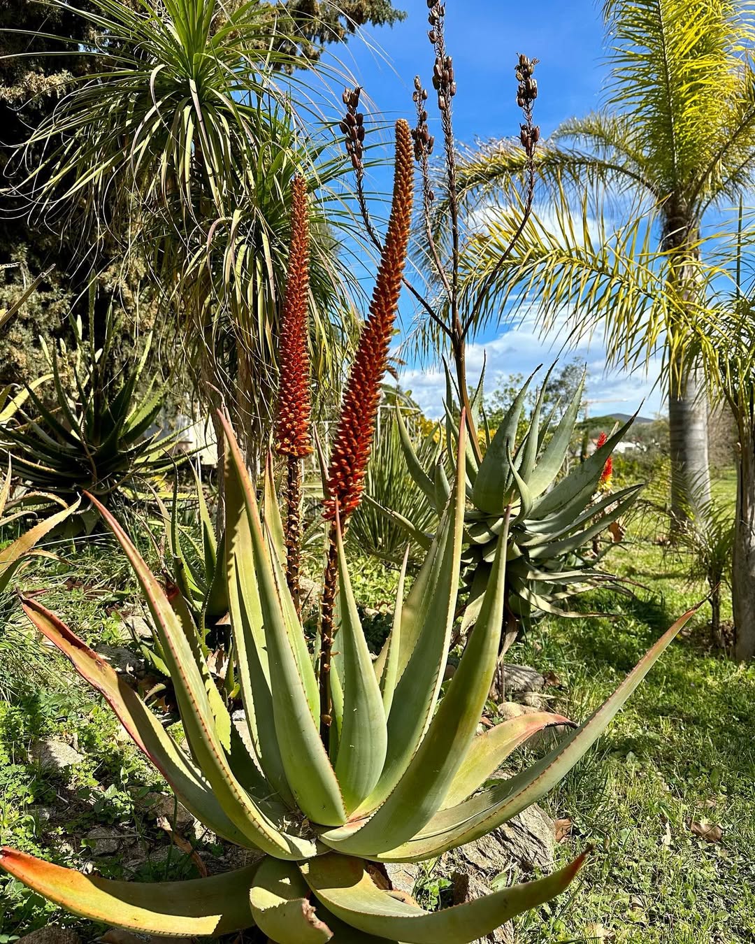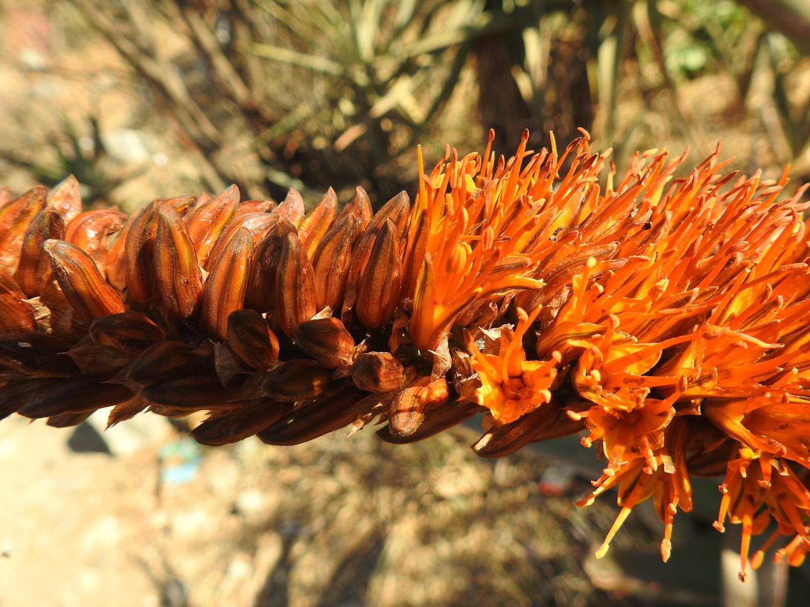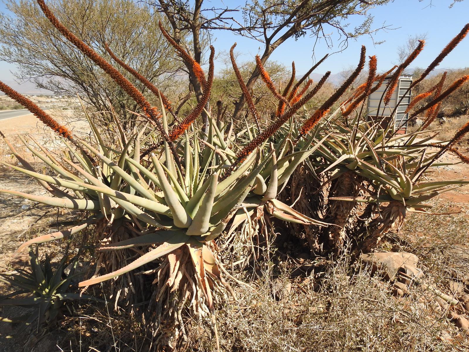 Aloe castanea通常为树状植物,高2.4-3.7米(偶达5米),茎单生或偶有分枝,直径约10-20厘米,常覆盖枯叶残留物以保护茎干。叶丛密集,约20-30片叶片,呈剑形,长达1-1.5米(3-5英尺),宽5-8厘米(2-3英寸),深绿色至灰绿色,在干旱或强光下呈红色调;表面光滑蜡质,无斑点;边缘有坚硬棕色齿,长约2-4毫米,间隔10-15毫米。叶片平展或略弯曲。花序多分枝,从叶丛顶部伸出,高约1-1.5米(3-5英尺),具许多狭窄圆柱形总状花序,长约20-30厘米(8-12英寸);花梗短;花朵深橙棕色至红色,长约2-3厘米(0.8-1.2英寸),管状密集排列成卷曲蛇形(如猫尾)。花期南半球冬季中期(约6-8月)。花蜜棕色。果实长圆形蒴果,长18-28毫米,直径10-15毫米,淡灰褐色;种子炭灰色,有翅。植株整体生长缓慢,长寿,不易分枝,变异性包括叶色从绿到红调,取决于环境。