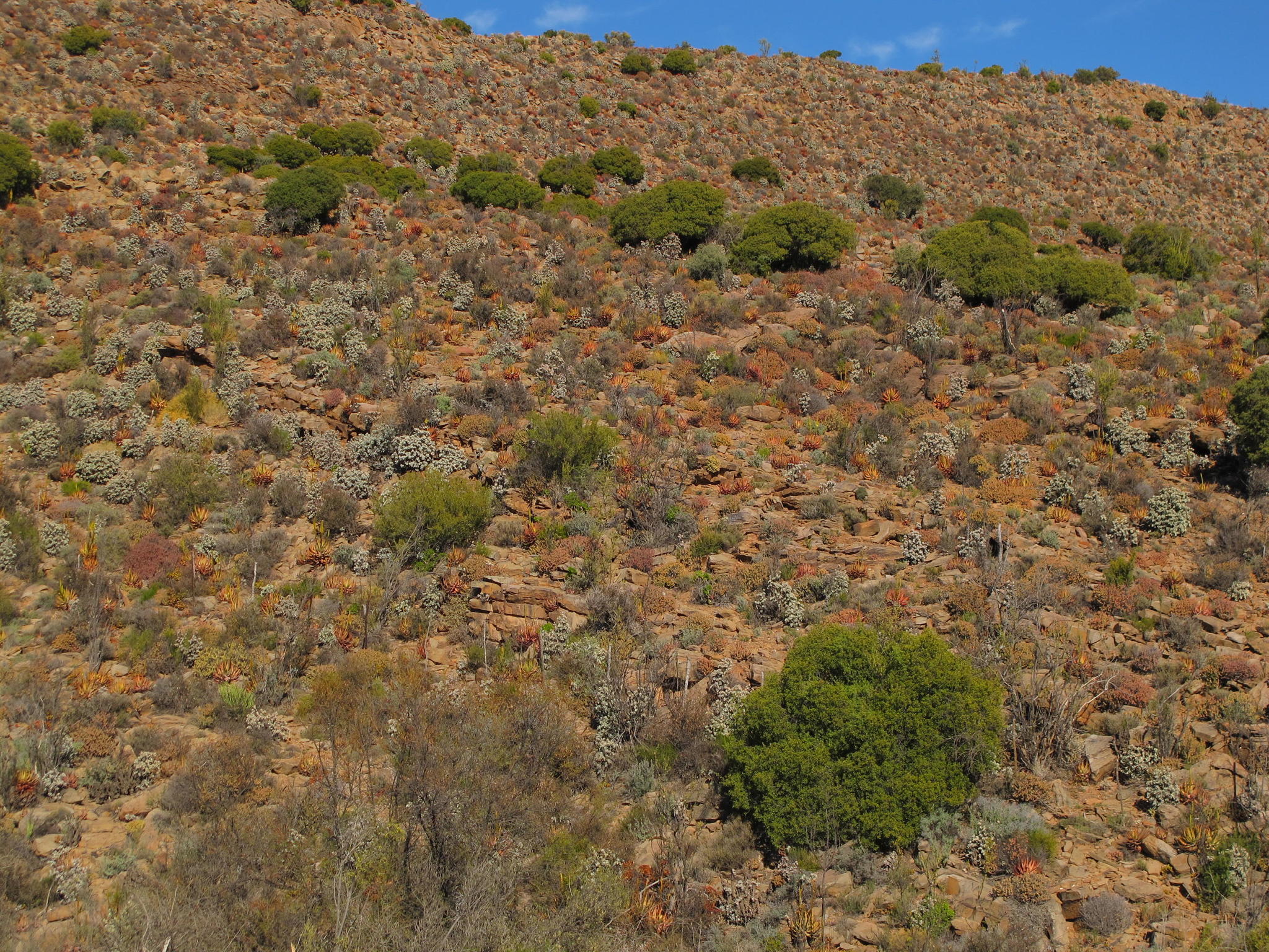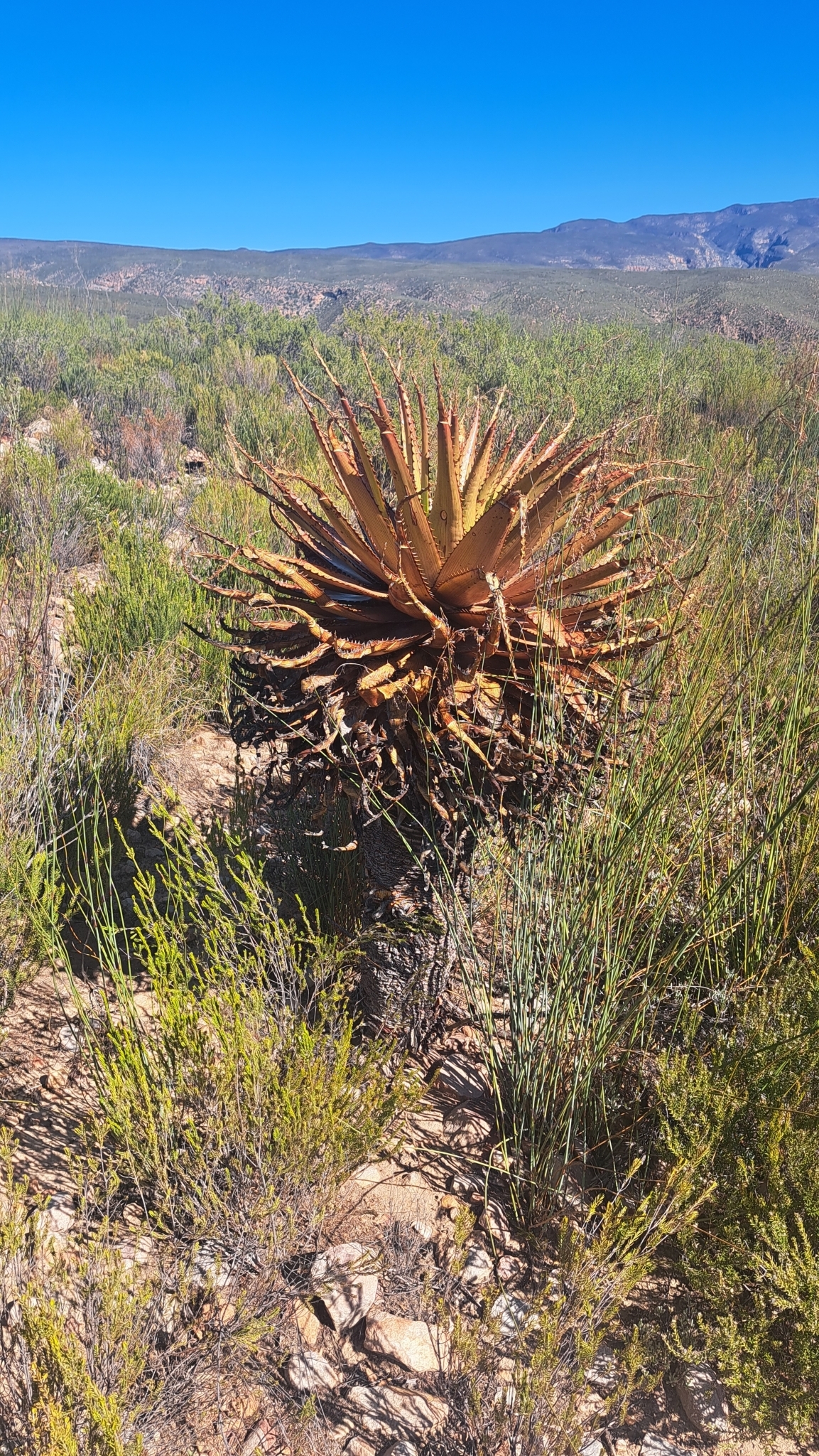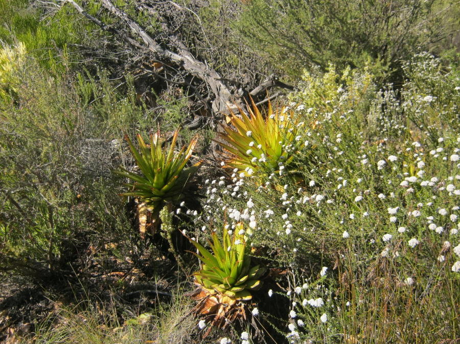 Aloe lineata var. muirii主要分布在南非西开普省的冬季雨区和小卡鲁,从Riversdale到Outeniqua山脉一带,海拔约200-800米。该种生长在岩石山坡、石质土壤或碎石区,阳光充足、排水良好,年降雨量约200-500毫米,主要集中在冬季,夏季干旱高温。植株常出现在开阔岩石露头或浅洼地,与其他卡鲁多肉植物共生,形成局部生态系统。分布范围较广,但局部碎片化。