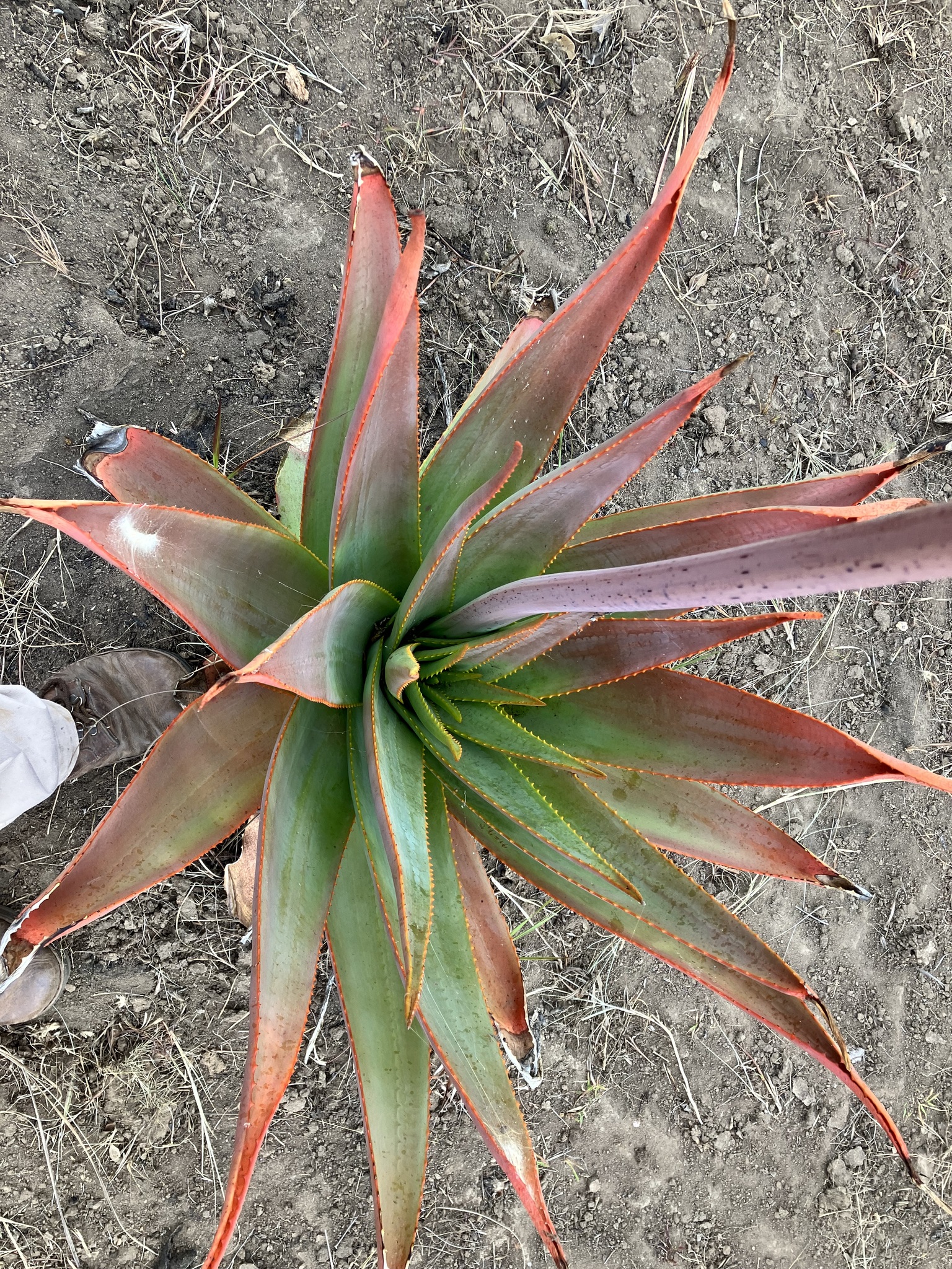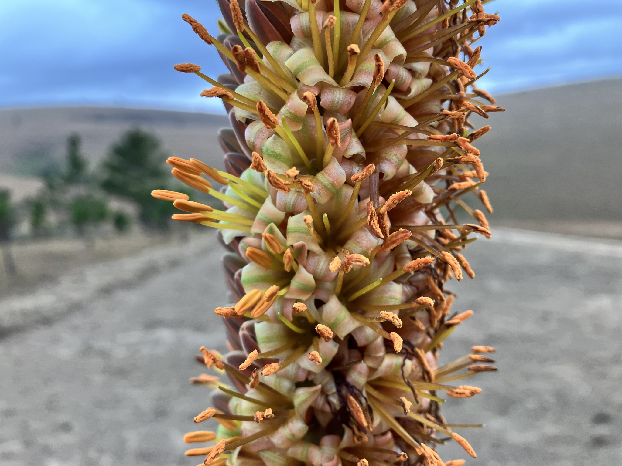 Aloe macroclada通常为无茎或极短茎的单生莲座状植物,成年植株高度约60-90厘米(2-3英尺),直径约60-90厘米(2-3英尺)。叶片约20-30片,宽阔肉质、蓝绿色至铜色调,长60-90厘米(2-3英尺),宽10-15厘米(4-6英寸),表面光滑蜡质,无斑点或偶有浅白色纹理;边缘有小而尖锐的棕色或红色牙齿,长约2-4毫米,间隔10-15毫米。叶片排列成密集莲座状,在干旱或强光下可能卷曲或呈红色调。叶汁干燥呈黄色。花序从叶丛中心伸出,高约60-100厘米,多分枝(可达5-10枝);总状花序圆柱形,长约20-30厘米(8-12英寸);花朵黄色,长约3-4厘米(1.2-1.6英寸),管状,密集排列。花期主要在南半球夏季(约12-2月)。果实为蒴果,长圆形,长约2厘米,直径1厘米;种子有翅。植株整体生长缓慢,长寿,变异性主要在叶色从蓝绿到铜红,取决于光照和水分。