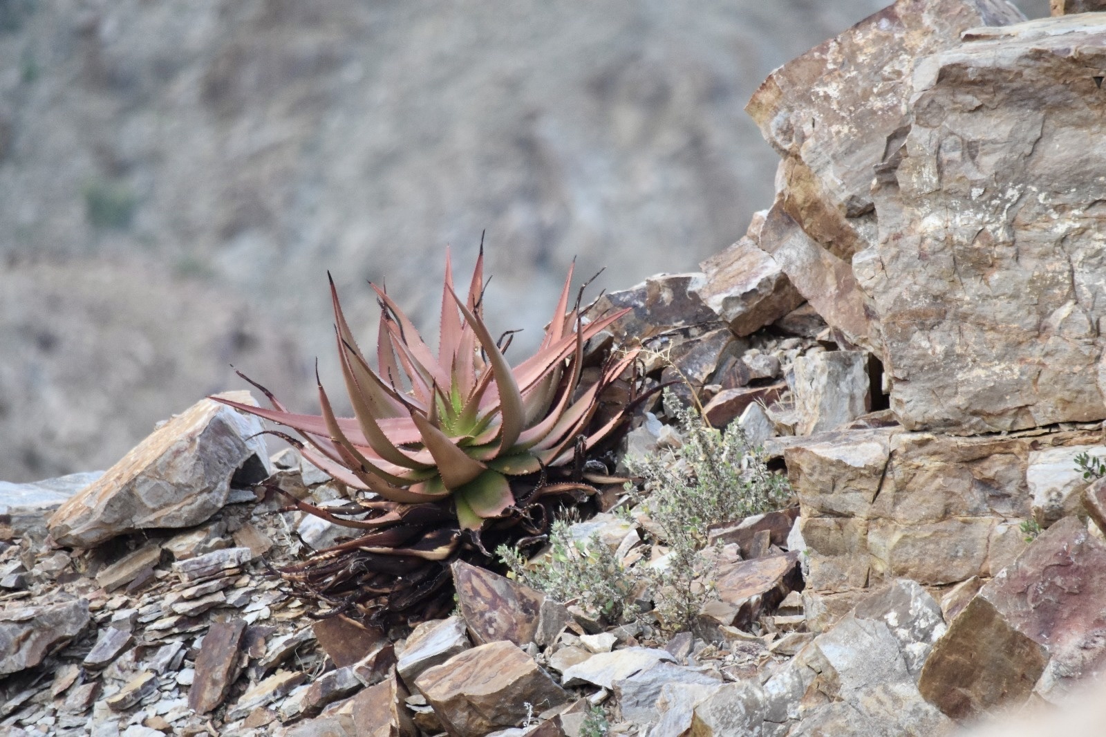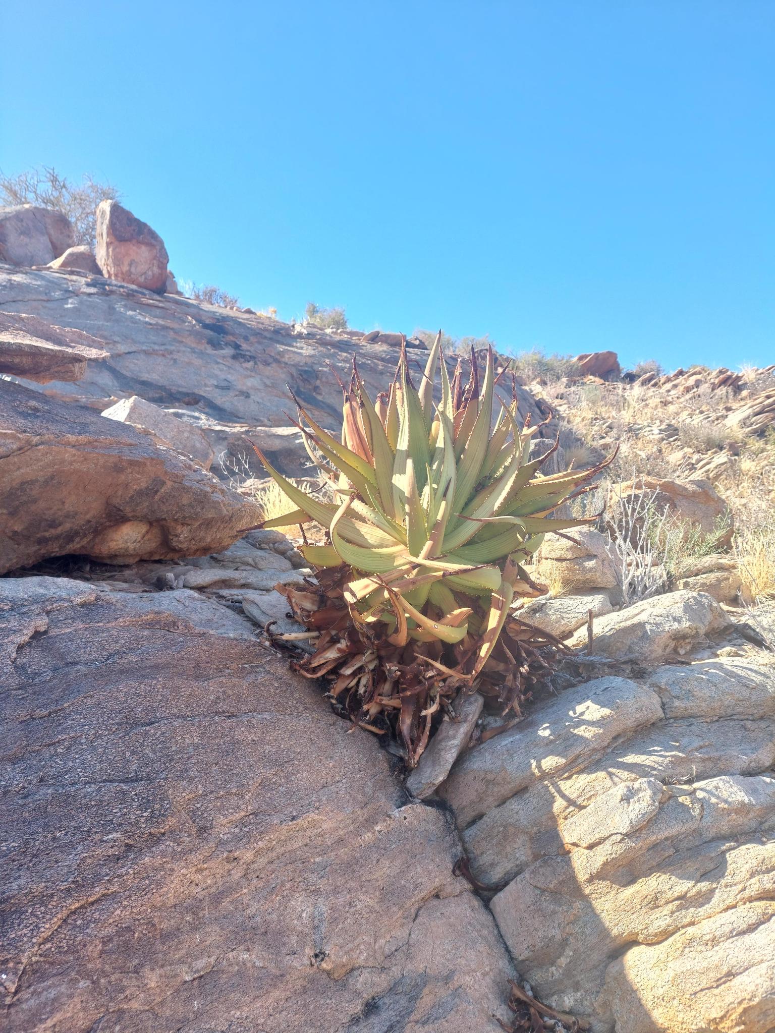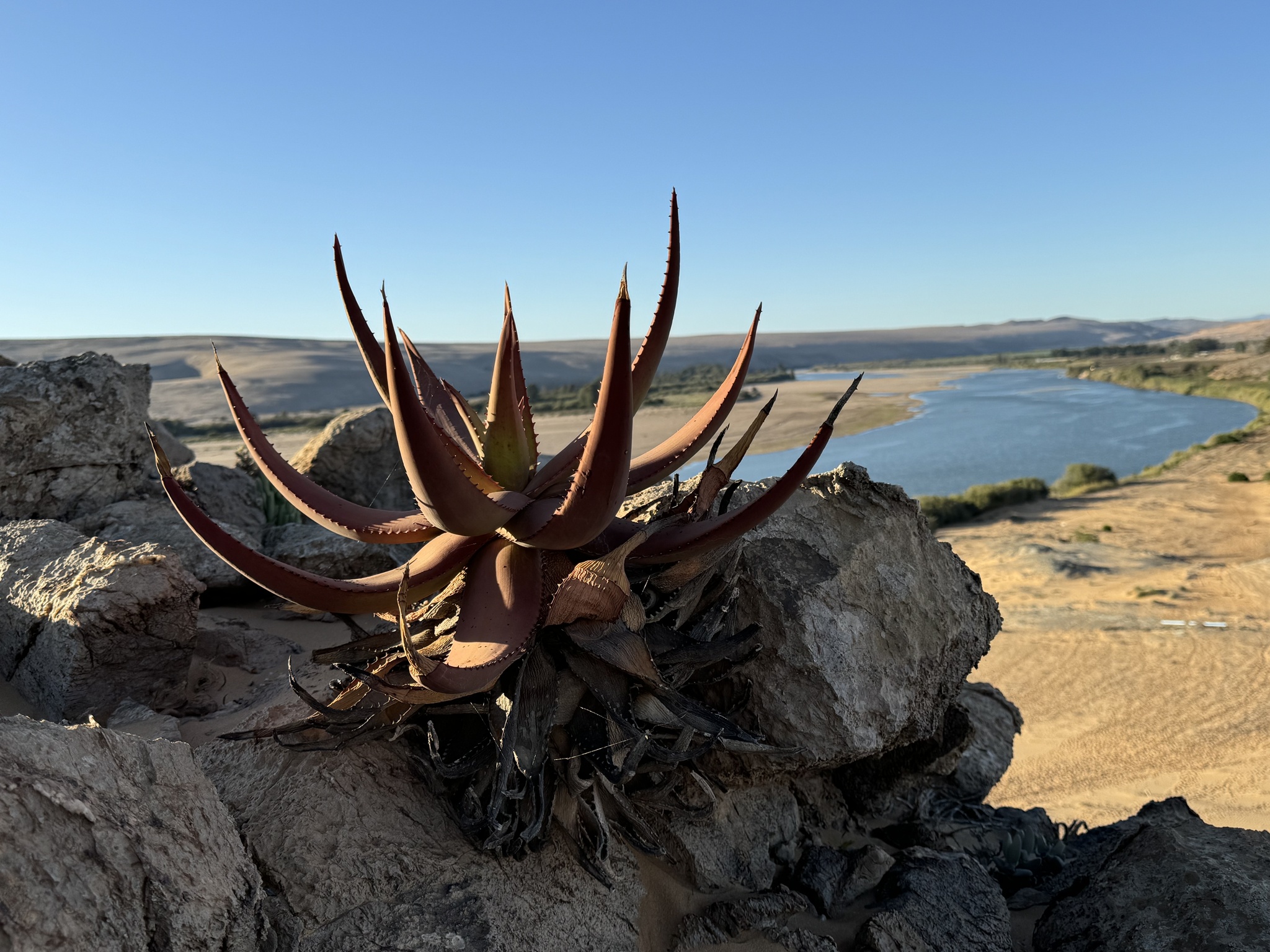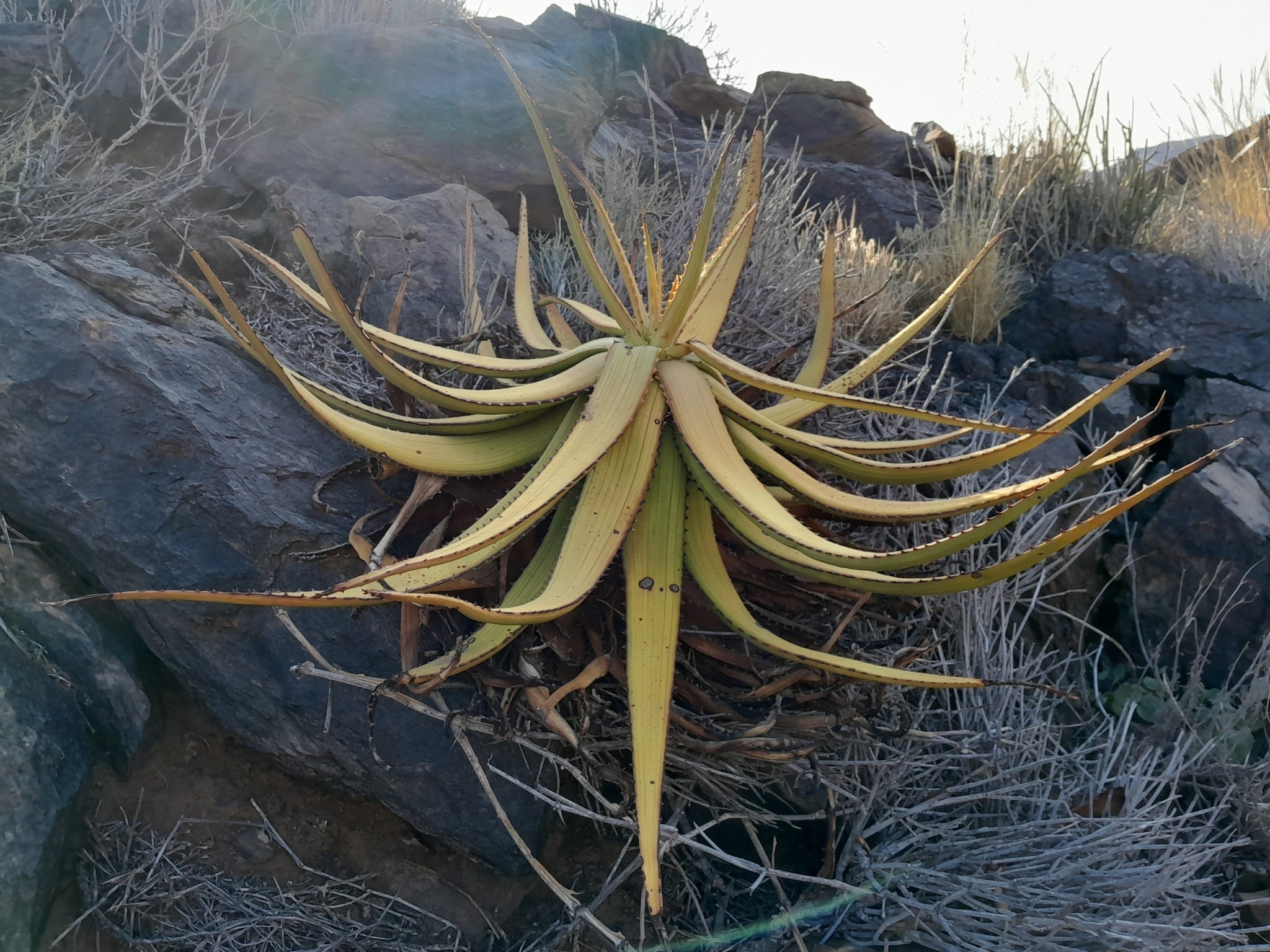 Aloe gariepensis主要分布在南非北开普省和纳米比亚南部的干燥地区,包括Orange River(Gariep River)下游两岸,从河口附近到Kakamas。该种生长在陡峭岩石坡地、岩石裂缝和小灌木保护下,海拔约100-500米,年降雨量约100-300毫米,主要集中在冬季,夏季干旱高温。土壤为石质或砂质,排水良好,常与Nama Karoo和Succulent Karoo植被共生,形成局部生态系统。分布范围狭窄,但局部丰度高,导致其对干扰敏感。