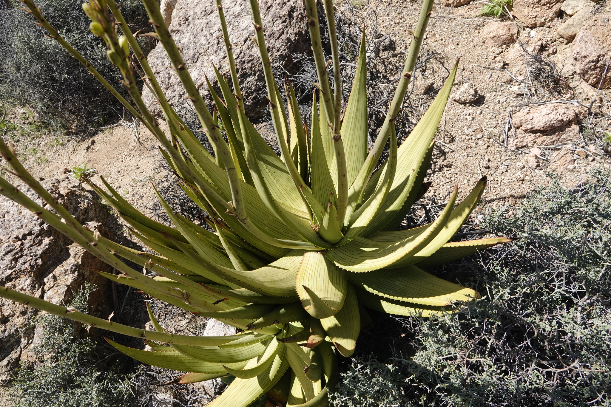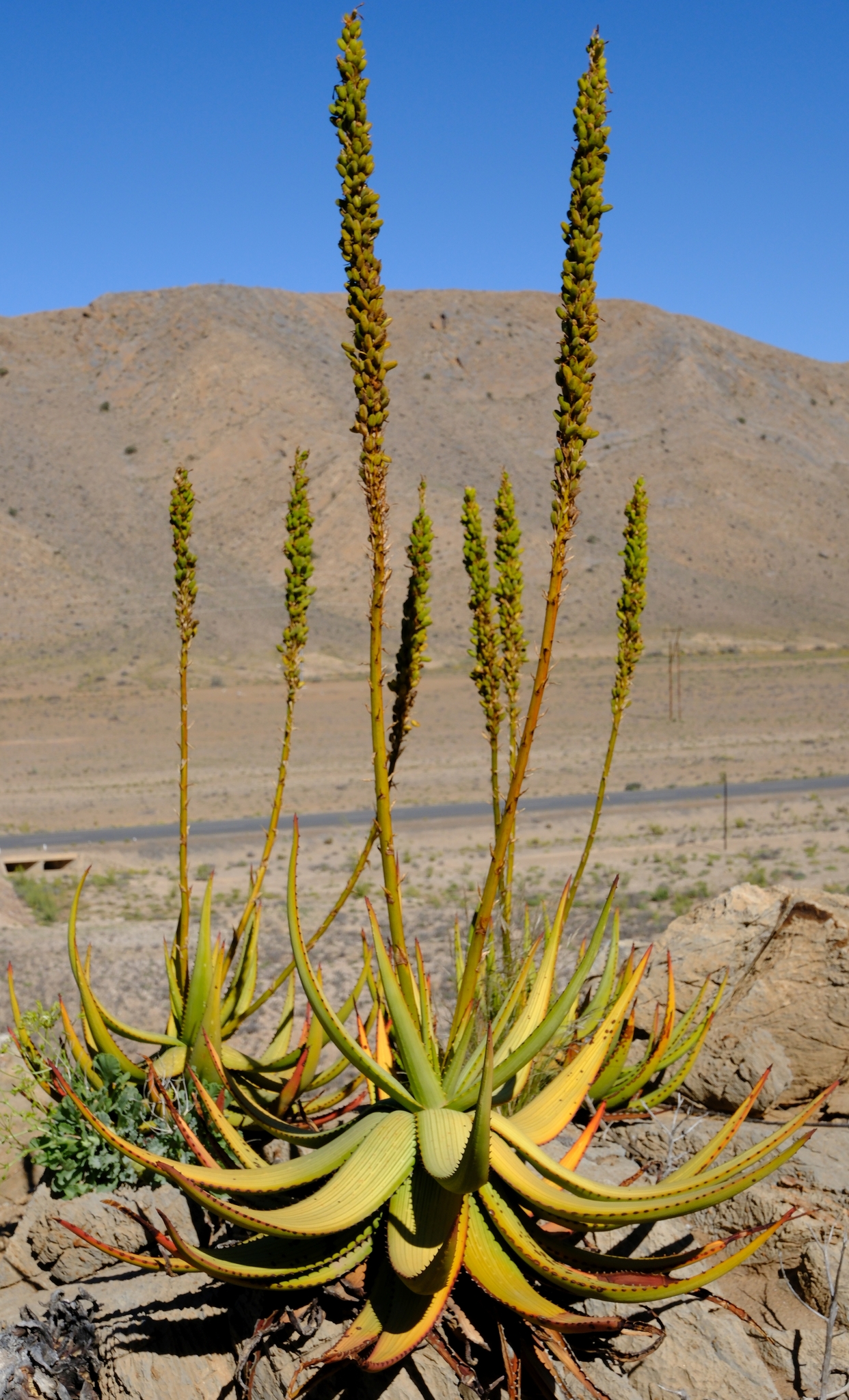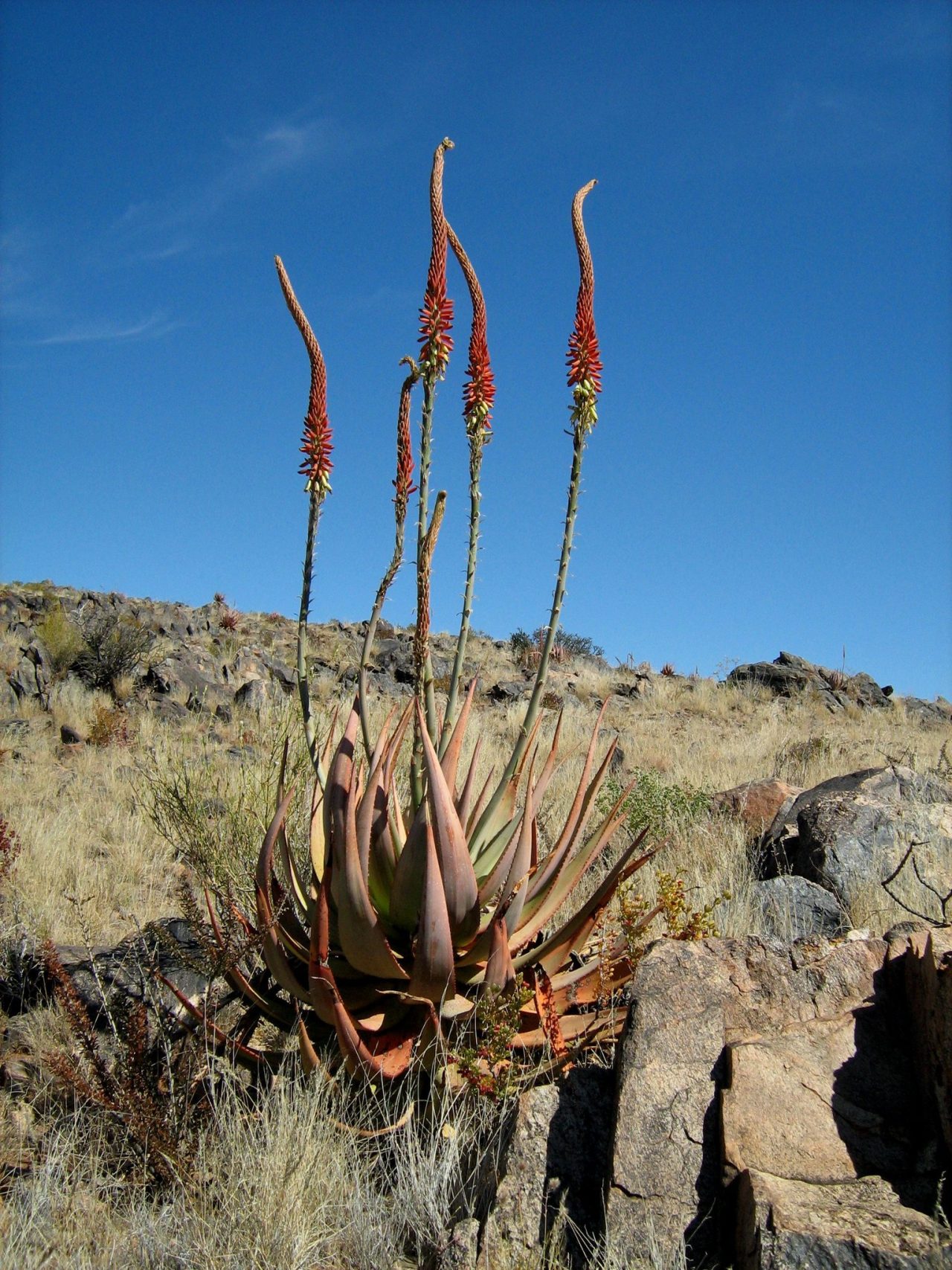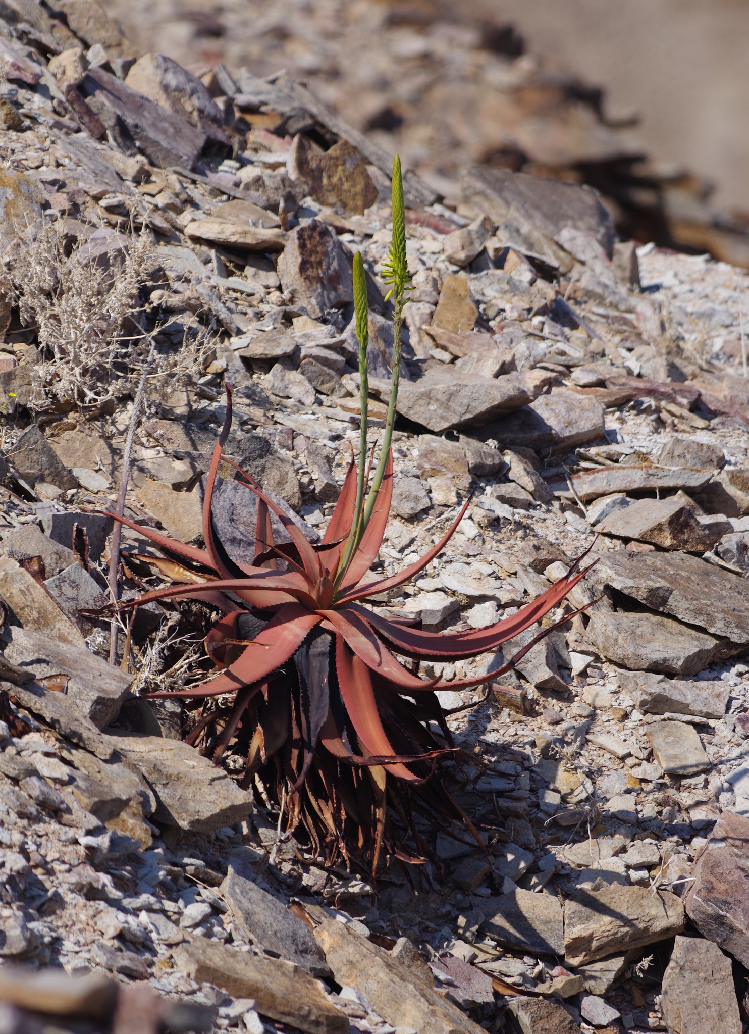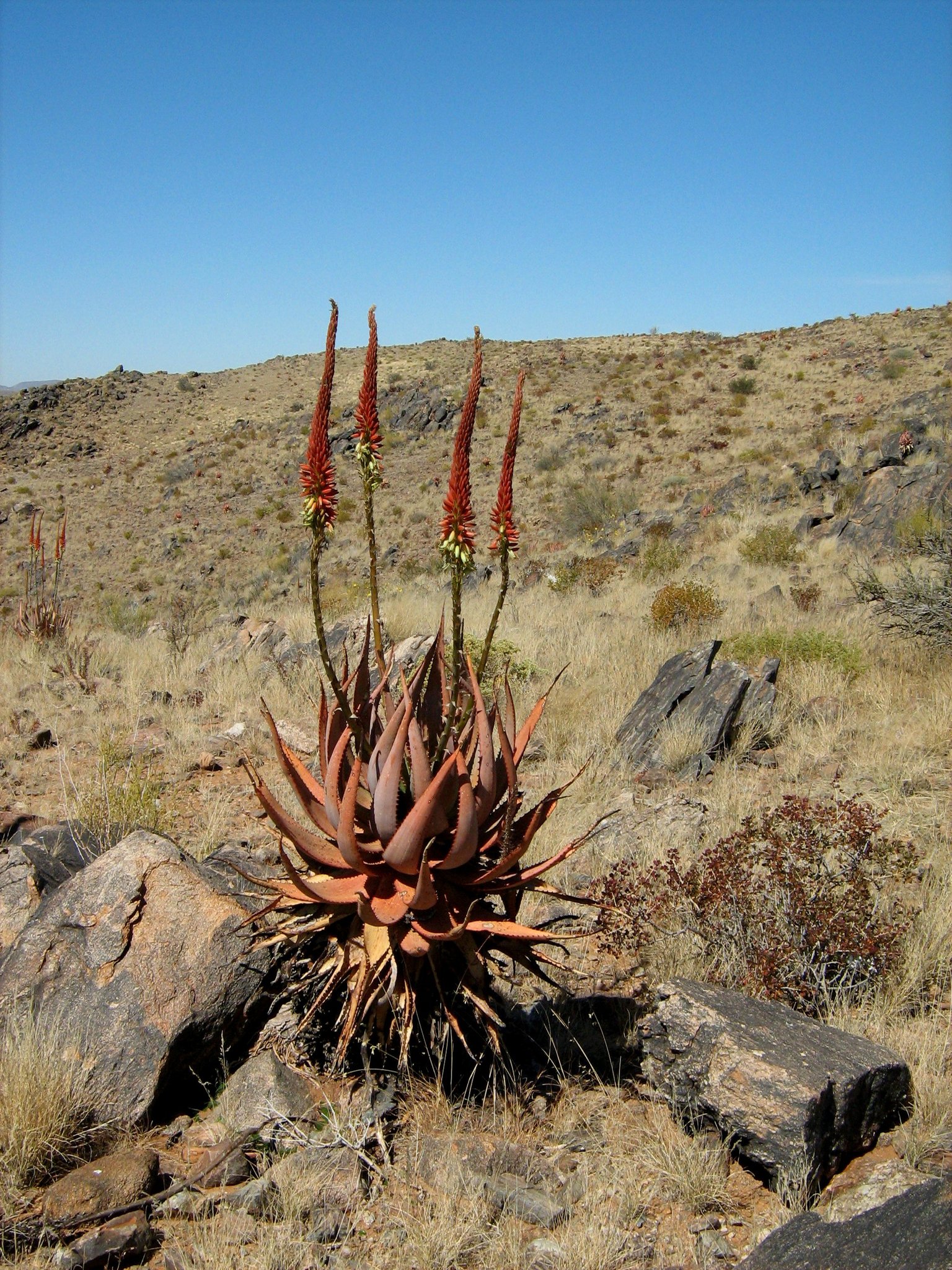 Aloe gariepensis主要分布在南非北开普省和纳米比亚南部的干燥地区,包括Orange River(Gariep River)下游两岸,从河口附近到Kakamas。该种生长在陡峭岩石坡地、岩石裂缝和小灌木保护下,海拔约100-500米,年降雨量约100-300毫米,主要集中在冬季,夏季干旱高温。土壤为石质或砂质,排水良好,常与Nama Karoo和Succulent Karoo植被共生,形成局部生态系统。分布范围狭窄,但局部丰度高,导致其对干扰敏感。