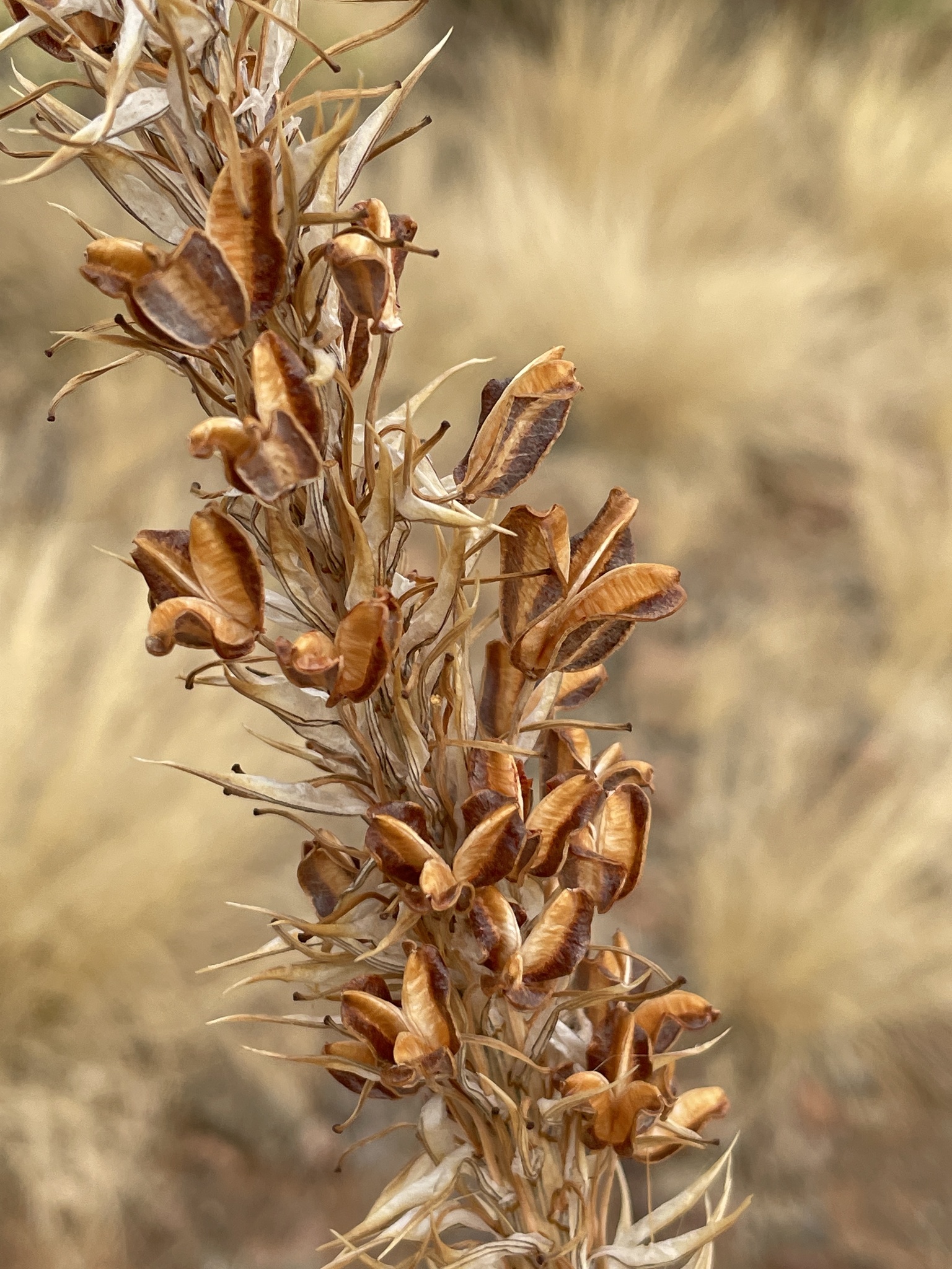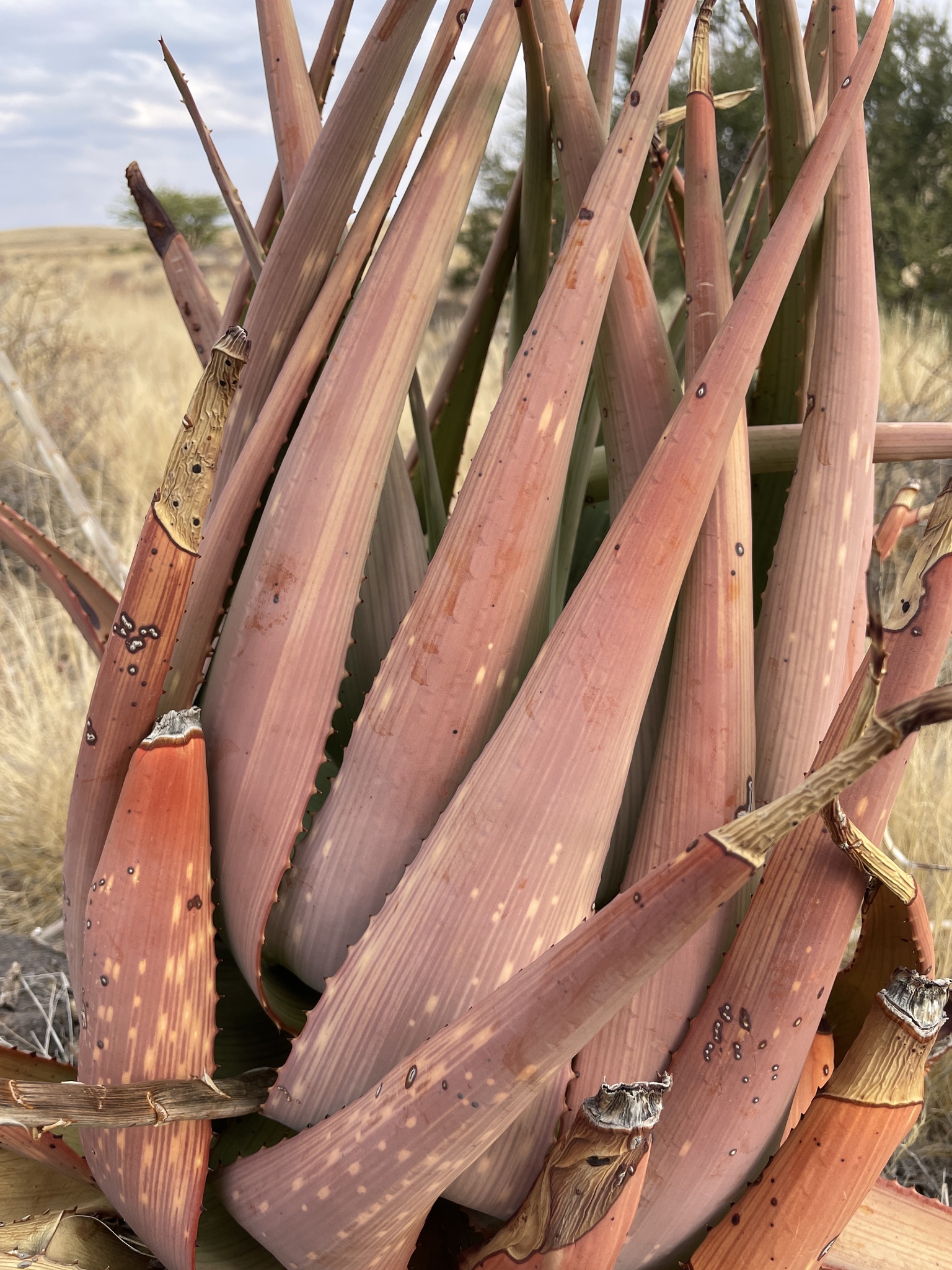 Aloe gariepensis通常为无茎或短茎(老株可达10-20厘米)的单生莲座状植物,直径约30-60厘米(12-24英寸),高度20-40厘米(8-16英寸)。叶片约15-25片,狭窄上弯(upcurved)、肉质厚实,长20-40厘米(8-16英寸),宽3-5厘米(1.2-2英寸),表面光滑蜡质,蓝绿色至灰绿色,无斑点;在强光或干旱下呈红色或粉红色调;边缘有薄薄的粉橙色软骨质边,有小而尖锐的红色齿刺,长约1-2毫米,间隔5-10毫米。叶片排列成开放的莲座状。花序多分枝(可达5-10枝),从叶丛中心伸出,高约60-100厘米(2-3英尺),平顶状;总状花序圆柱形,长约20-30厘米(8-12英寸);花朵橙黄色,长约3-4厘米(1.2-1.6英寸),管状,密集排列。花期主要在南半球春季和冬季(约3-5月和9-11月)。果实为蒴果,长圆形,长约2厘米,直径1厘米;种子有翅。植株整体生长缓慢,长寿,变异性主要在叶色从蓝绿到红粉,取决于光照和温度。