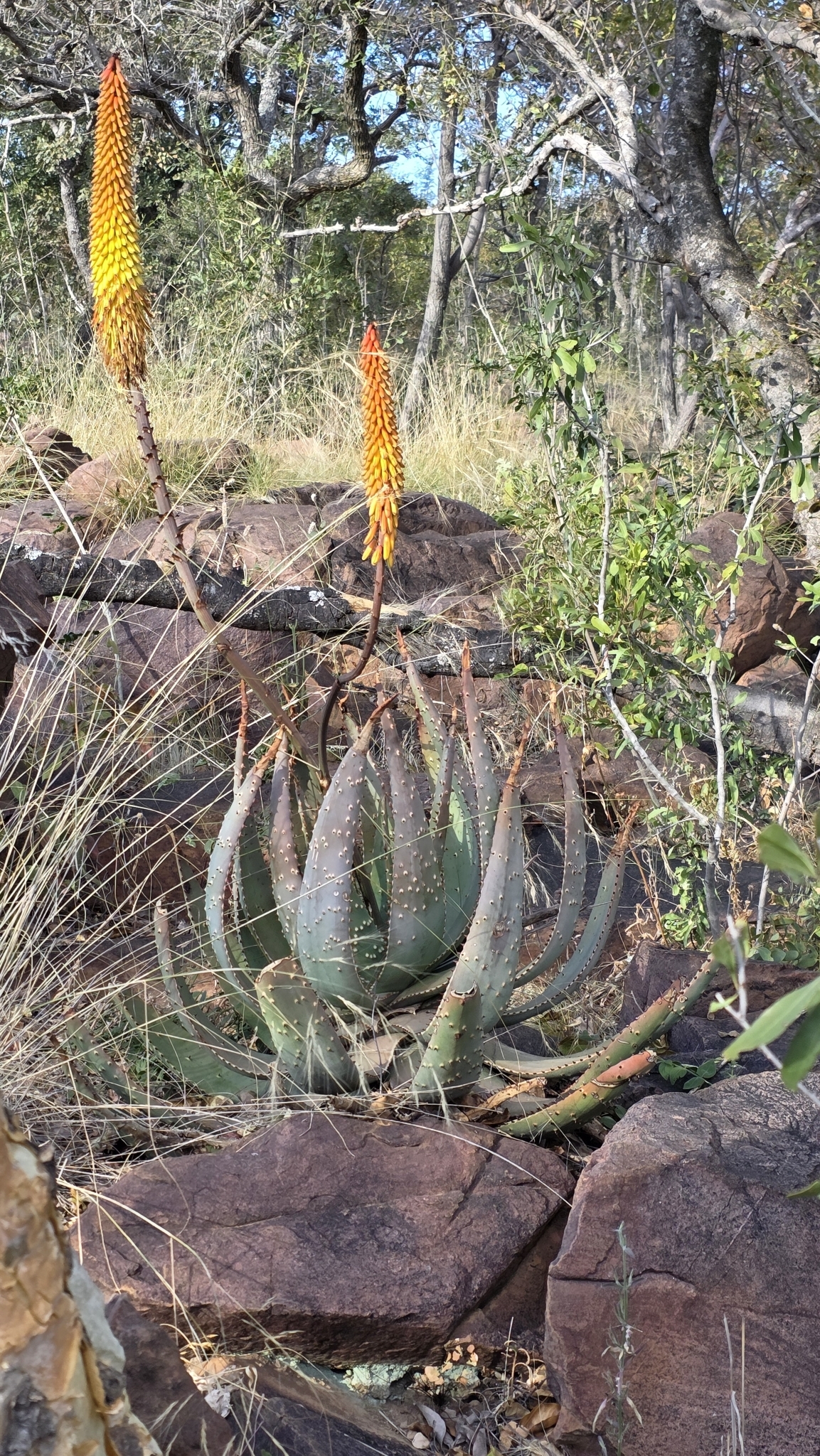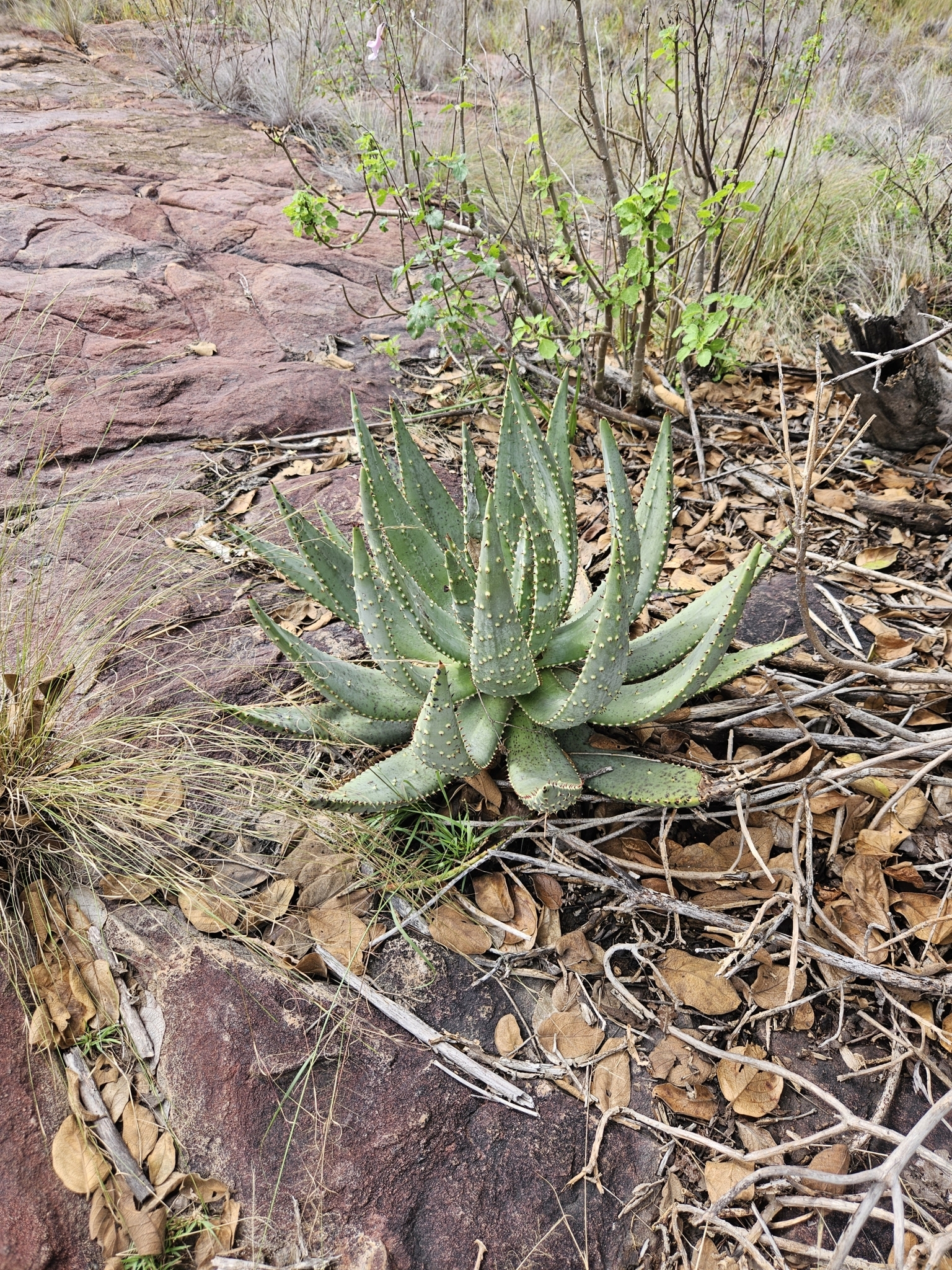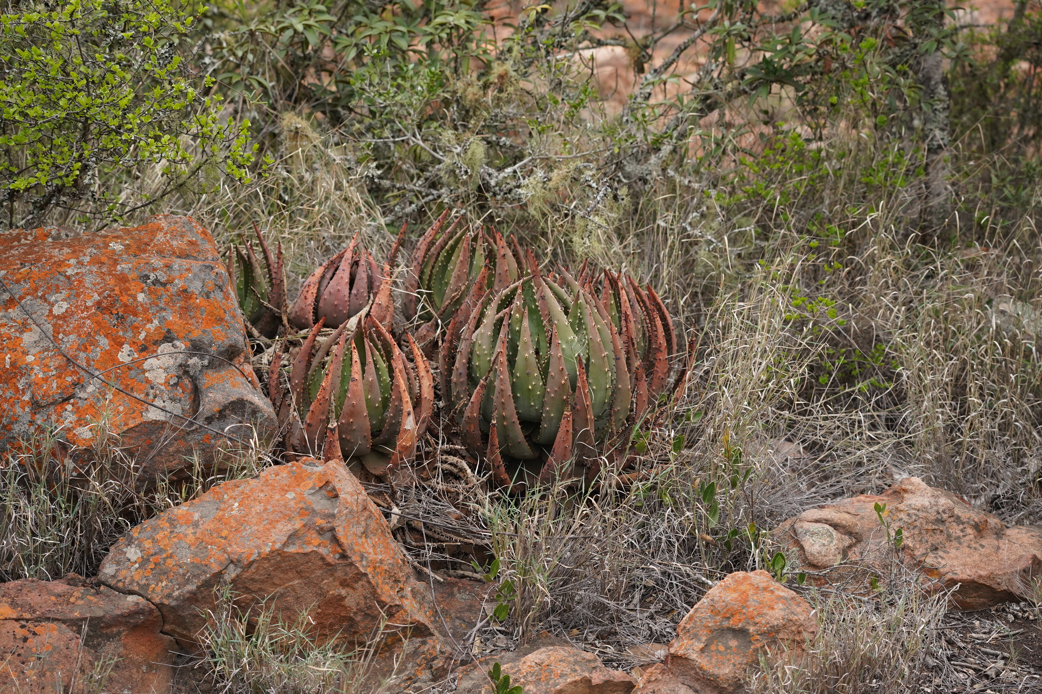 Aloe aculeata主要分布在南非Limpopo省和Mpumalanga省北部、津巴布韦南部和中部以及莫桑比克的部分地区,海拔500-1700米。该种生长在岩石区域、开阔bushveld或草原中,阳光充足、排水良好,年降雨量约500-800毫米,主要集中在夏季,旱季漫长高温。土壤为石质或砂质,常与灌木丛伴生,形成局部生态系统。分布范围碎片化,但局部丰度高,导致其对干扰敏感。