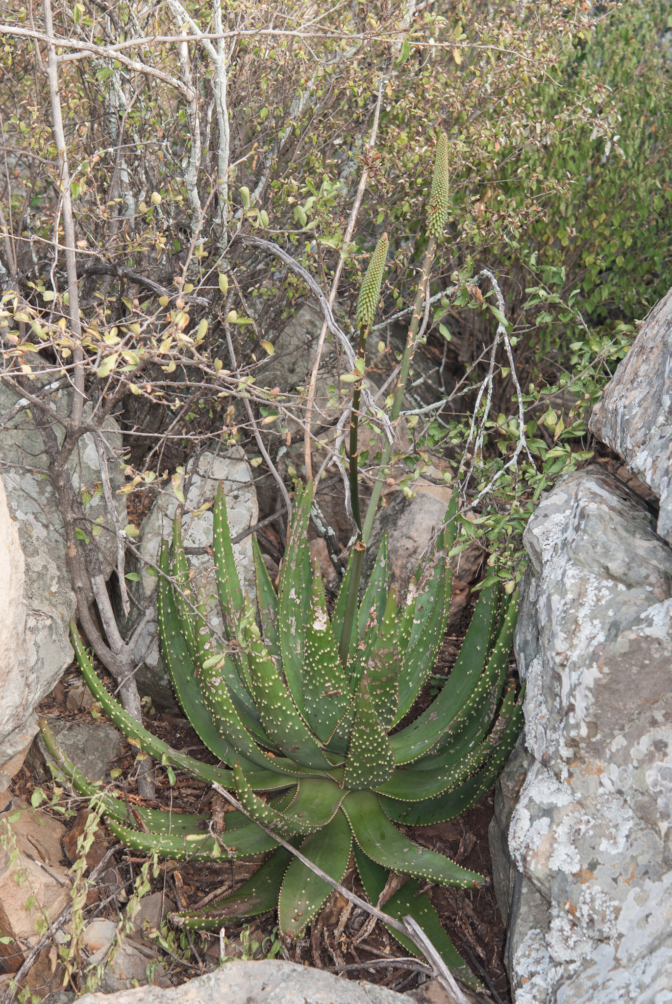 是一种南部非洲特有芦荟属植物,原产于南非(Limpopo省和Mpumalanga省北部)、津巴布韦南部和中部以及莫桑比克的部分地区。它是一种中型、单生或偶有分枝的莲座状多肉植物,以其棘刺覆盖的叶片和冬季火红色花序而闻名。该物种于1931年由Gilbert Westacott Reynolds首次描述,种名“aculeata”源自拉丁语,意为“有刺的”,描述了其叶面上的棘刺特征。作为一种草原和灌木丛适应植物,它生长在岩石区域和开阔bushveld中,适合作为观赏芦荟栽培,尤其在旱景花园中,但野生种群易受栖息地破坏影响,已被评估为无危