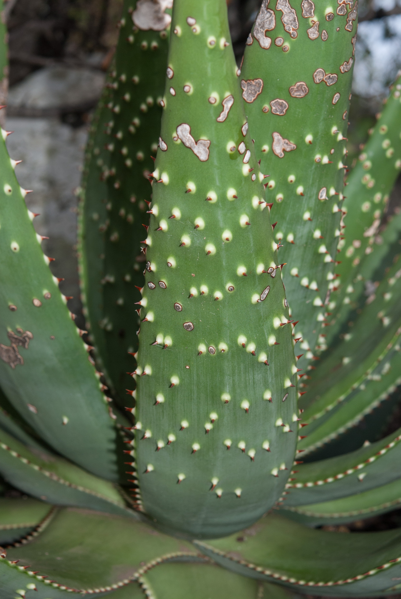 Aloe aculeata通常为无茎或短茎(老株可达20-30厘米)的单生莲座状植物,直径约30-60厘米(12-24英寸),高度20-40厘米(8-16英寸)。叶片约15-25片,宽阔平展、肉质厚实,长20-50厘米(8-20英寸),宽5-10厘米(2-4英寸),表面光滑蜡质,深绿色至灰绿色,具棘刺(spines)覆盖叶面和叶背;边缘有红色齿刺,长约2-4毫米,间隔5-10毫米。叶片排列成开放的莲座状,在强光或干旱下呈红色调。花序多分枝,从叶丛中心伸出,高约60-100厘米(2-3英尺);总状花序圆柱形,长约20-30厘米(8-12英寸);花朵火红色,长约3-4厘米(1.2-1.6英寸),管状,密集排列成火炬状,如红热扑克。花期主要在南半球冬季(约6-8月)。果实为蒴果,长圆形,长约2厘米,直径1厘米;种子有翅。植株整体生长缓慢,长寿,变异性主要在叶色从绿到红,取决于光照和温度。