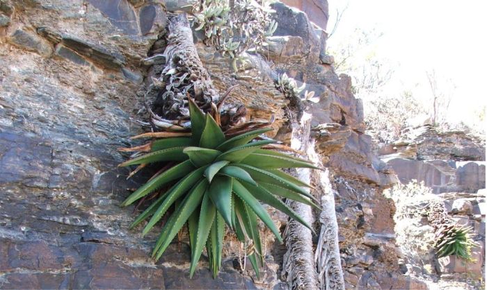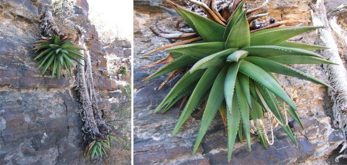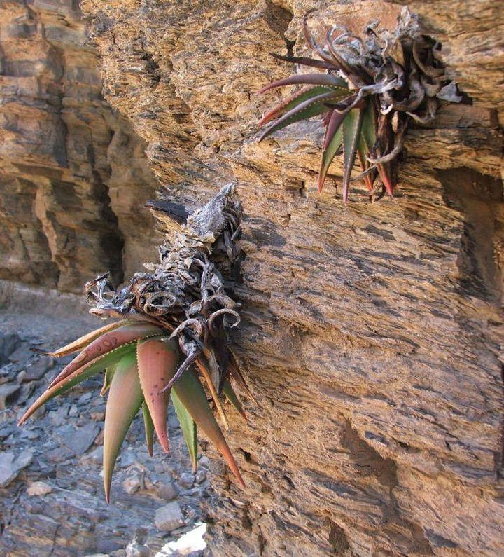 Aloe pavelkae主要分布在纳米比亚南部的Hunsberge下奥兰治河谷,局限于上坡悬崖,生长在Kuibis和Schwarzrand子群(Nama Group)的石英砂岩悬崖上,海拔700-800米。该种生长在干燥的热带生物群落中,常出现在陡峭南向或东向坡面上,土壤贫瘠排水良好,年降雨量约50-125毫米,主要集中在秋季至春季(雷阵雨和冬季气旋雨),夏季温度约26°C,冬季凉爽,受西海岸雾影响,无霜冻。植株对排水要求极高,避免积水;它常与伴生多肉植物如Conophytum ricardianum、Crassula macowaniana、Tylecodon bruynsii等共生,形成局部微生态系统。分布范围狭窄,总面积估计不到500平方公里,导致其对栖息地干扰敏感。
